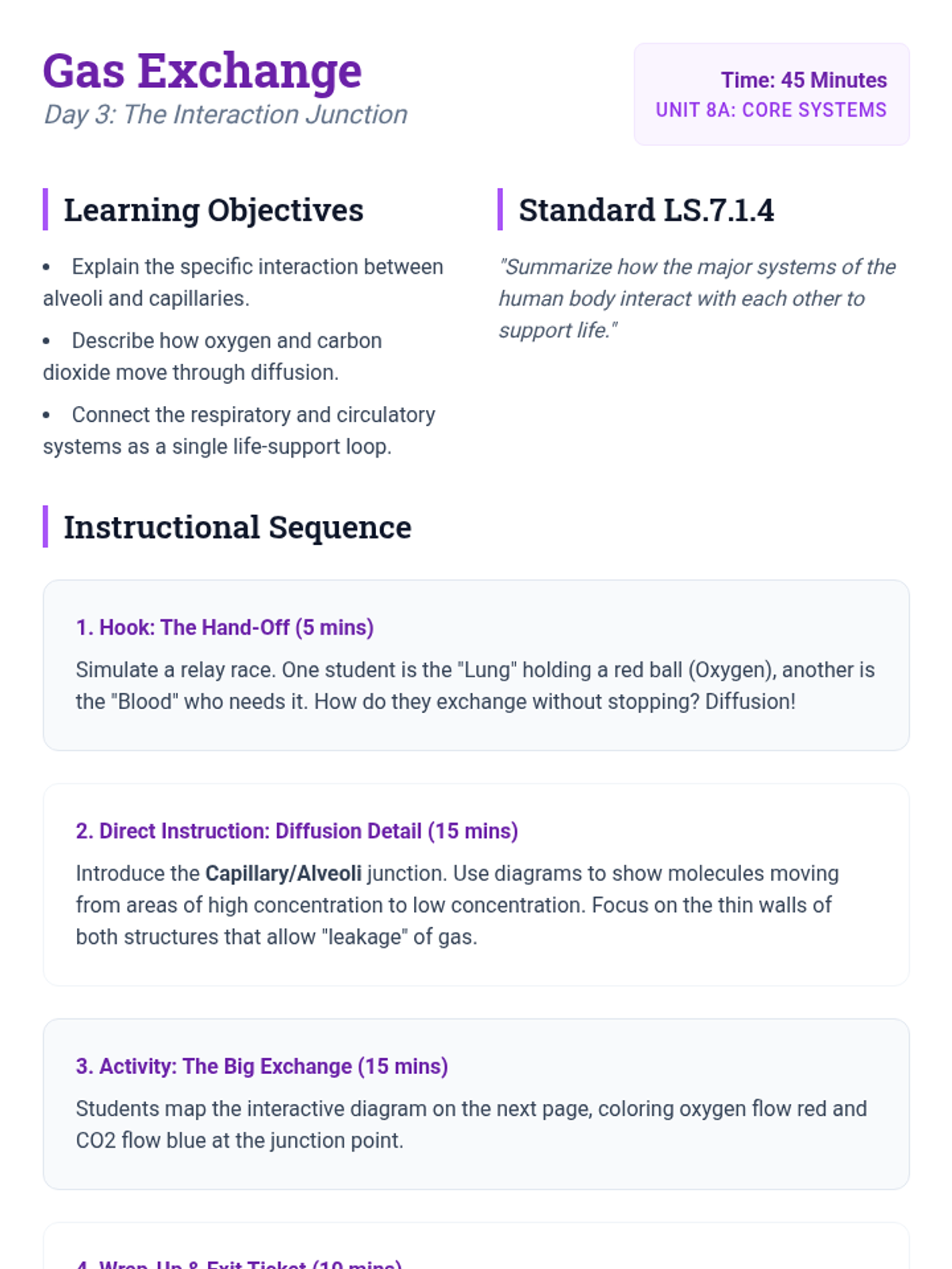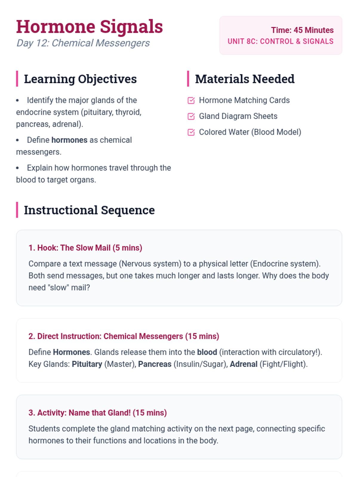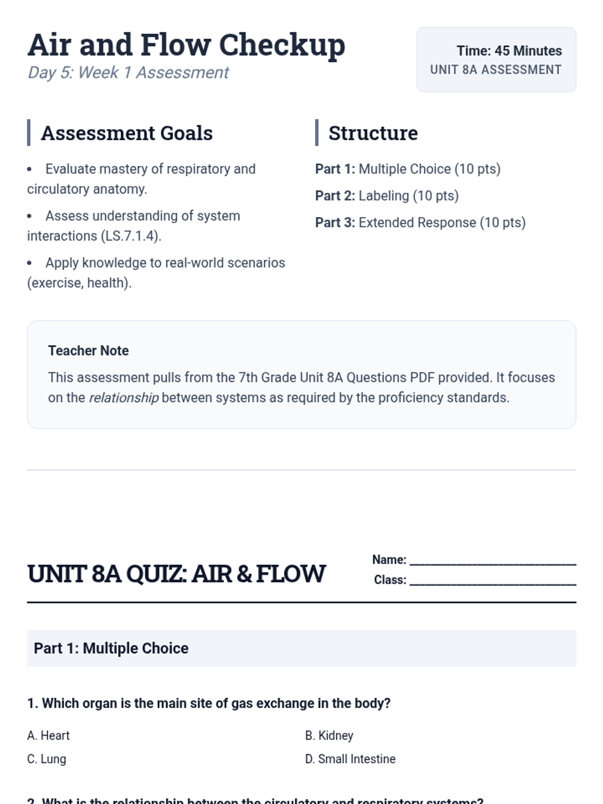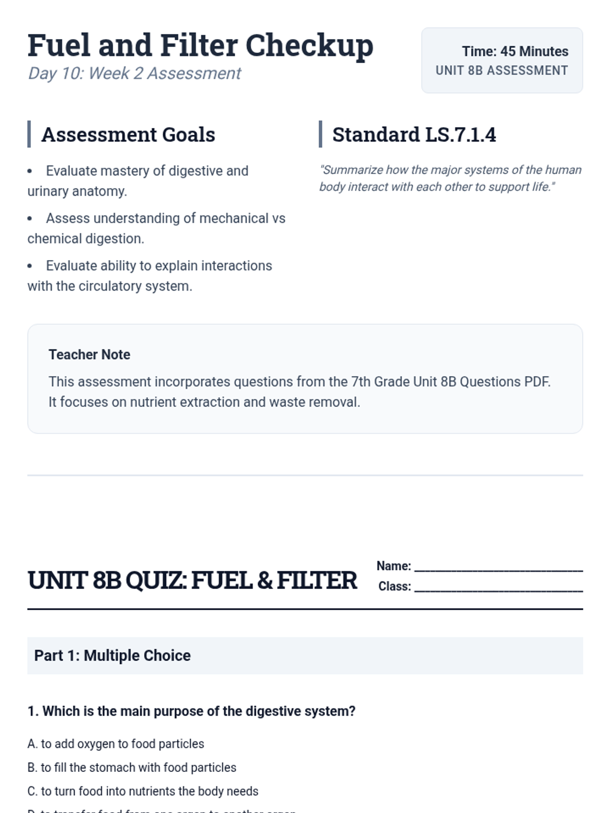 A comprehensive 15-day curriculum unit for 7th-grade science exploring the circulatory, respiratory, digestive, urinary, nervous, and endocrine systems, with a focus on how they interact to support life and maintain homeostasis.