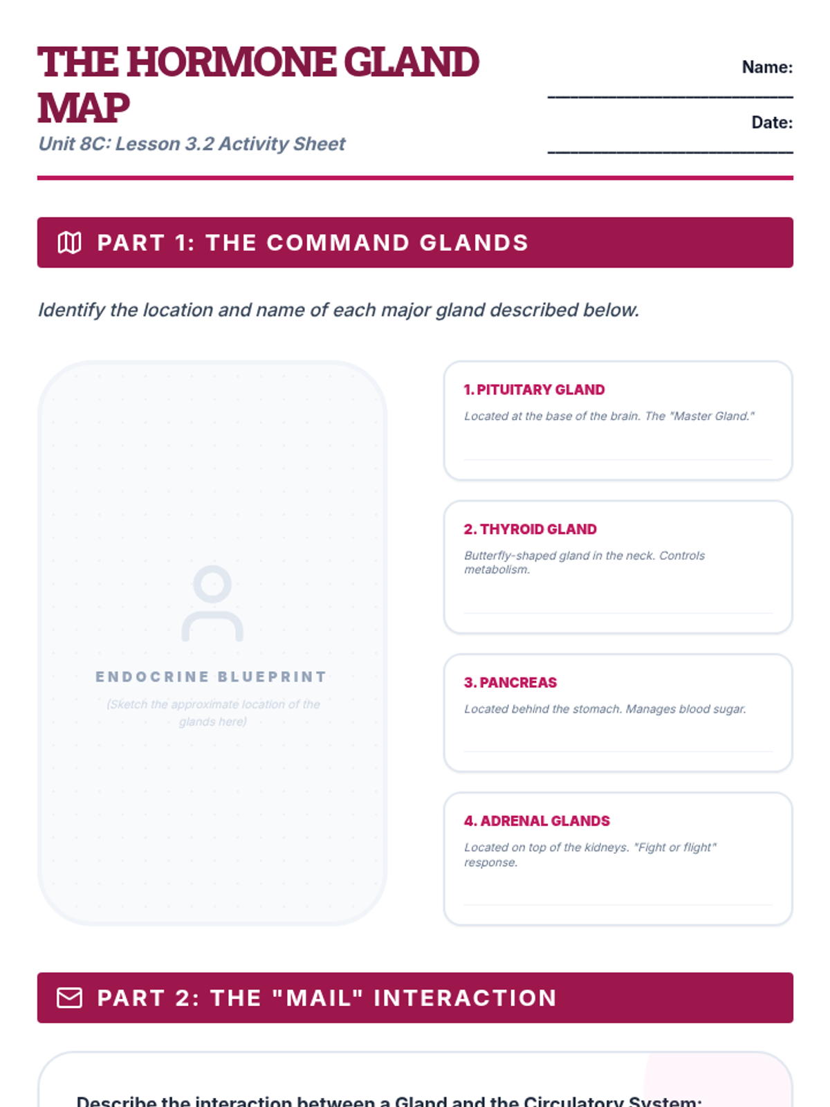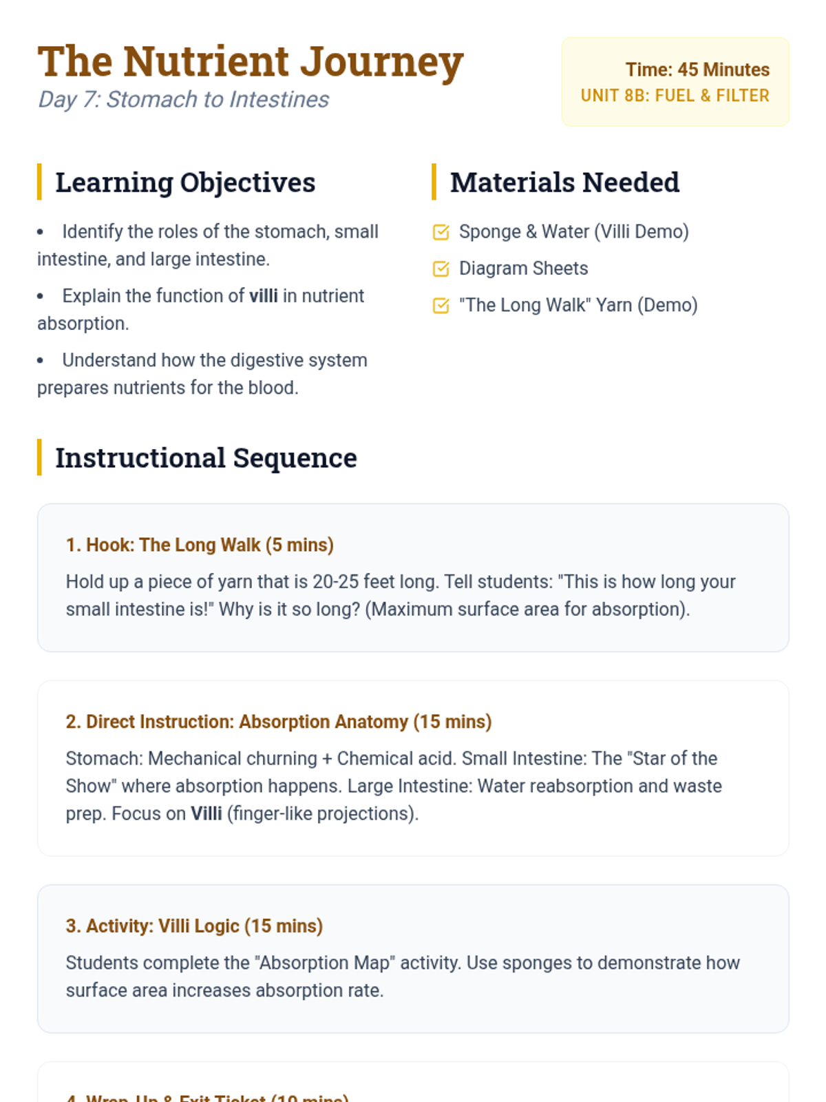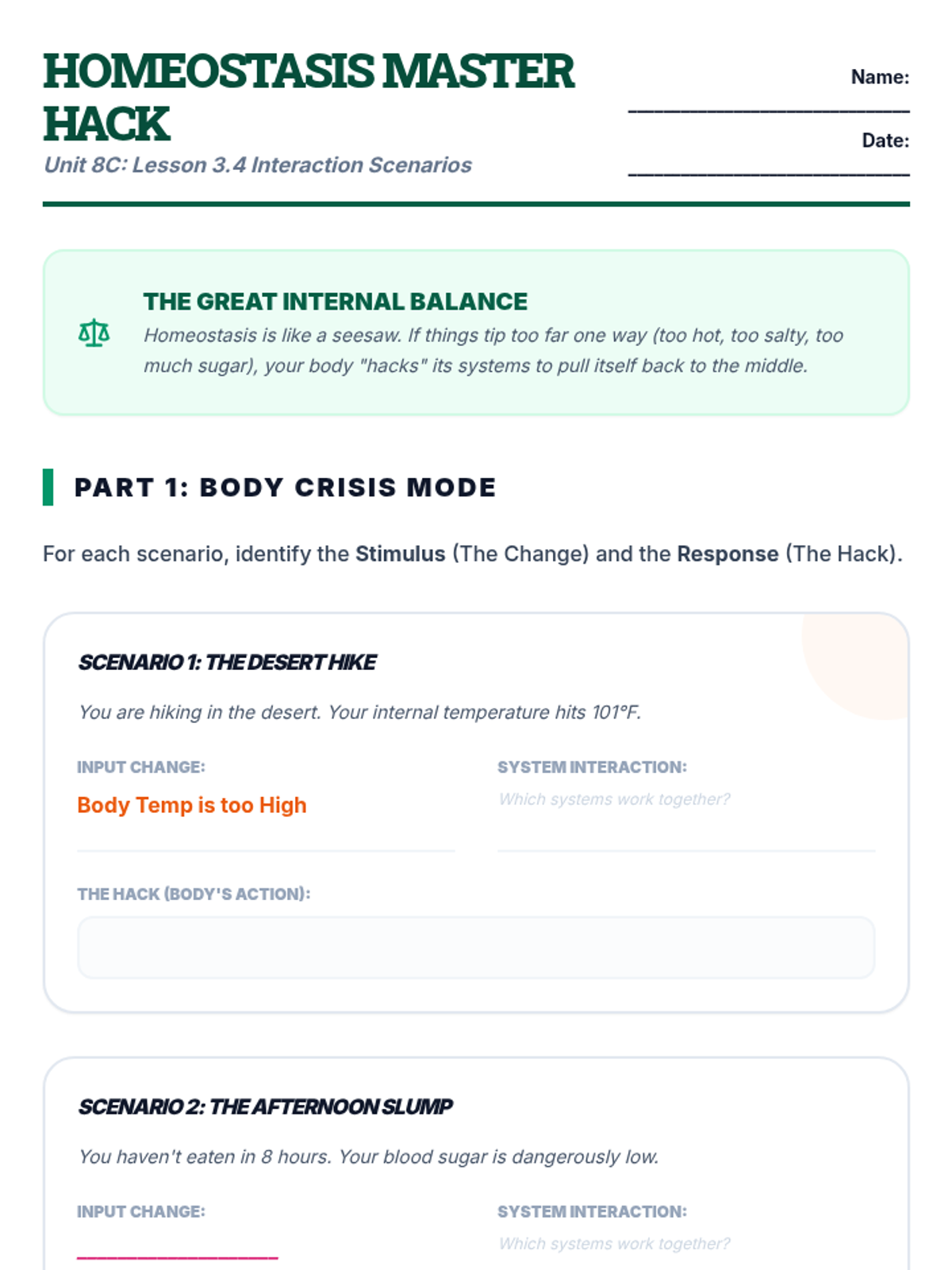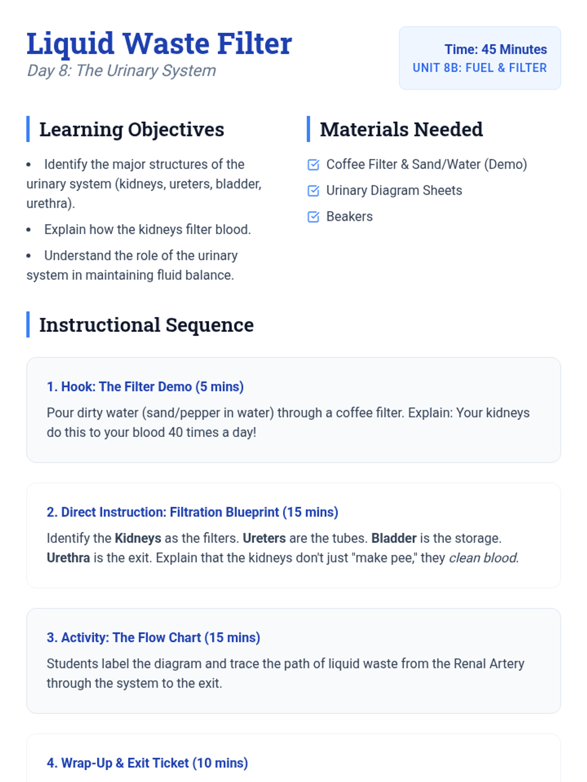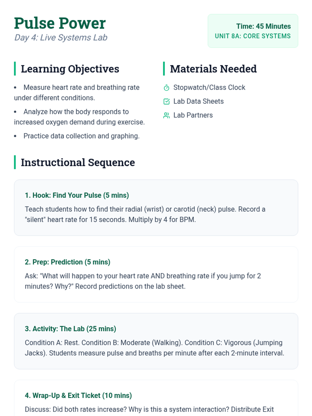 A comprehensive 15-day curriculum unit for 7th-grade science exploring the circulatory, respiratory, digestive, urinary, nervous, and endocrine systems, with a focus on how they interact to support life and maintain homeostasis.