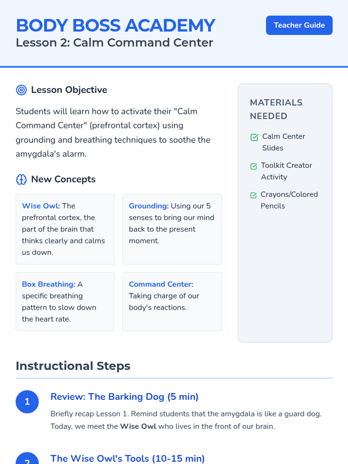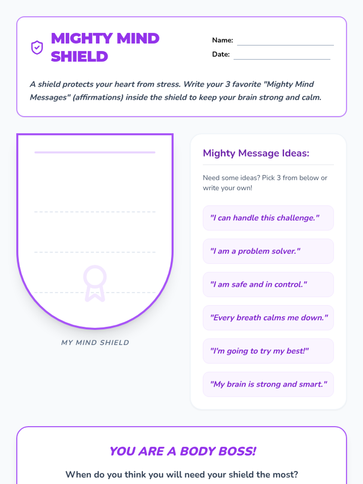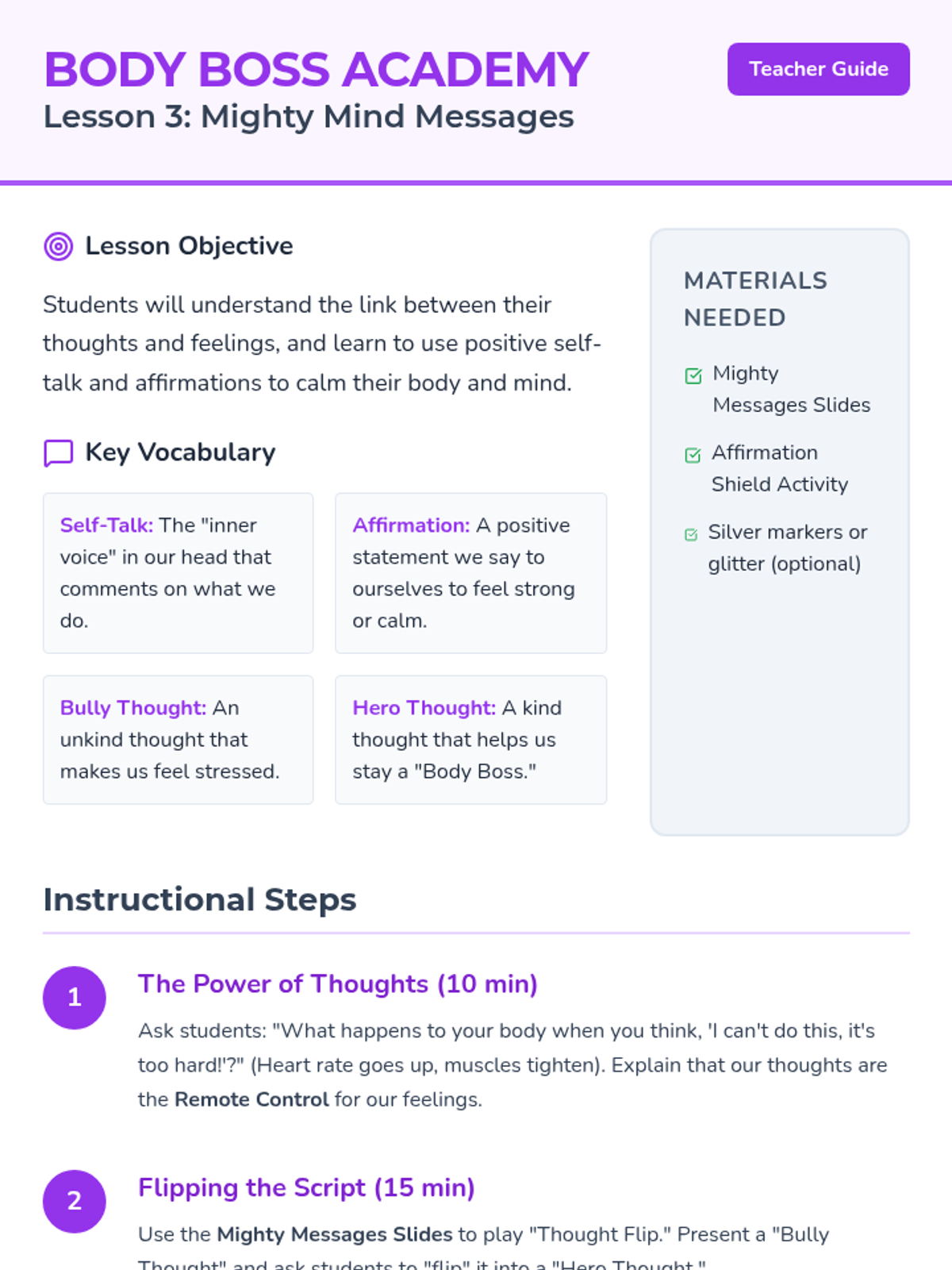 A 3-session stress management unit for elementary students that explores the body's physical response to stress and introduces positive self-talk and affirmations as tools for emotional regulation.