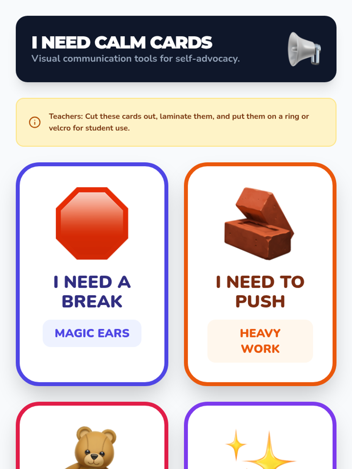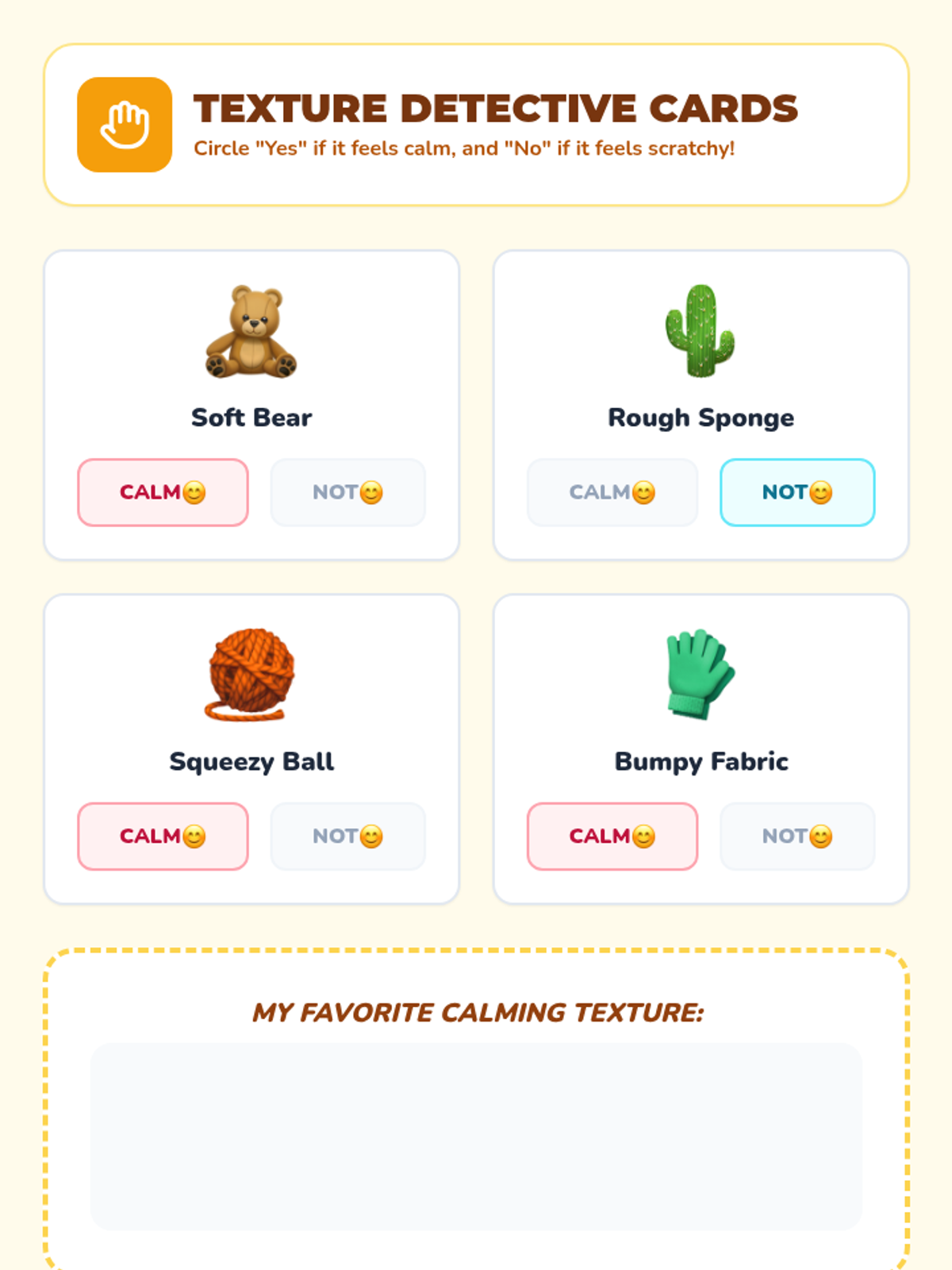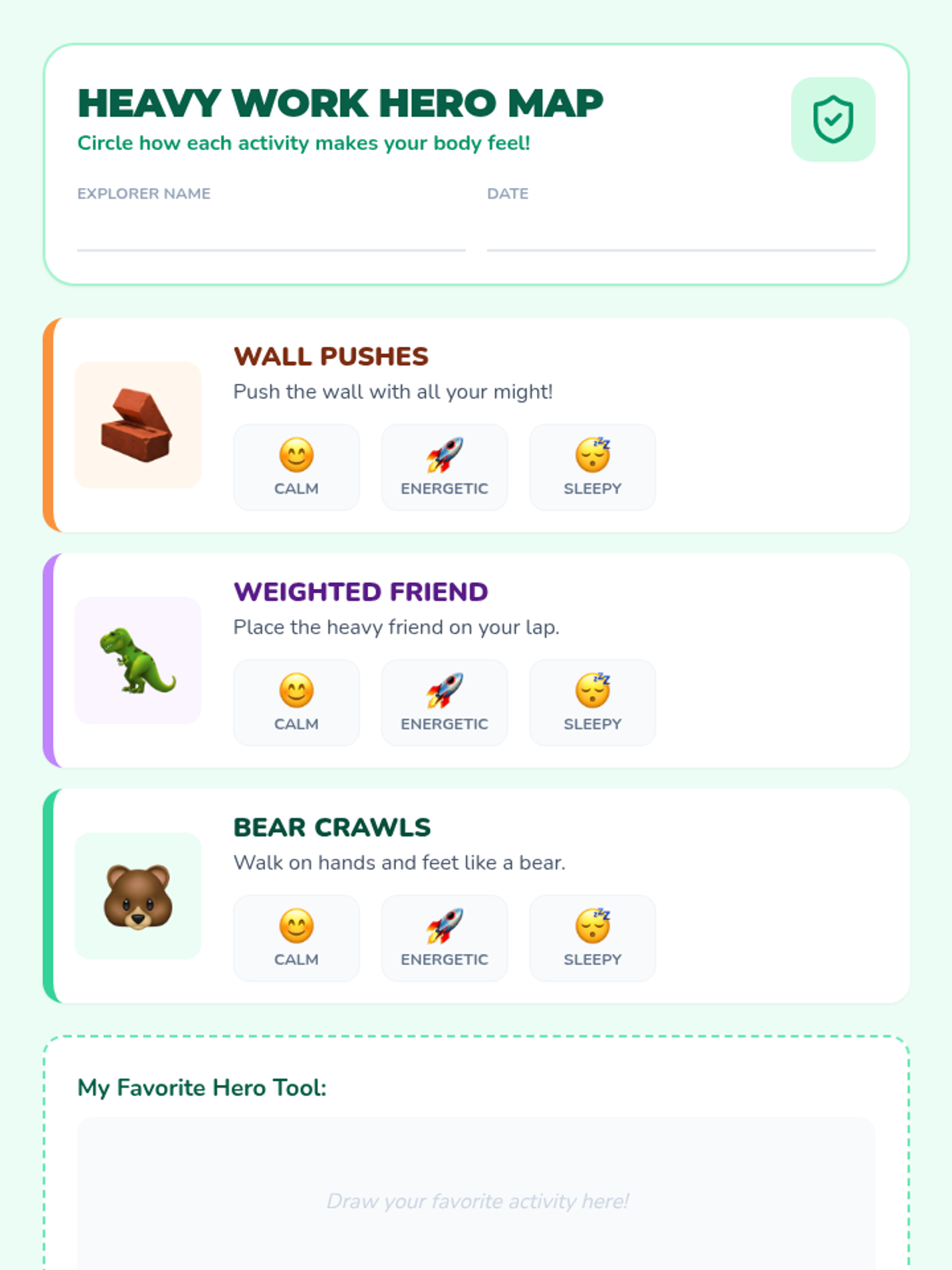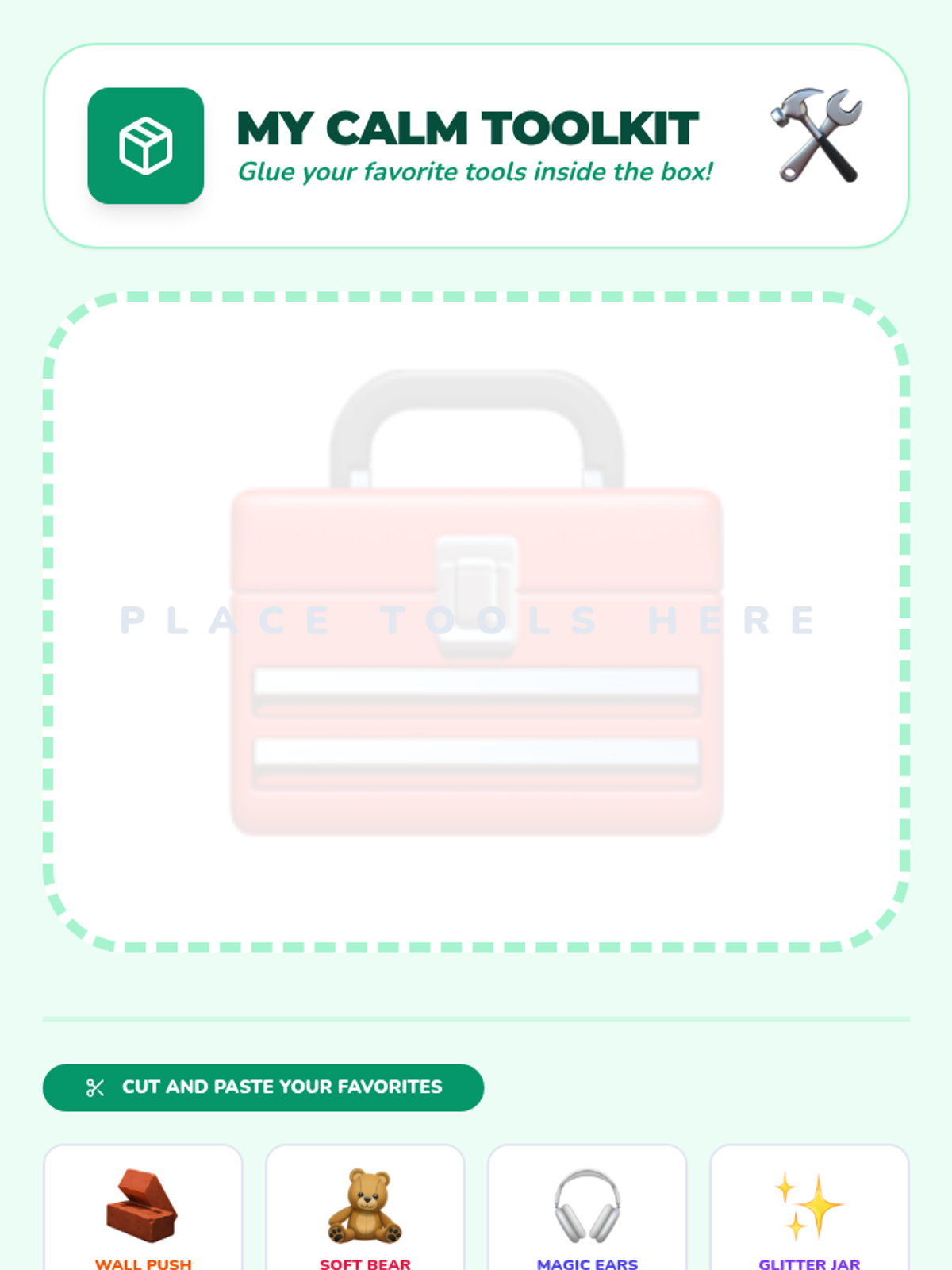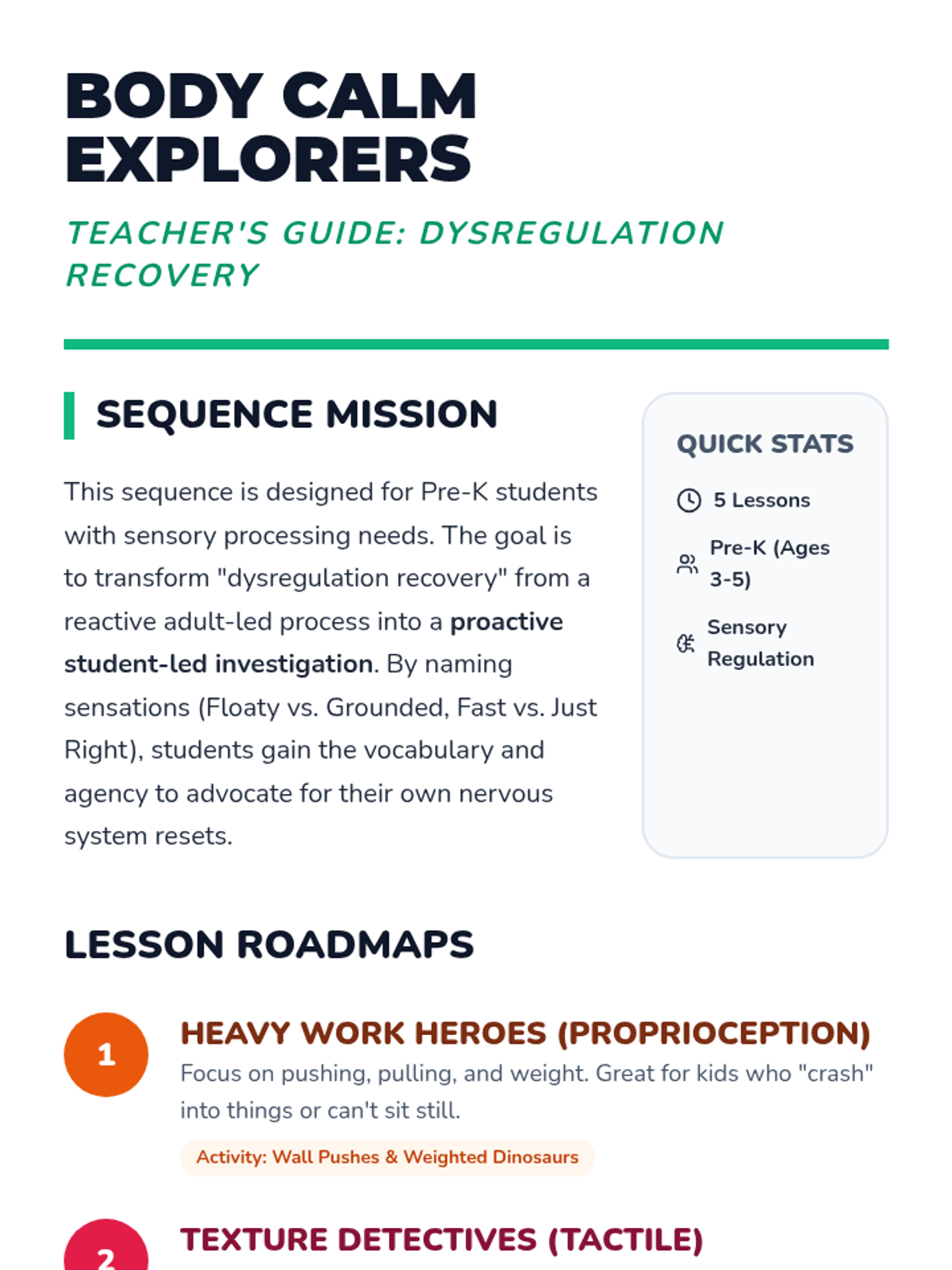 A hands-on sequence for Pre-K students to explore sensory tools (proprioceptive, tactile, auditory, and visual) that help regulate their nervous systems. Students identify personal favorites to build a custom 'Recovery Kit' for moments of dysregulation.