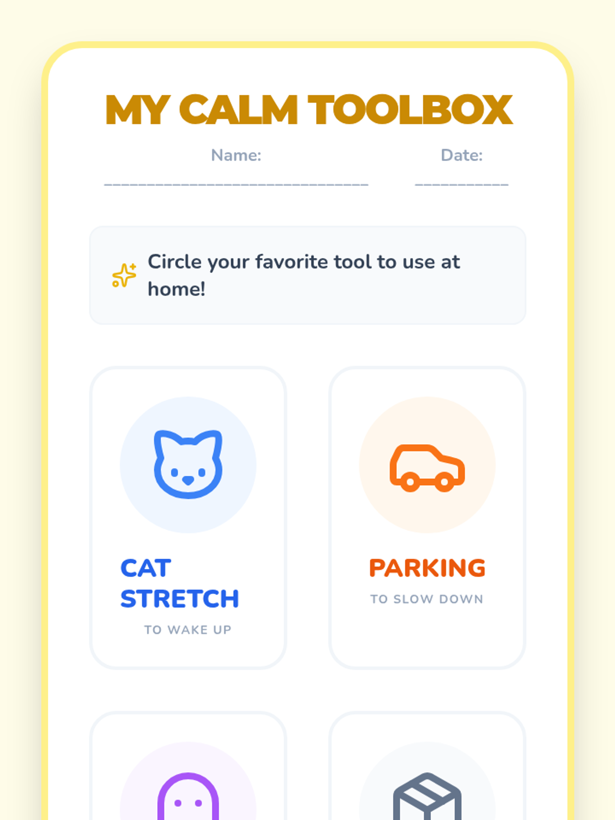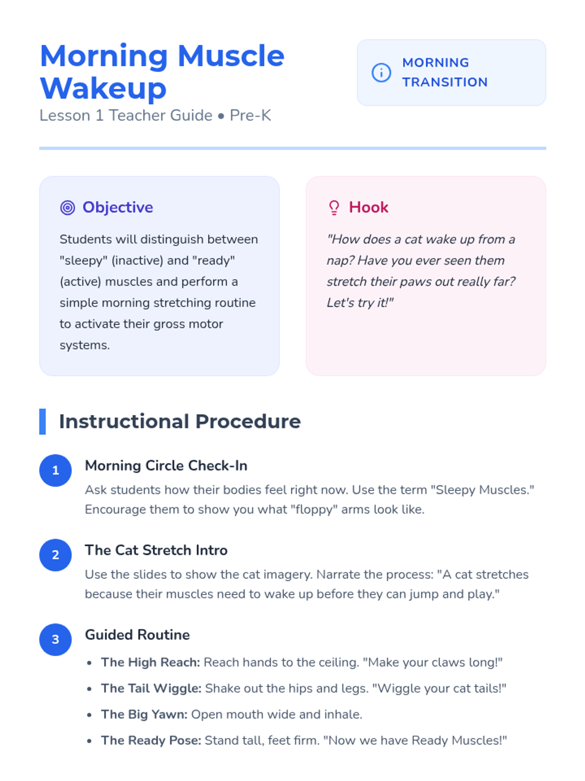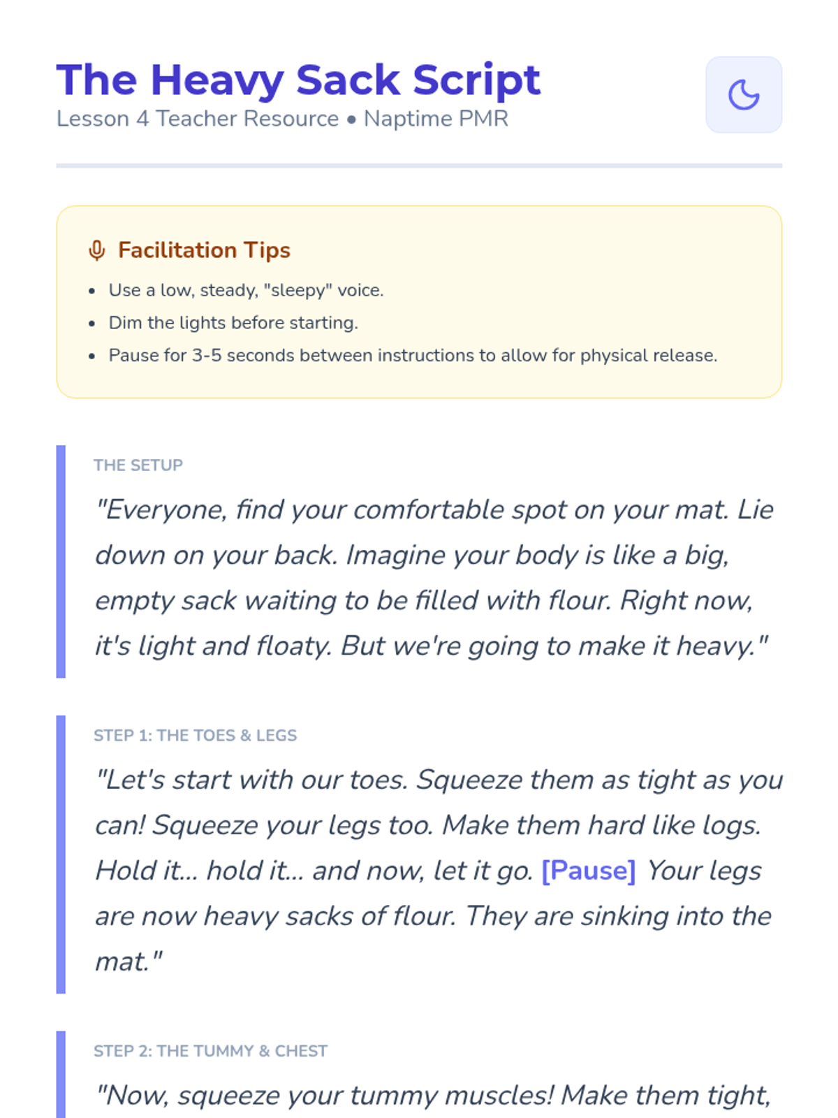 A sequence for Pre-K students to learn and practice progressive muscle relaxation techniques during daily school transitions. Students develop a 'toolbox' of body-calming strategies to use after recess, before naptime, and while waiting.