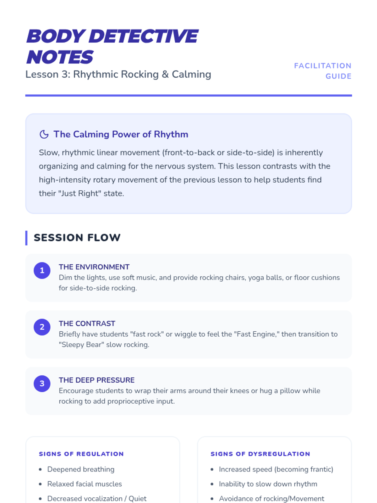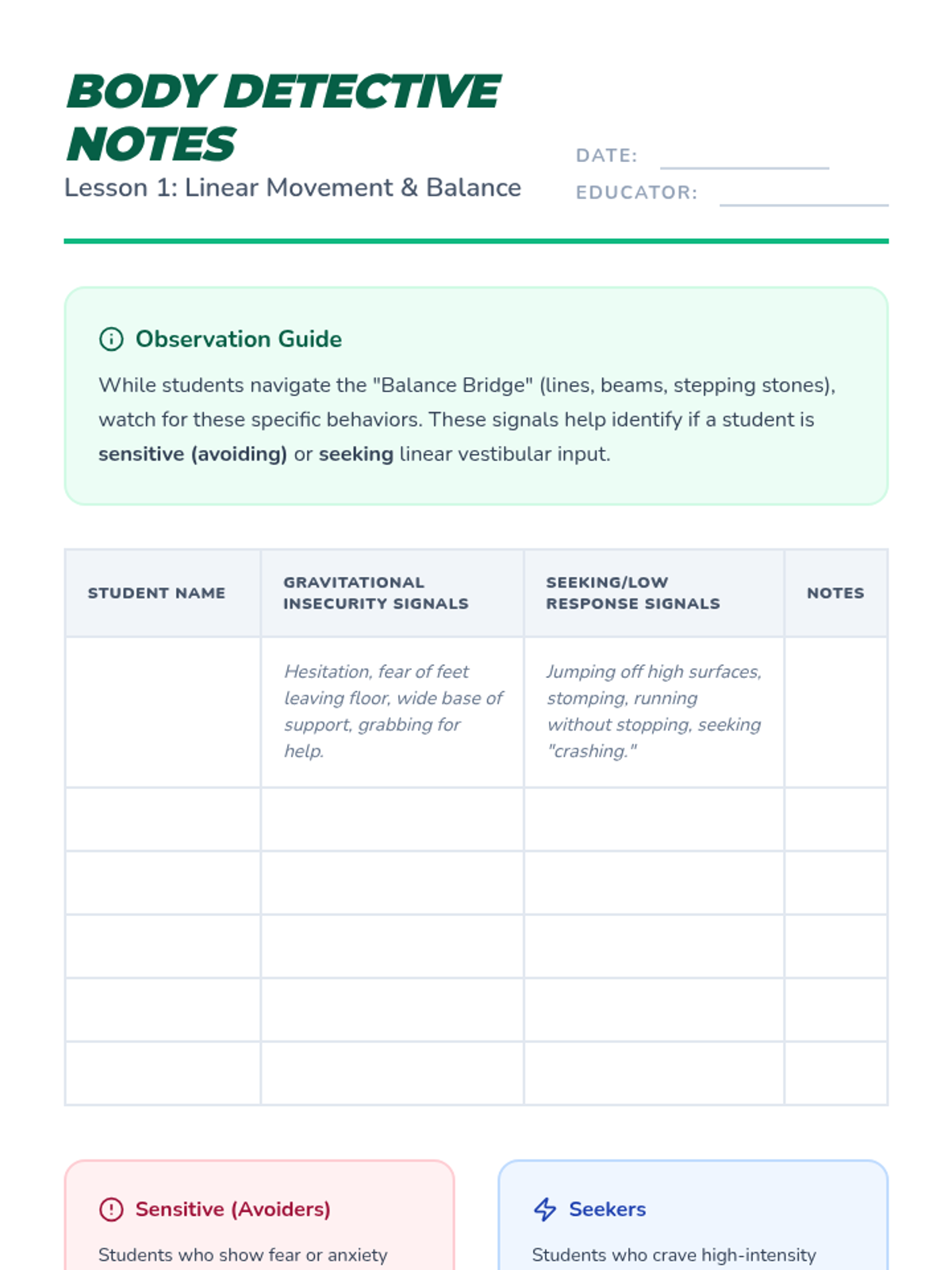 A sensory processing sequence for Pre-K students to explore vestibular movement and internal signals (interoception) to better understand their unique sensory needs and regulation strategies. Students learn to identify if they seek or avoid movement and how to listen to their body's internal 'engine'.