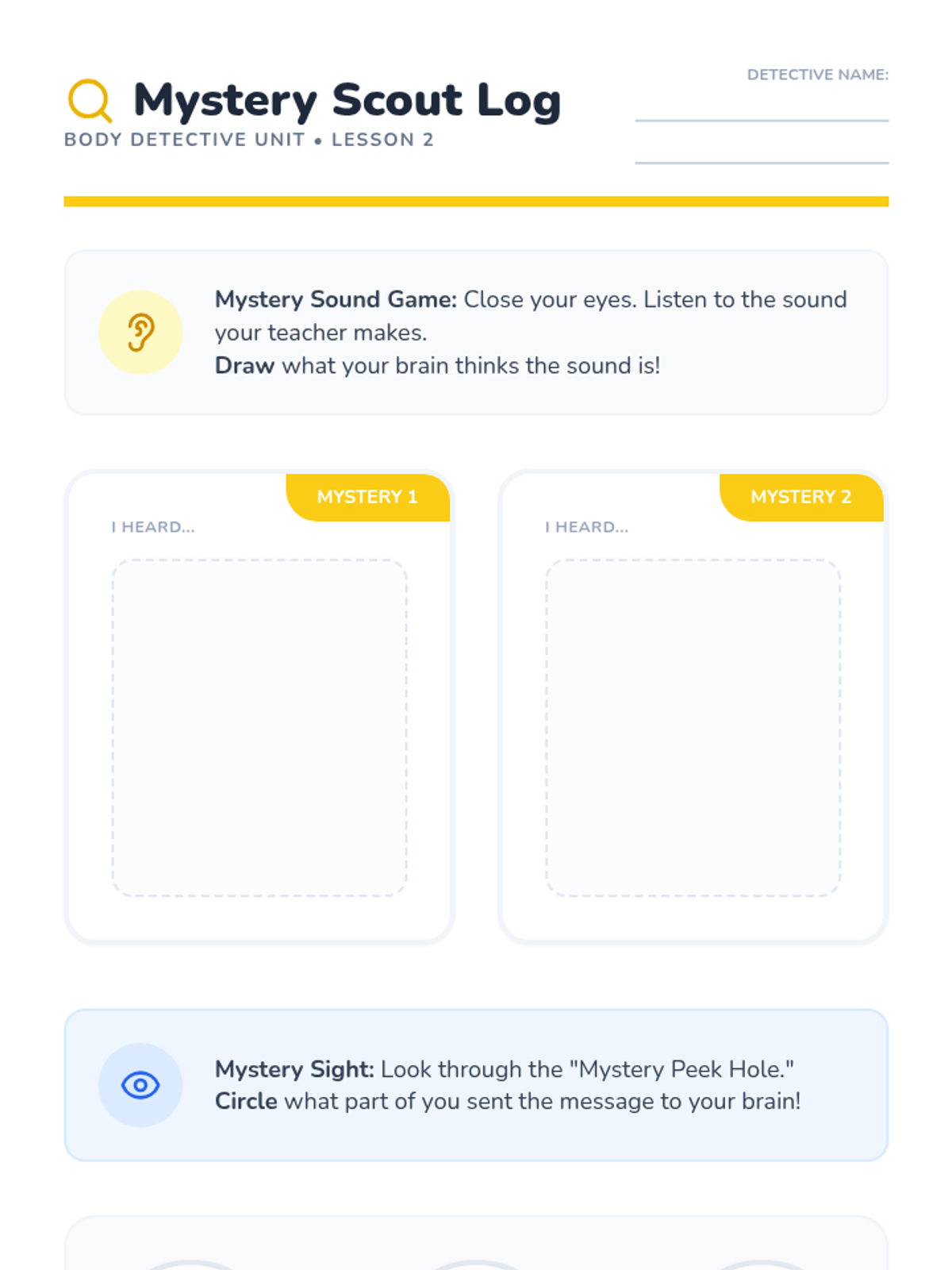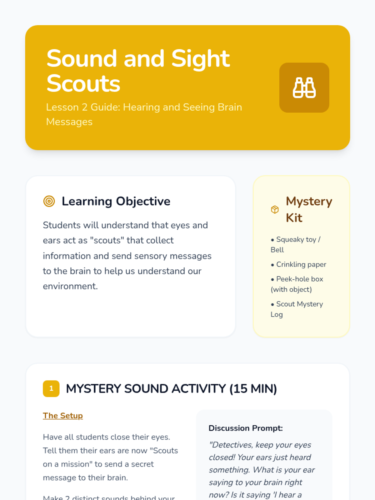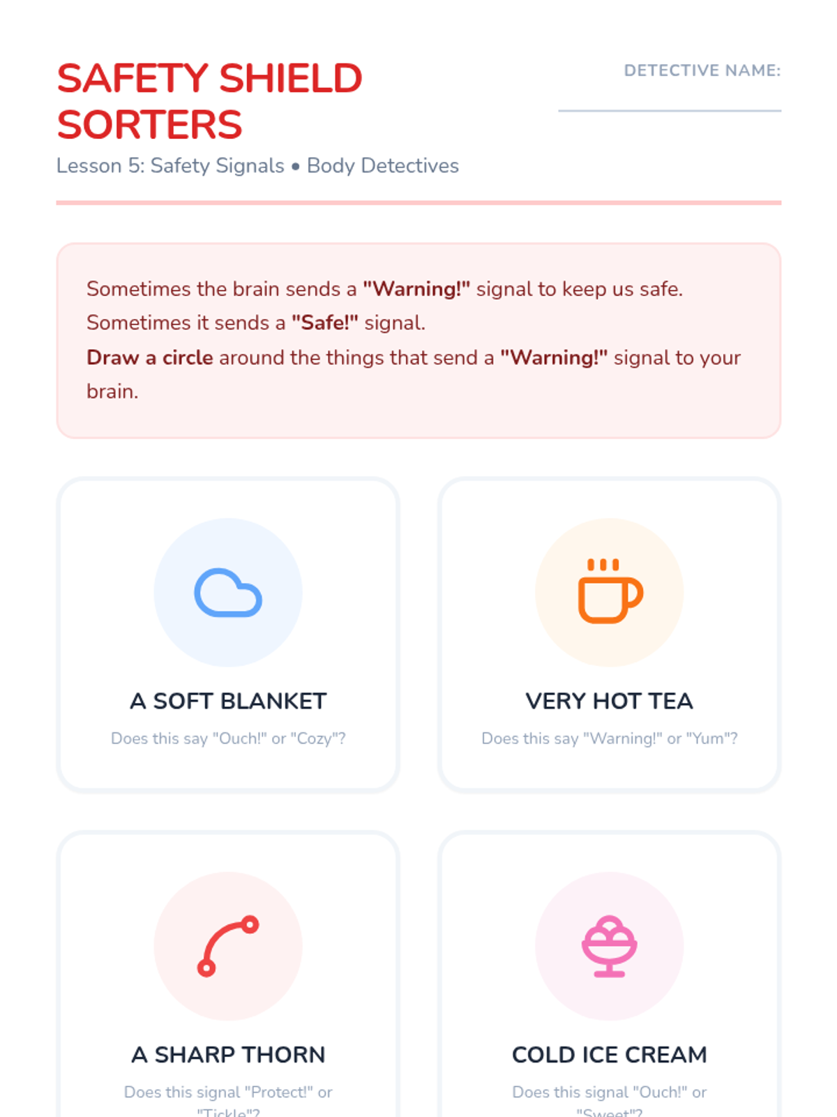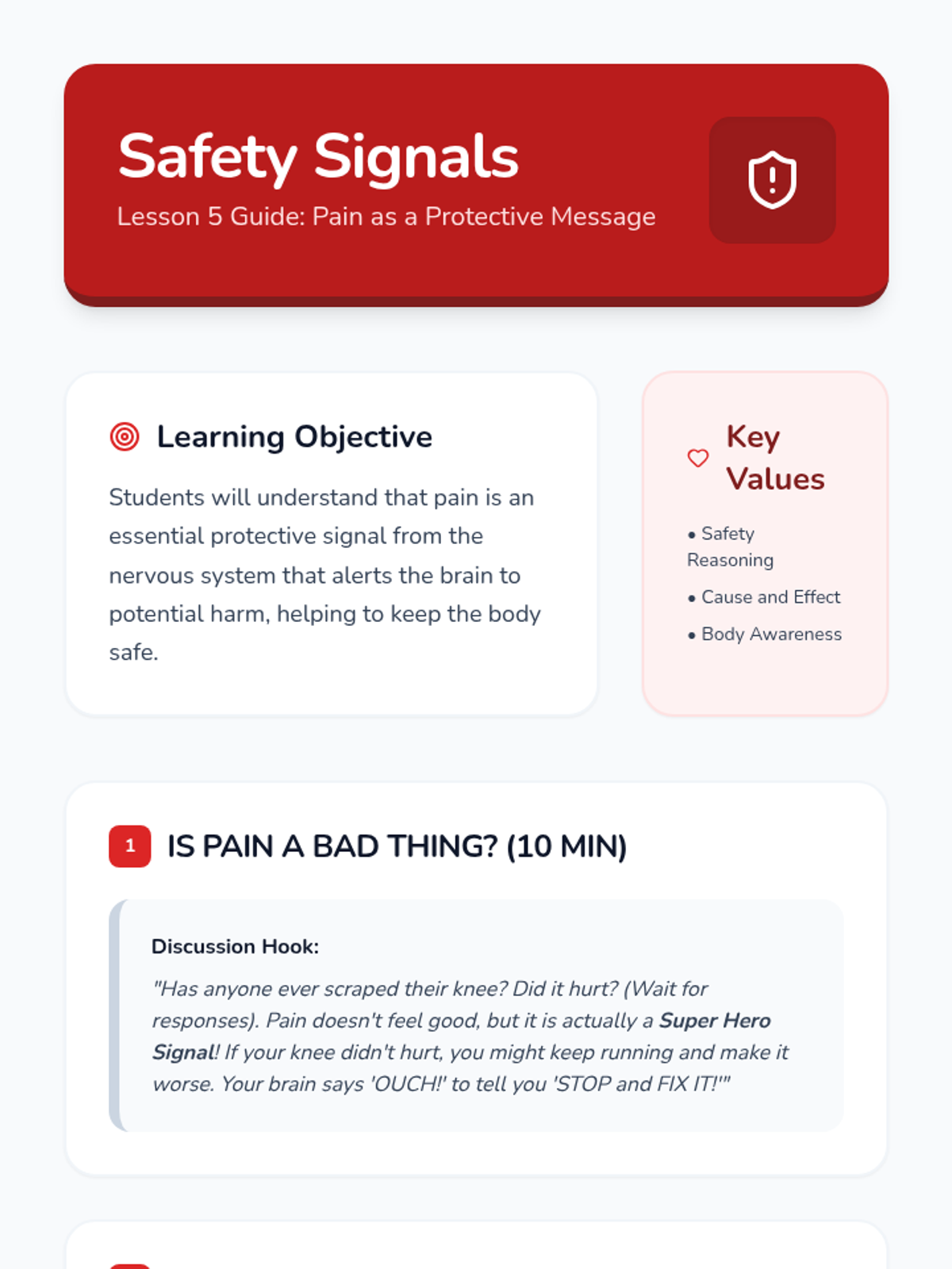 A Kindergarten life science sequence exploring the nervous system, where students discover the brain as the body's control center and learn how senses send signals to trigger reactions and ensure safety.