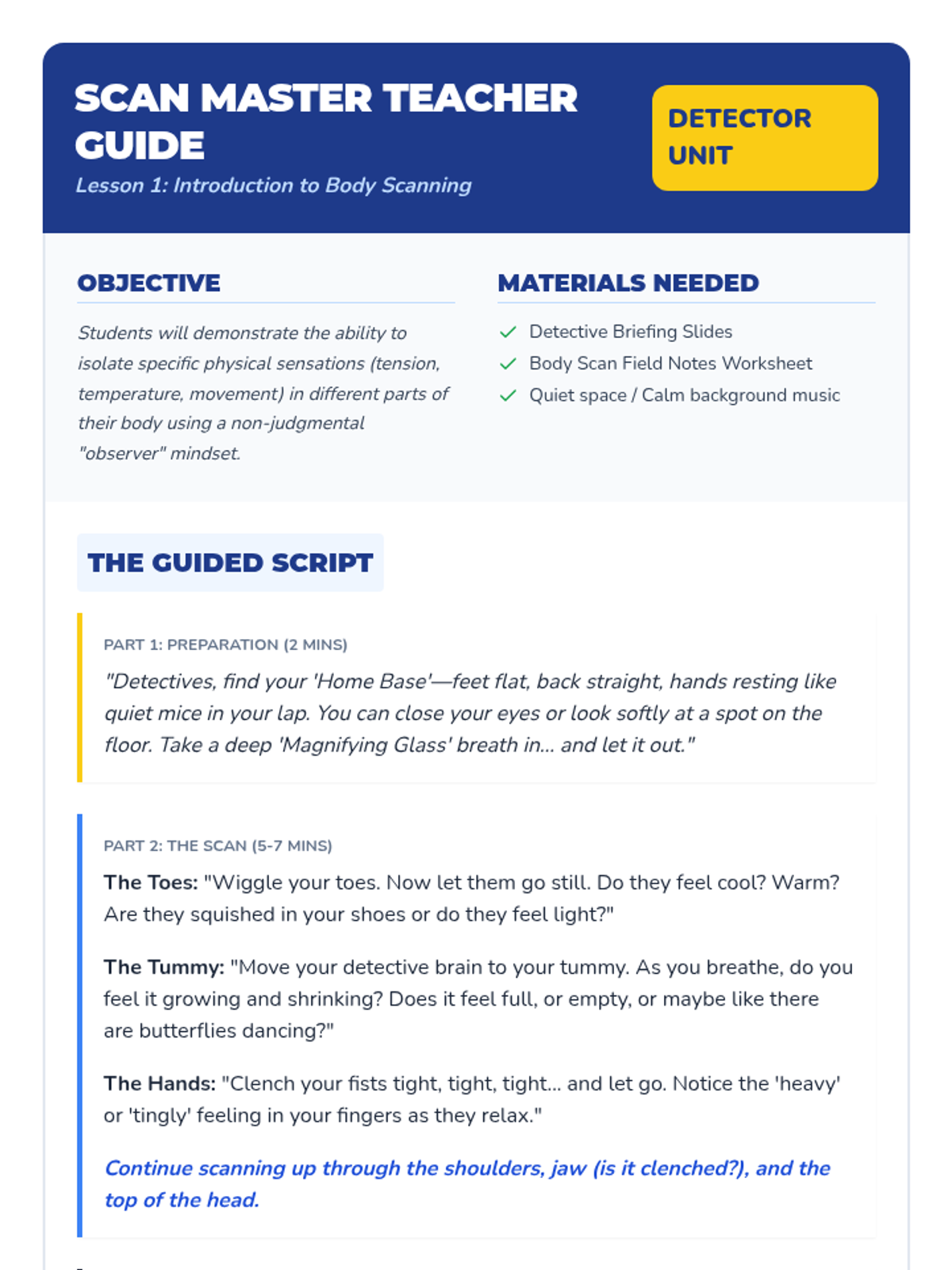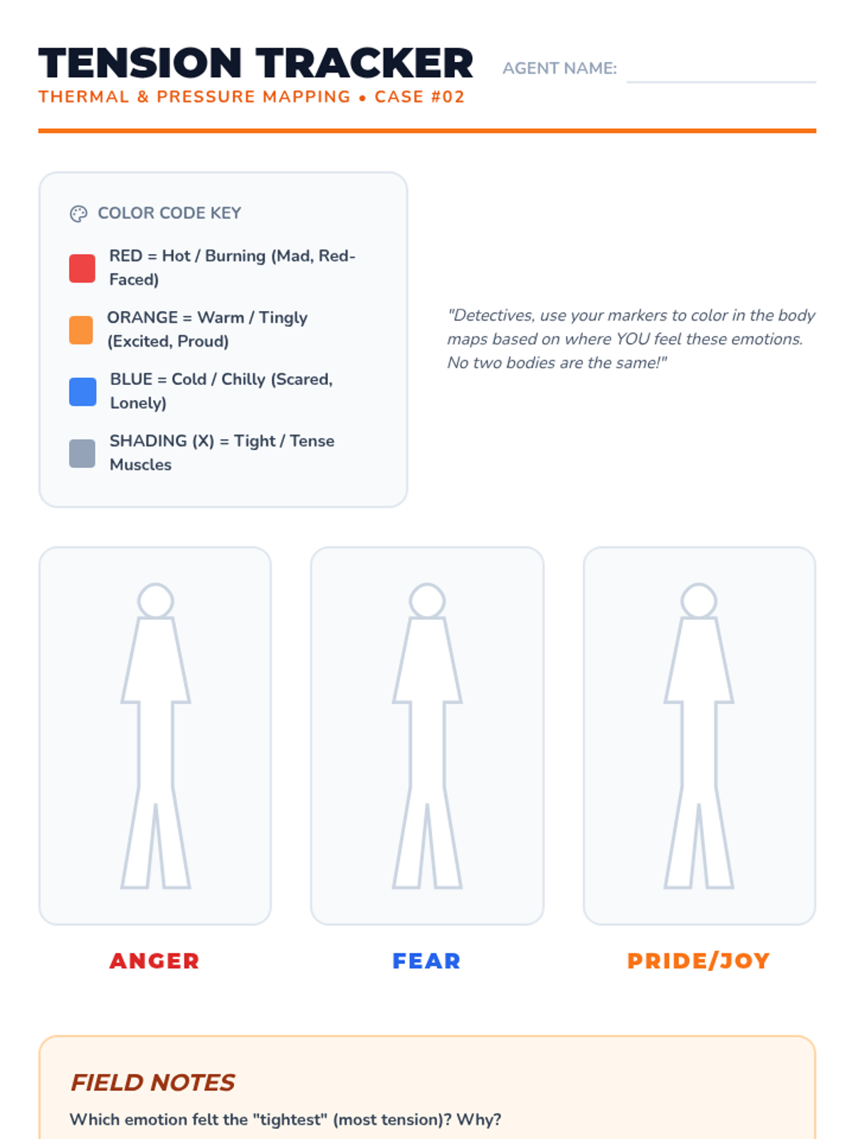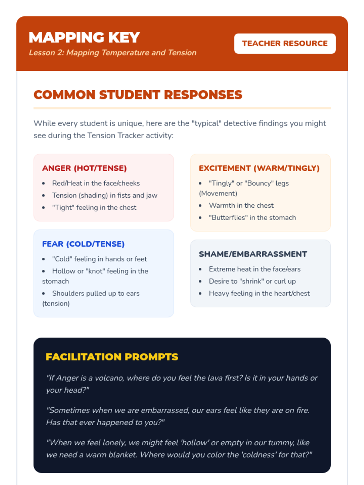 A 5-lesson sequence for 3rd graders to connect physical sensations to emotions. Students act as 'body detectives' to identify physiological cues like heart rate, temperature, and tension to better label complex feelings.