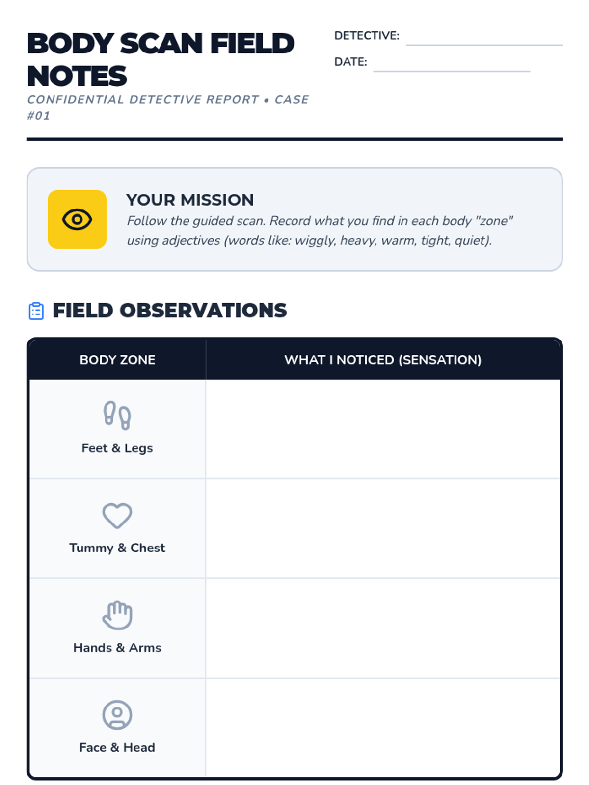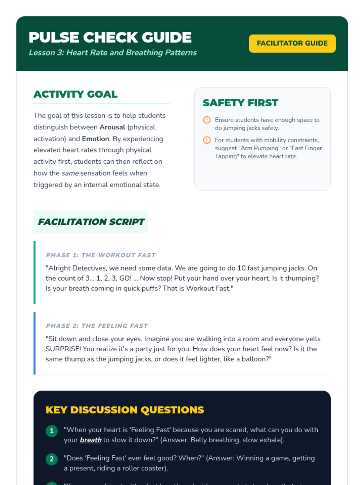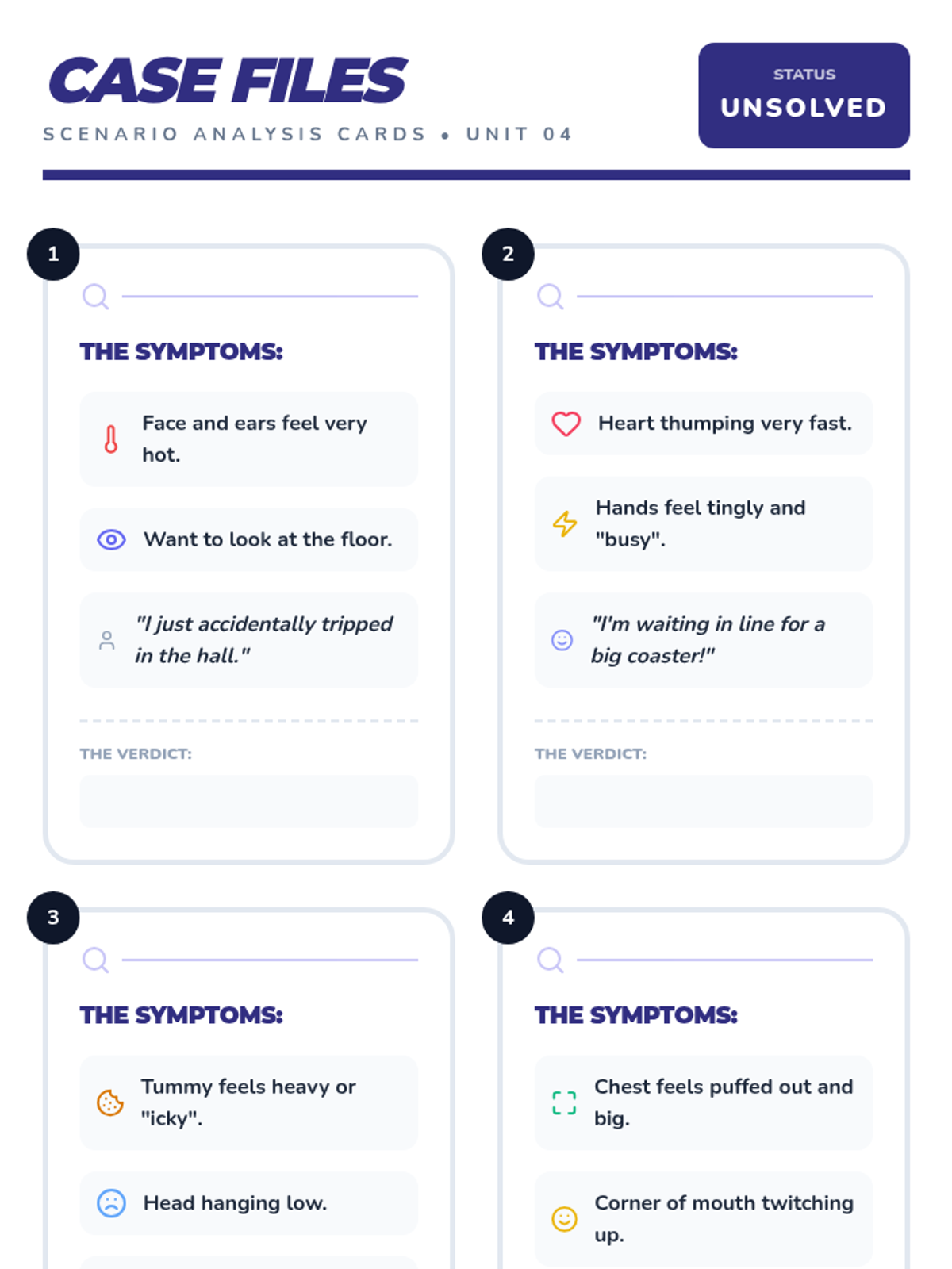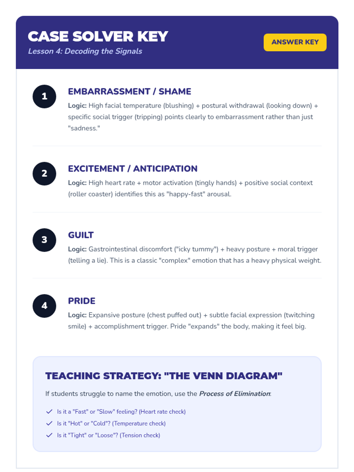 A 5-lesson sequence for 3rd graders to connect physical sensations to emotions. Students act as 'body detectives' to identify physiological cues like heart rate, temperature, and tension to better label complex feelings.