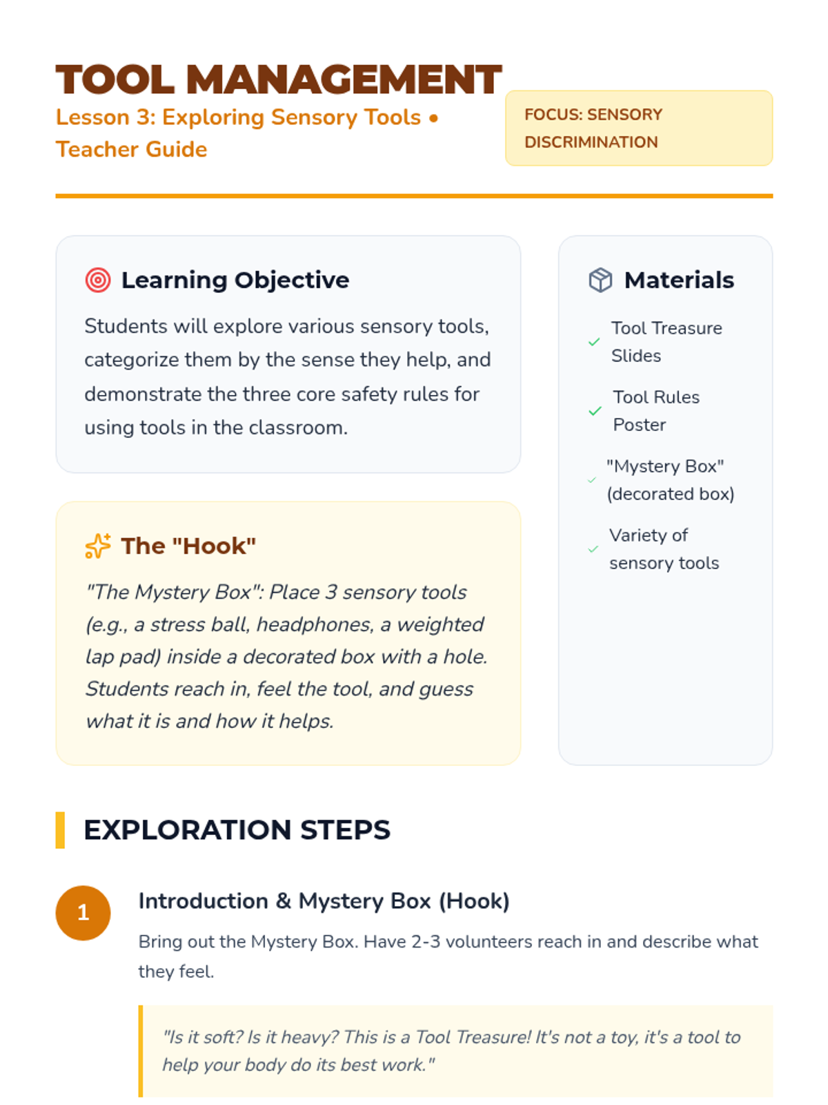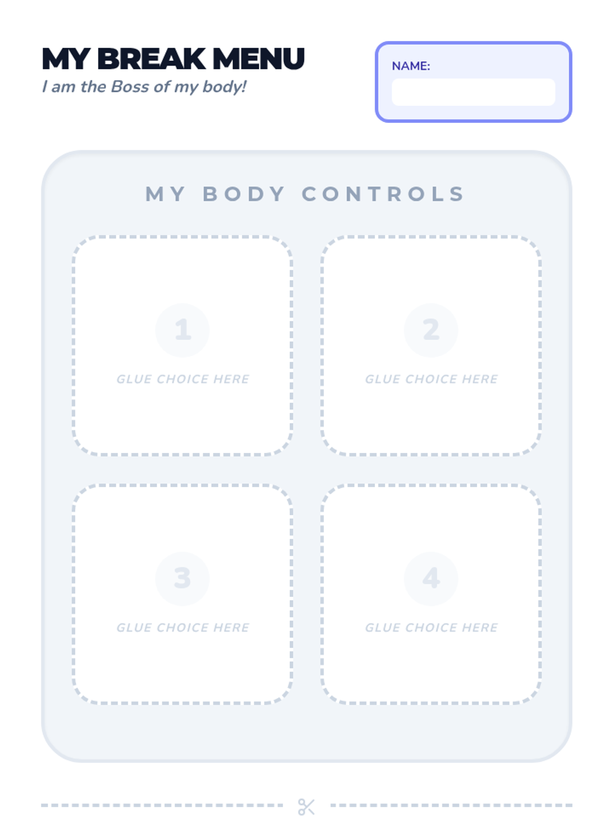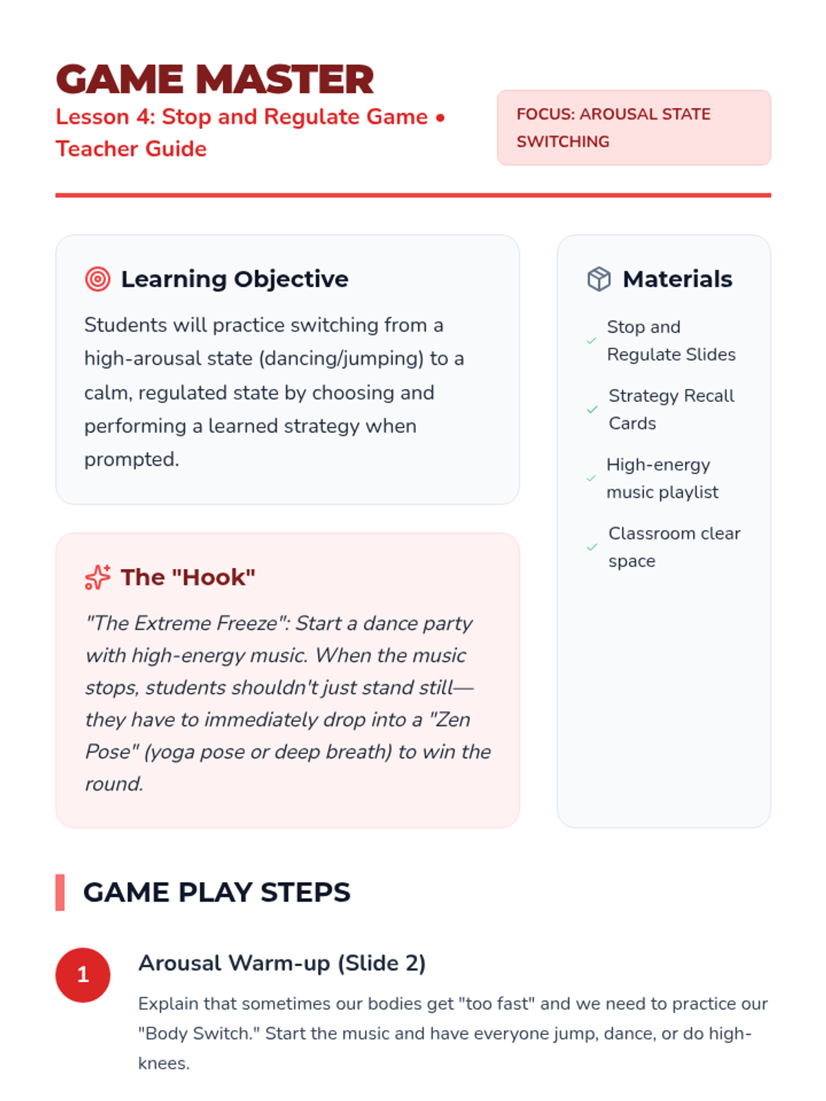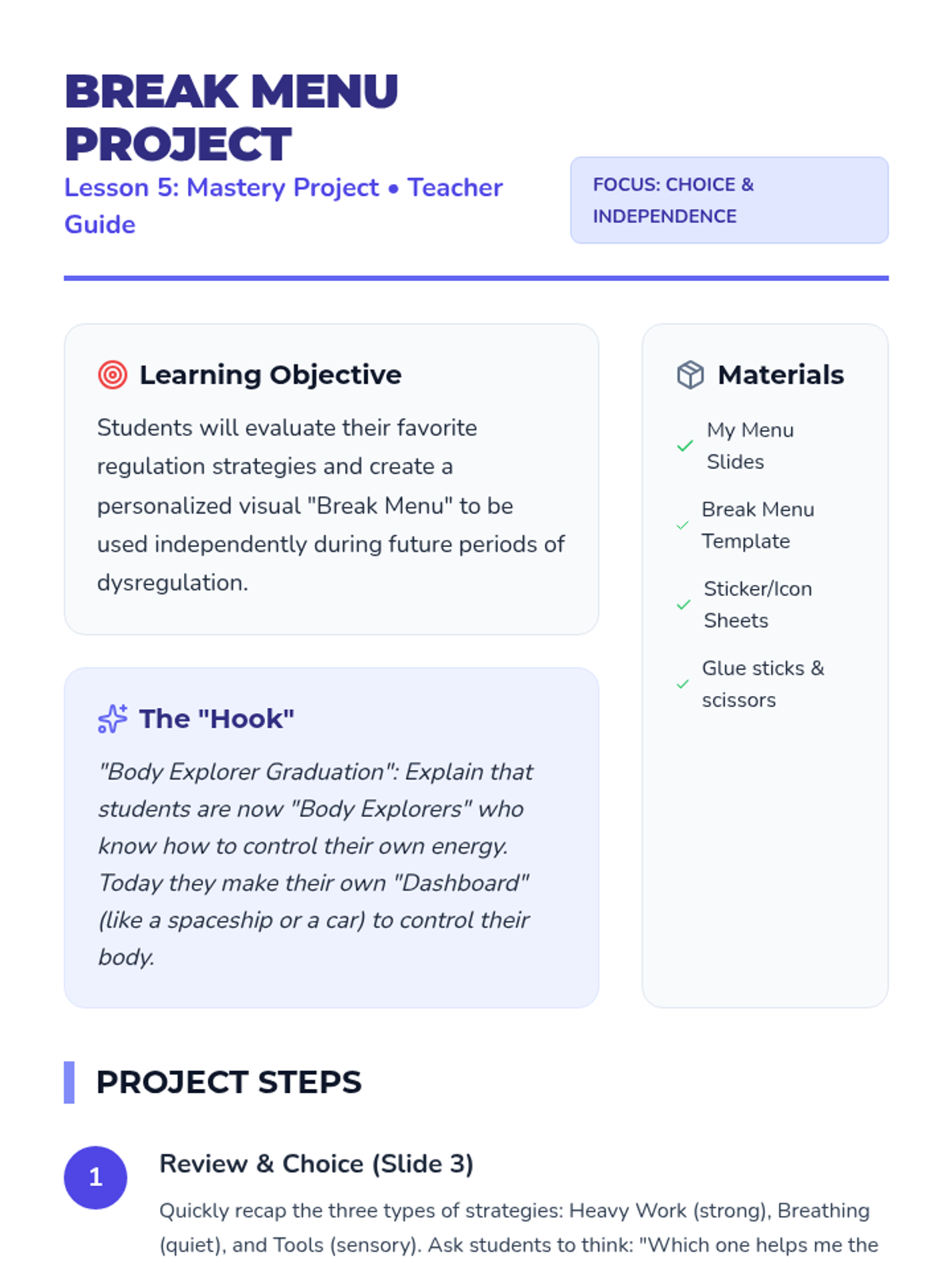 A 5-lesson sequence for Pre-K students focusing on learning and practicing specific motor and sensory strategies to regulate their nervous systems and manage breaks effectively.