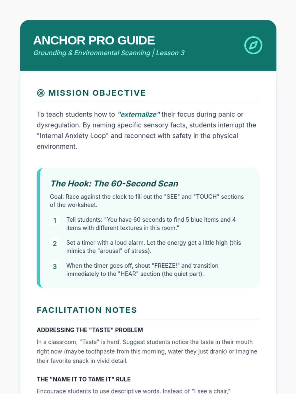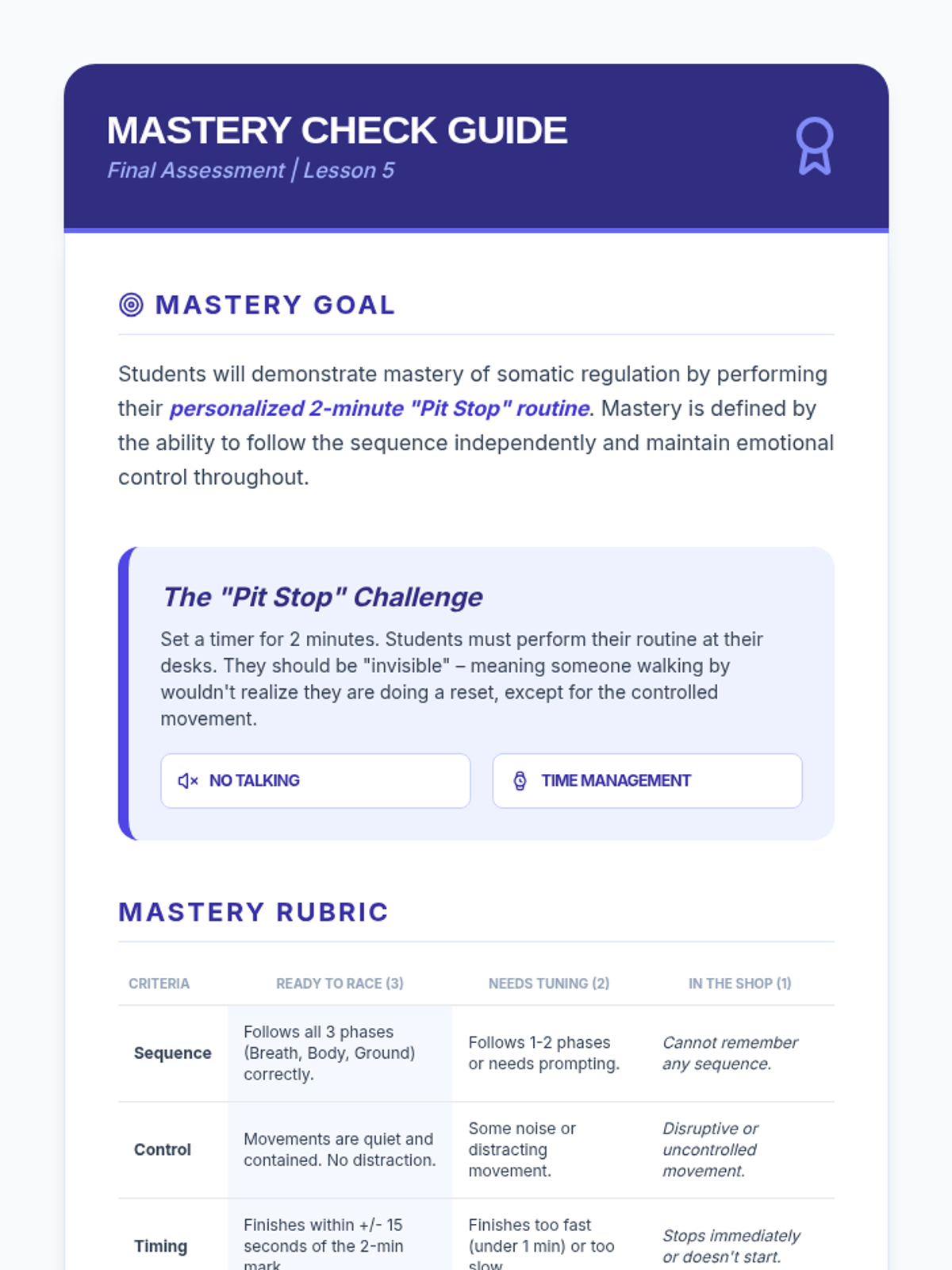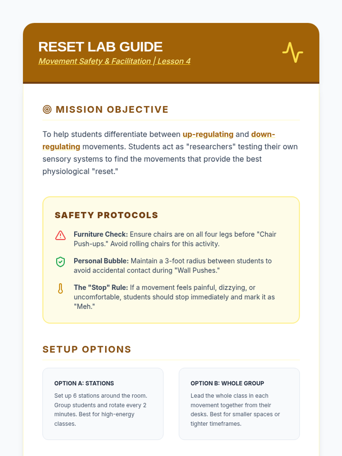 This sequence teaches 7th-grade students somatic techniques for emotional stabilization, moving from individual breath and muscle exercises to creating a personalized 2-minute regulation routine. Students learn to use their bodies as a toolkit to lower physiological arousal and manage dysregulation.