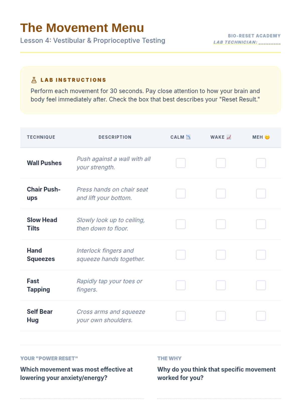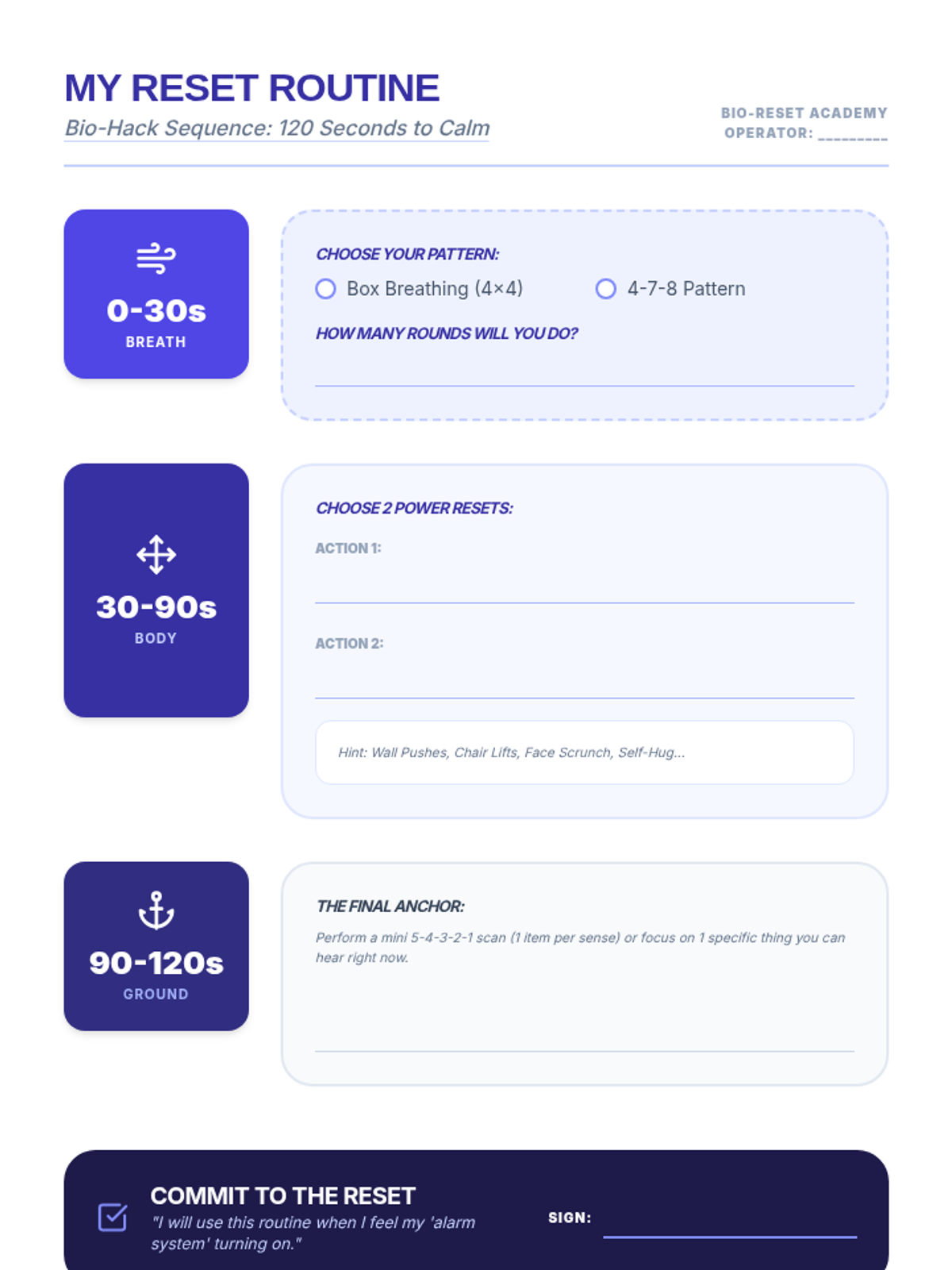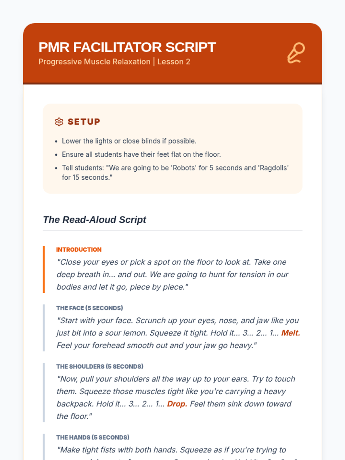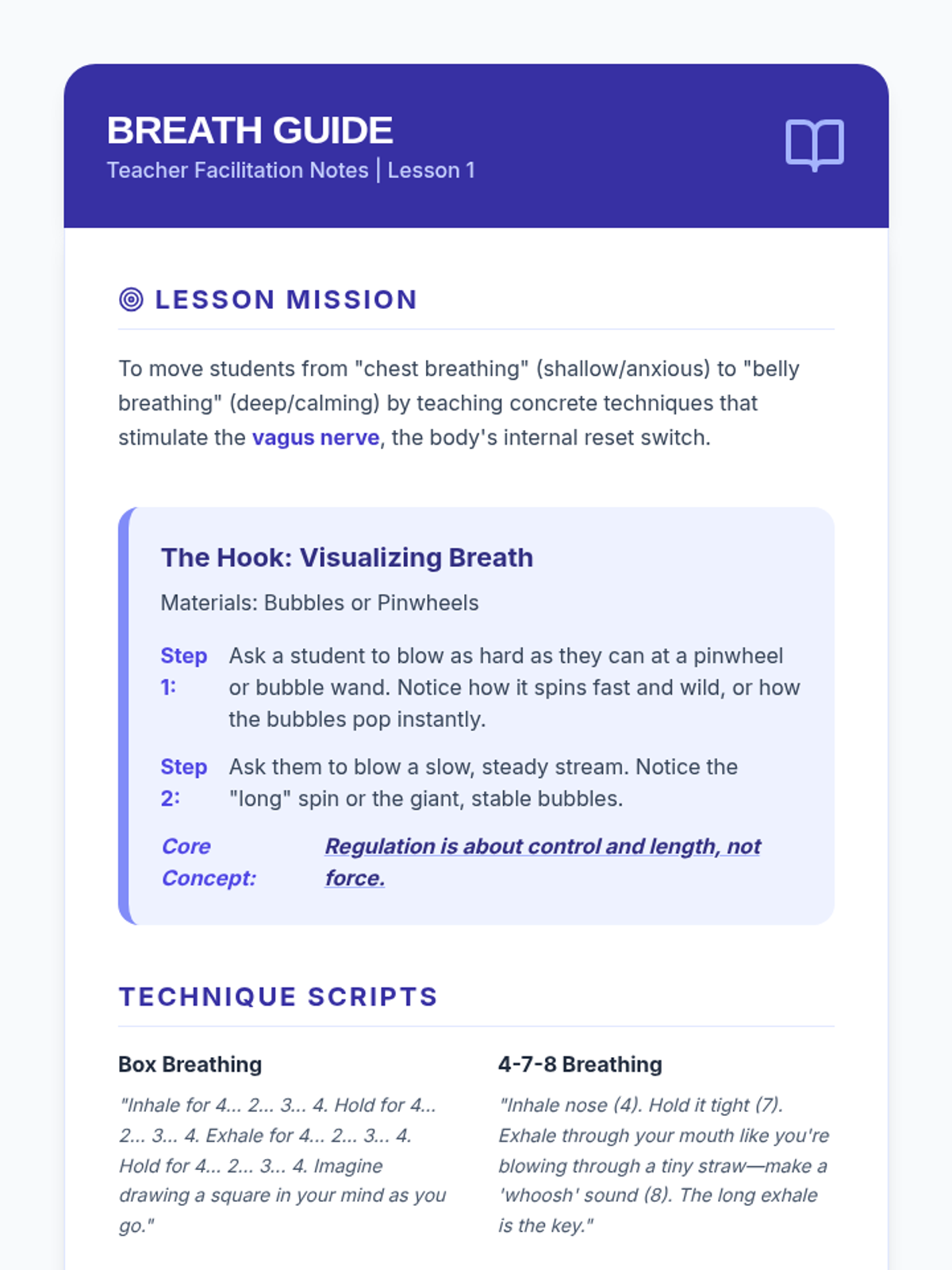 This sequence teaches 7th-grade students somatic techniques for emotional stabilization, moving from individual breath and muscle exercises to creating a personalized 2-minute regulation routine. Students learn to use their bodies as a toolkit to lower physiological arousal and manage dysregulation.