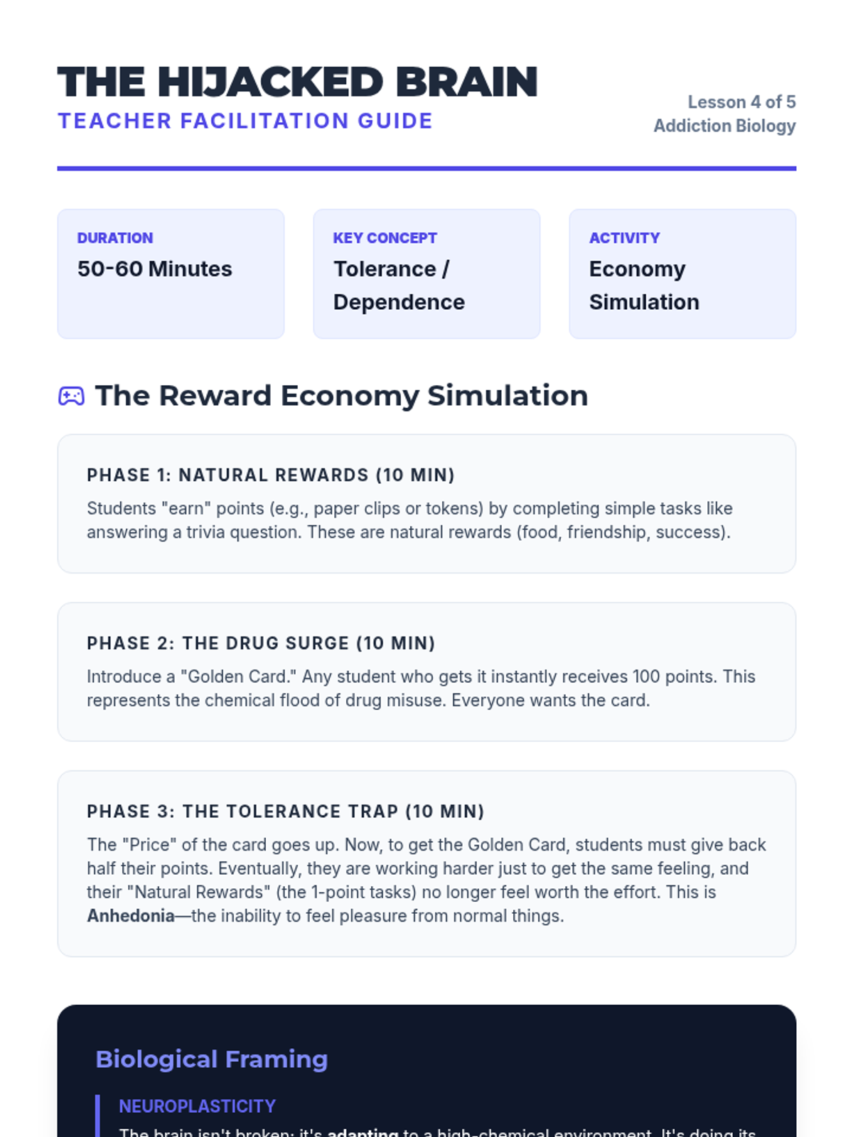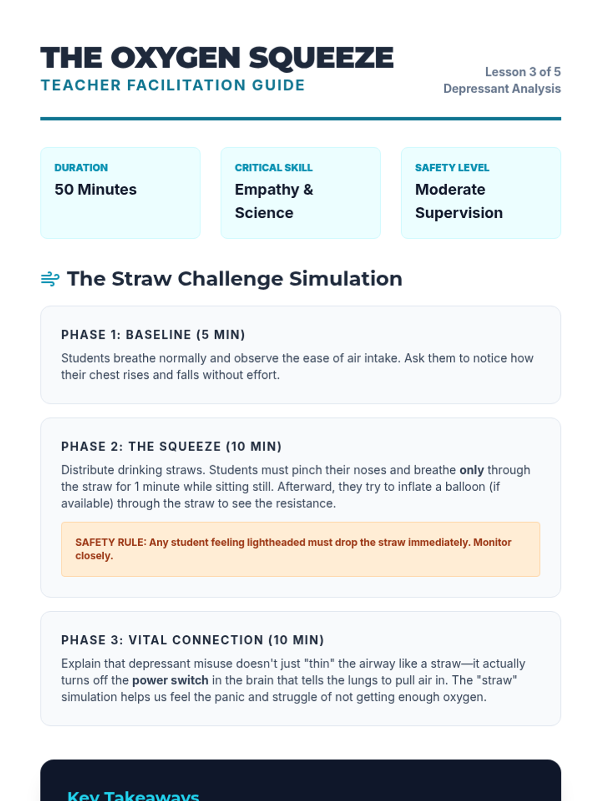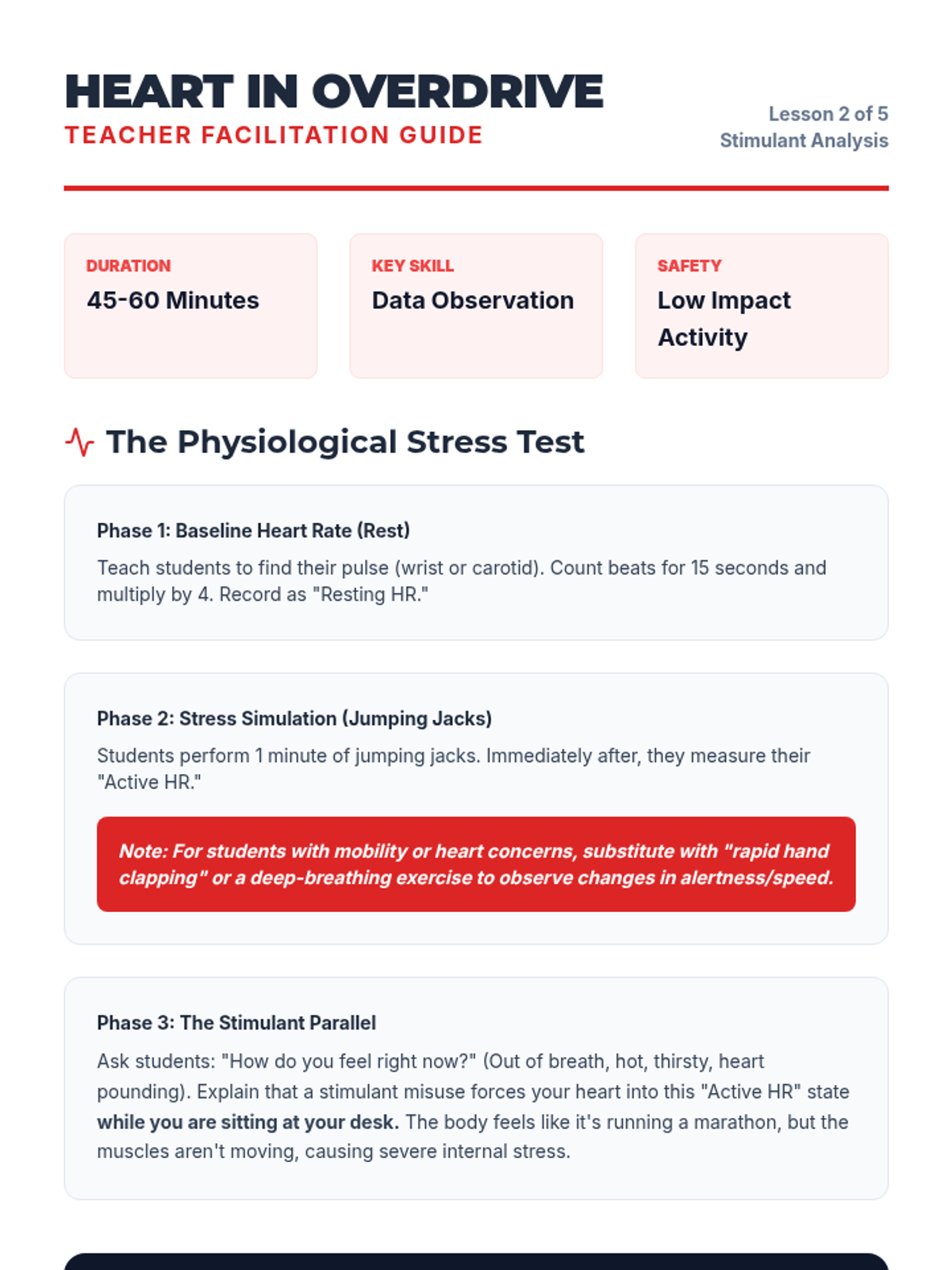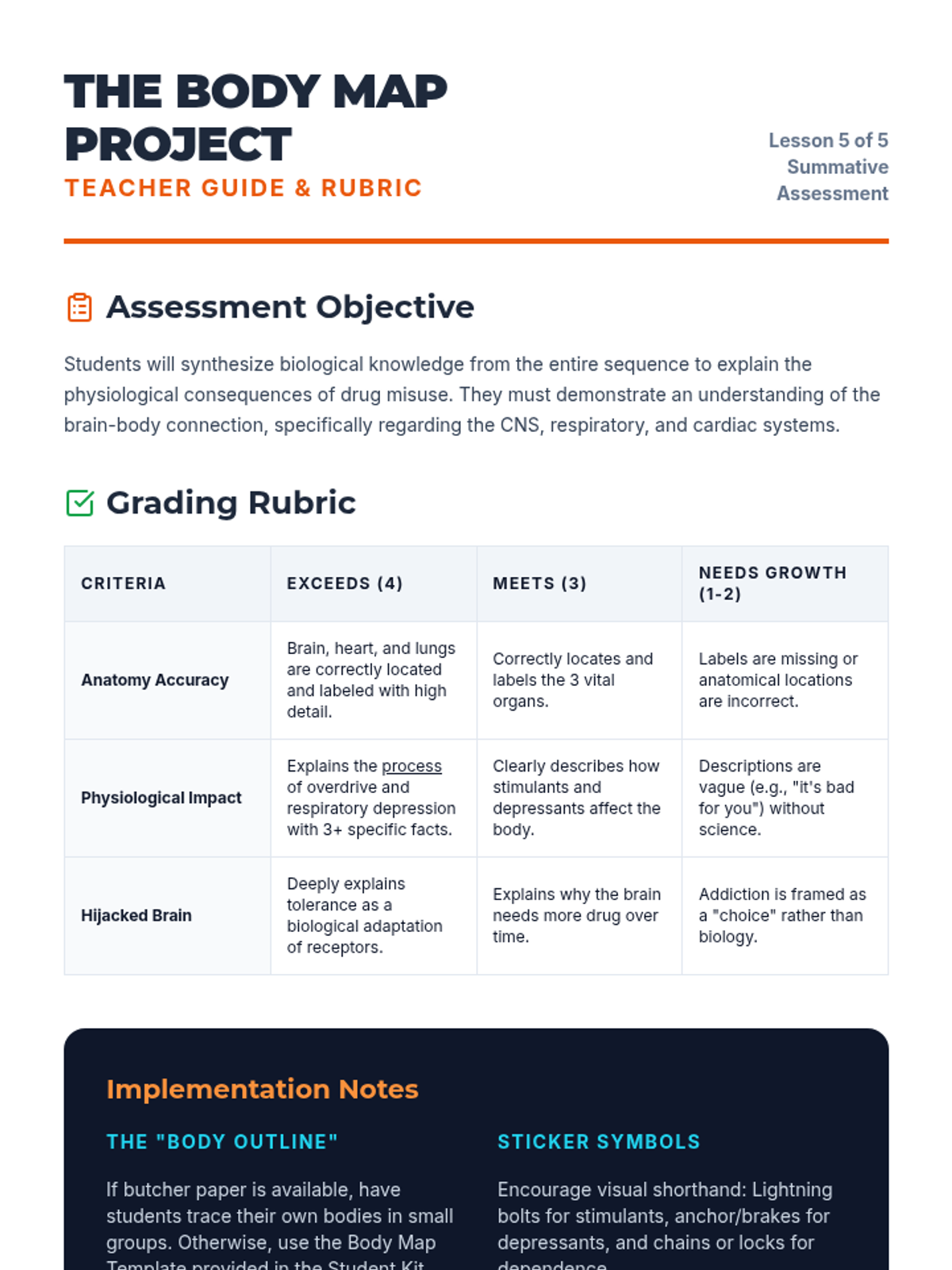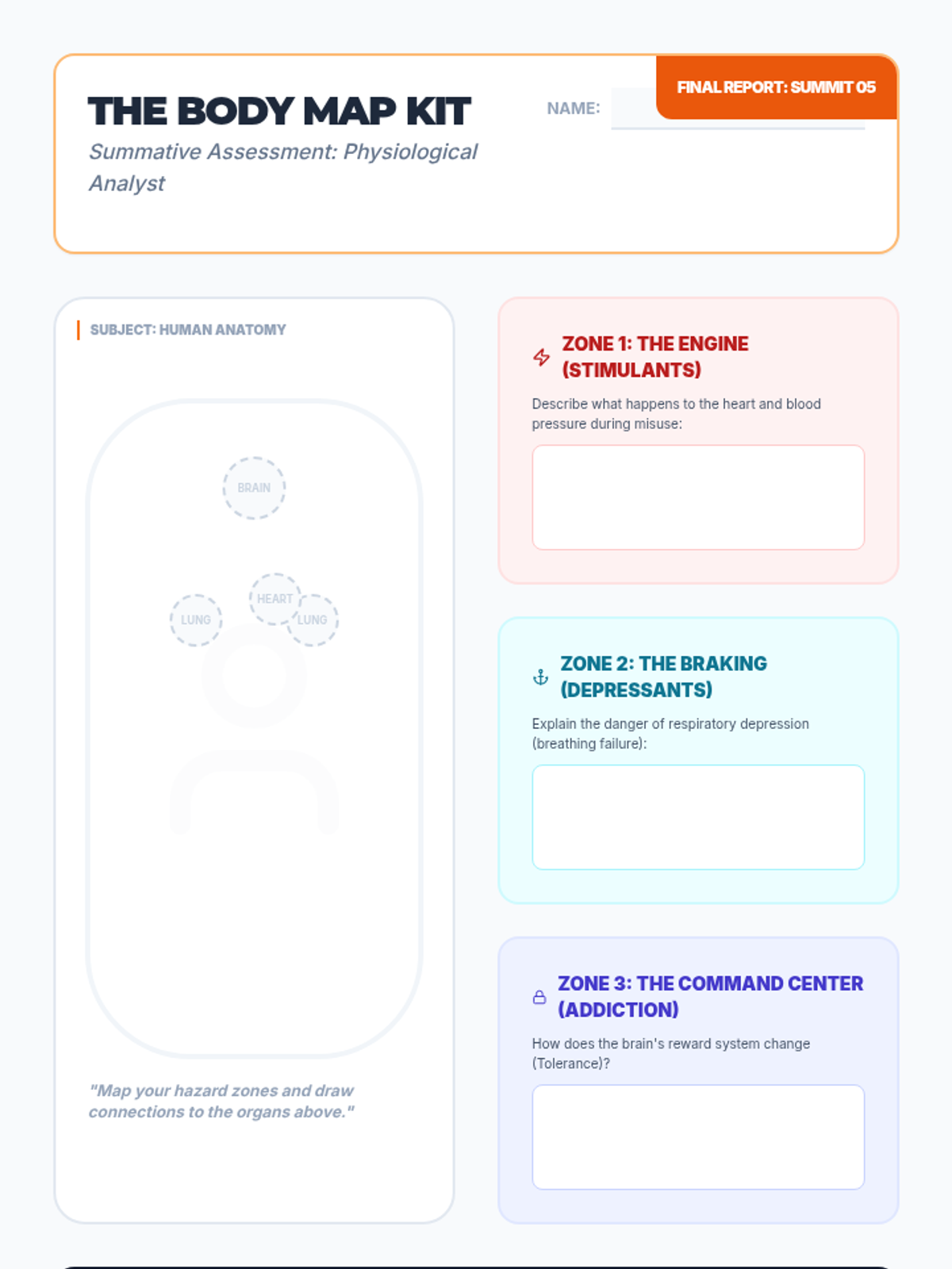 A 5th-grade health sequence exploring the biological impact of prescription drug misuse on the human body. Students investigate how stimulants, depressants, and opioids disrupt the nervous system, heart, and lungs through simulations and inquiry-based activities.