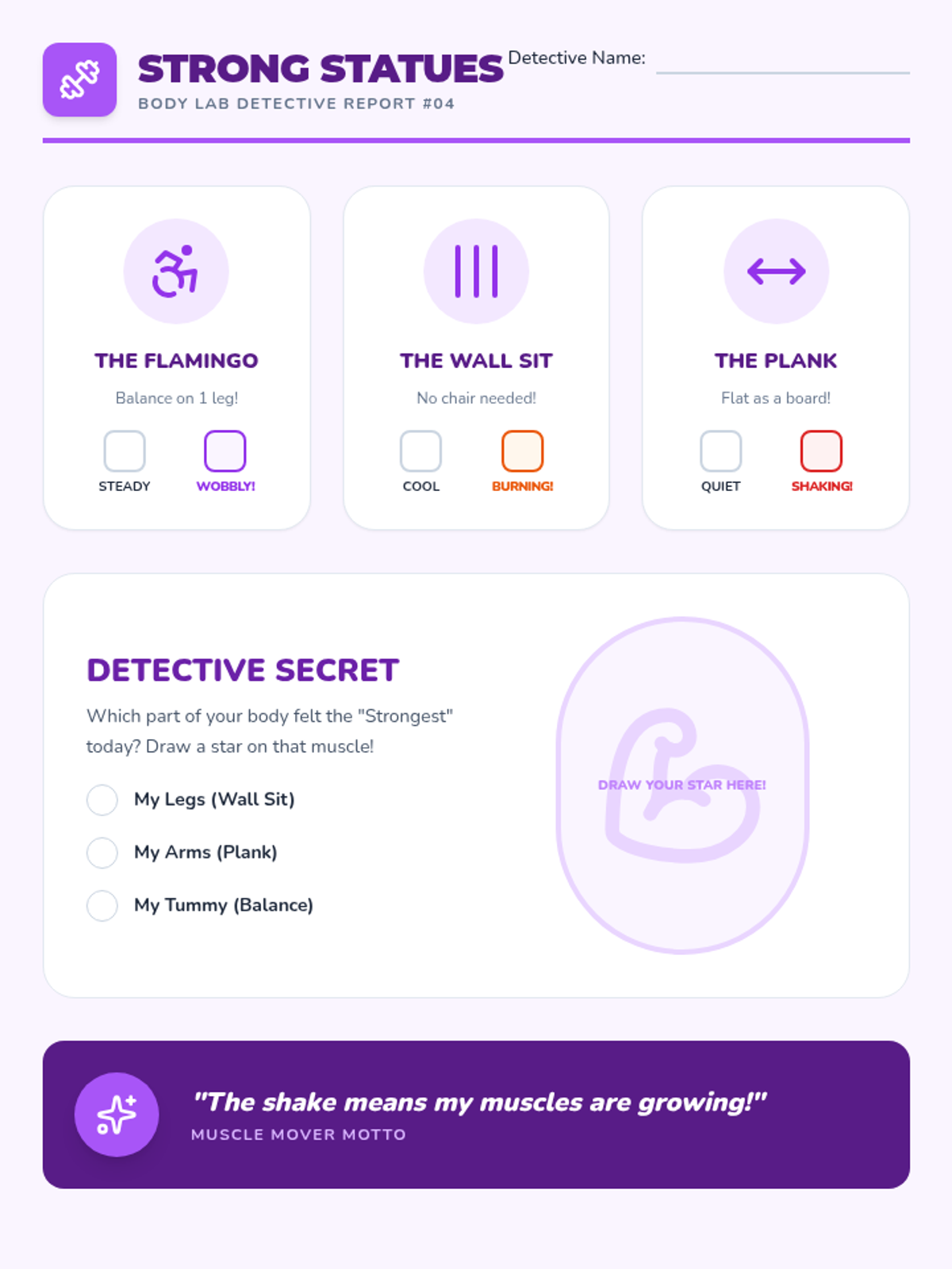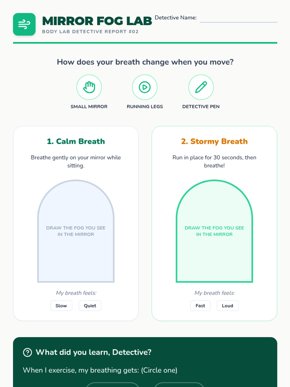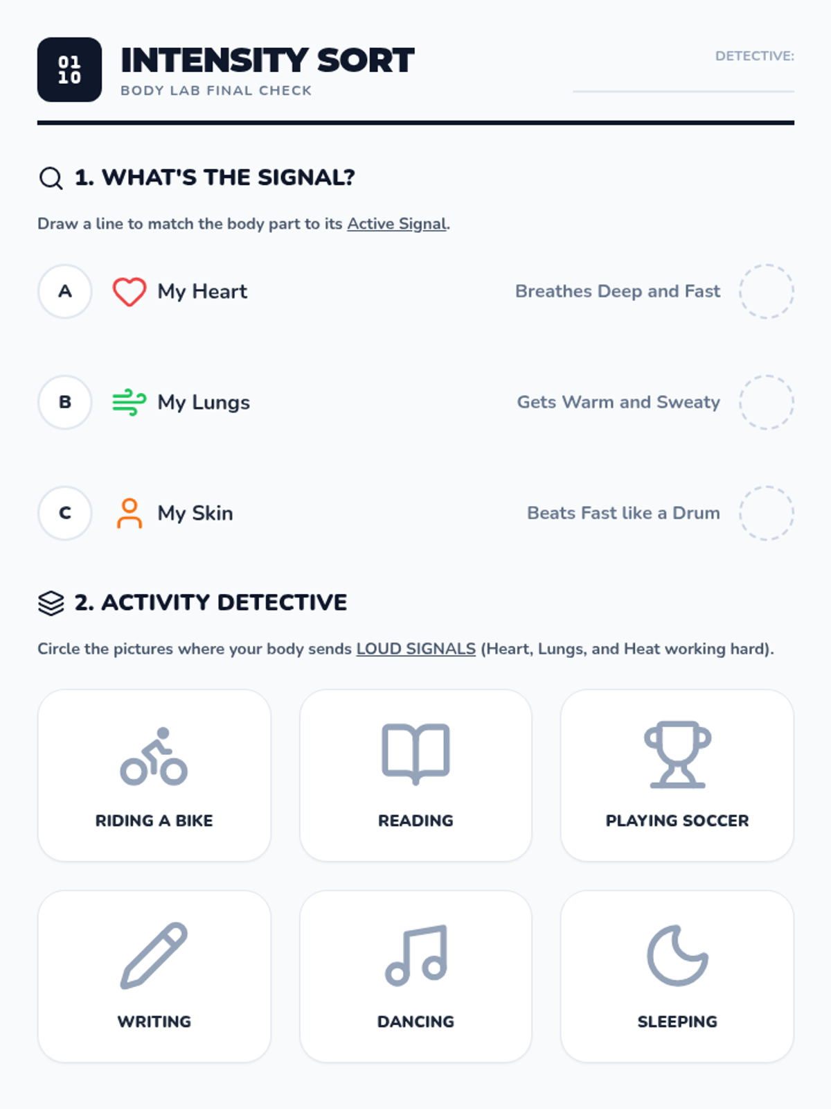 A 1st-grade health sequence that transforms students into 'Body Lab Detectives' to explore how exercise changes the heart, lungs, temperature, and muscles. Through hands-on inquiry, students learn to recognize the signals of physical exertion.