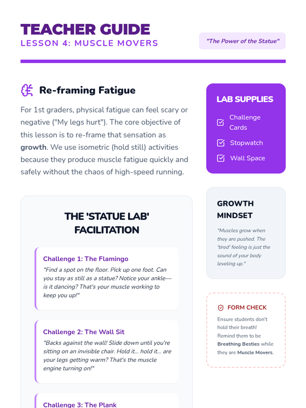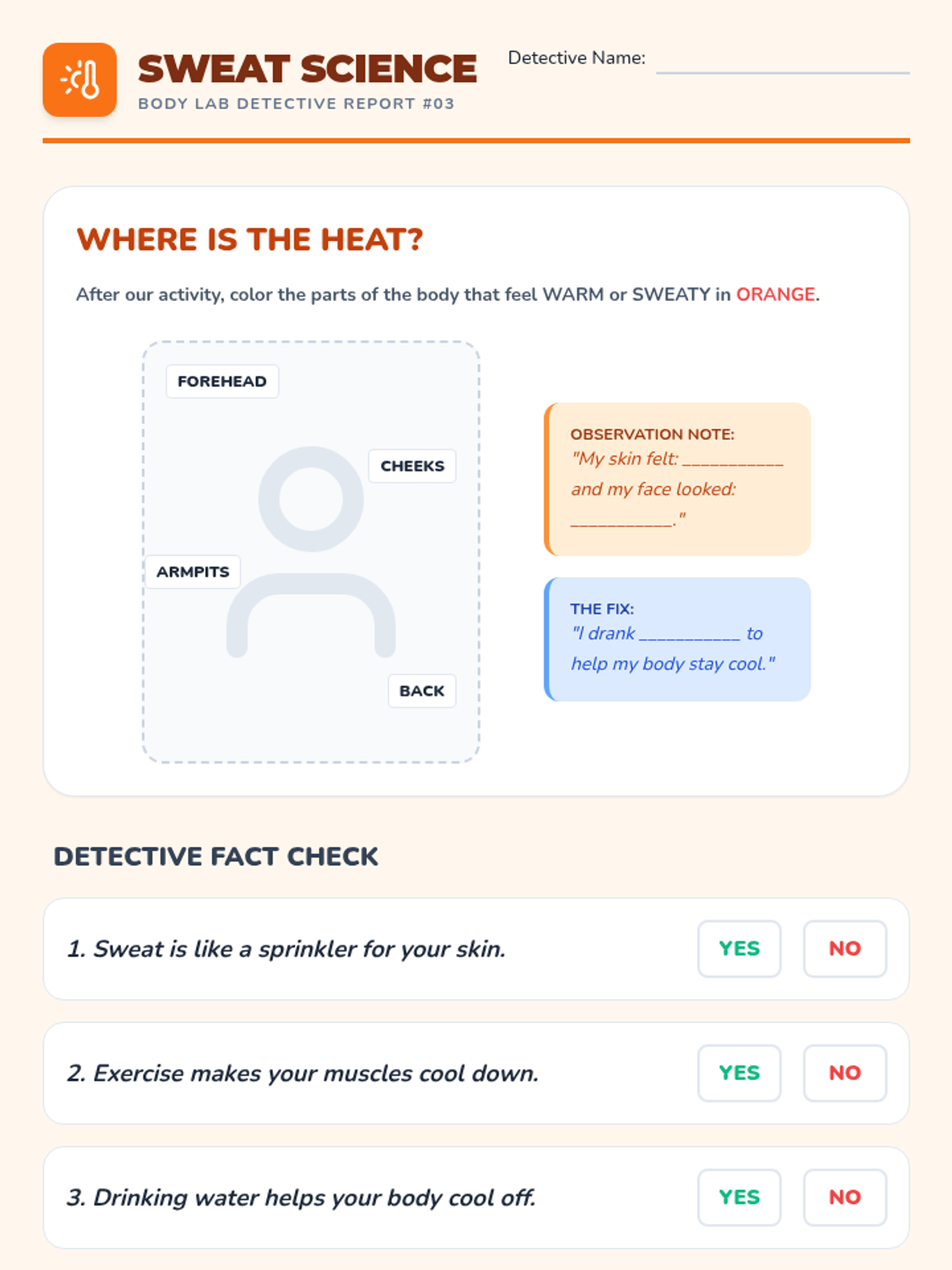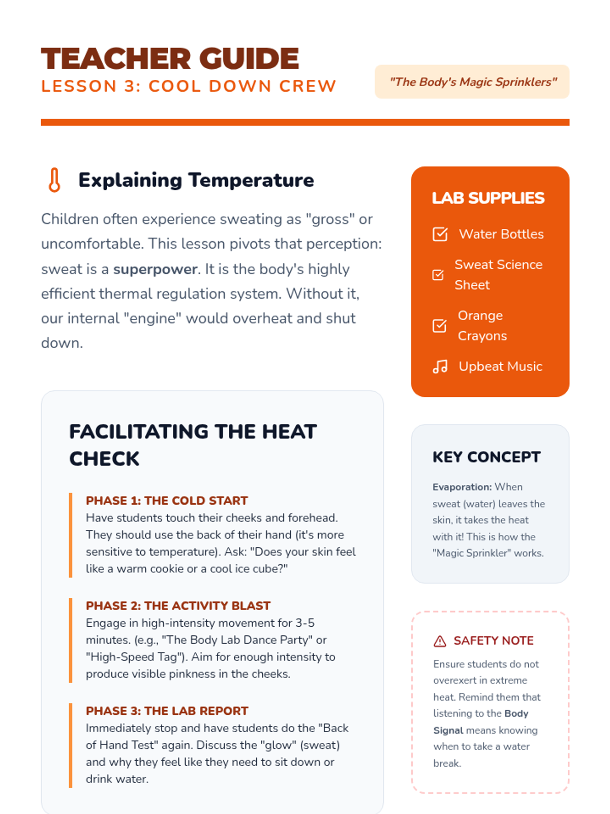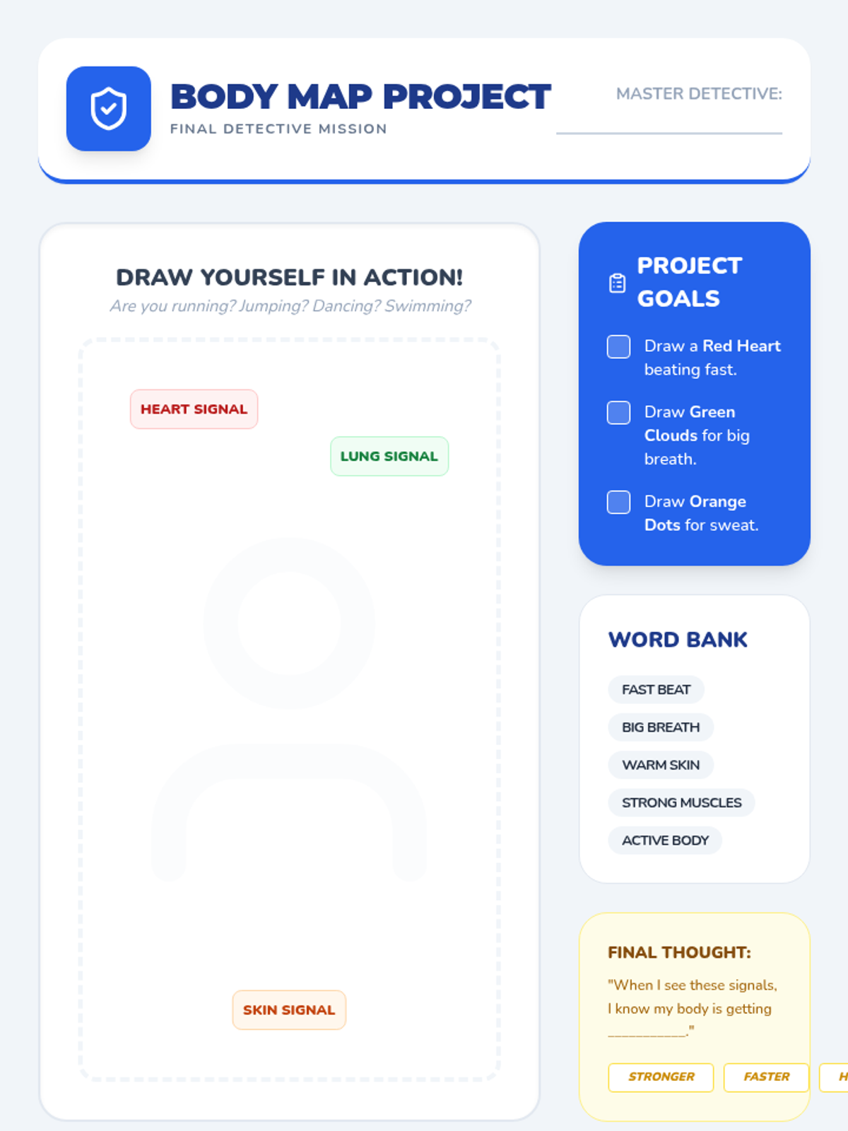 A 1st-grade health sequence that transforms students into 'Body Lab Detectives' to explore how exercise changes the heart, lungs, temperature, and muscles. Through hands-on inquiry, students learn to recognize the signals of physical exertion.