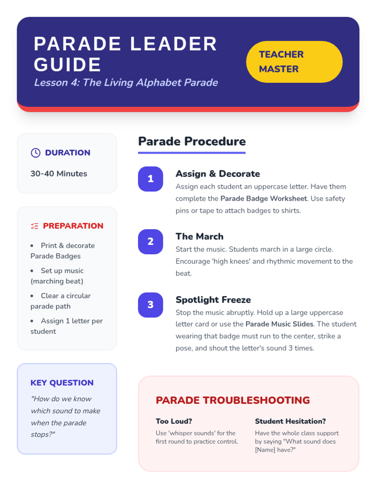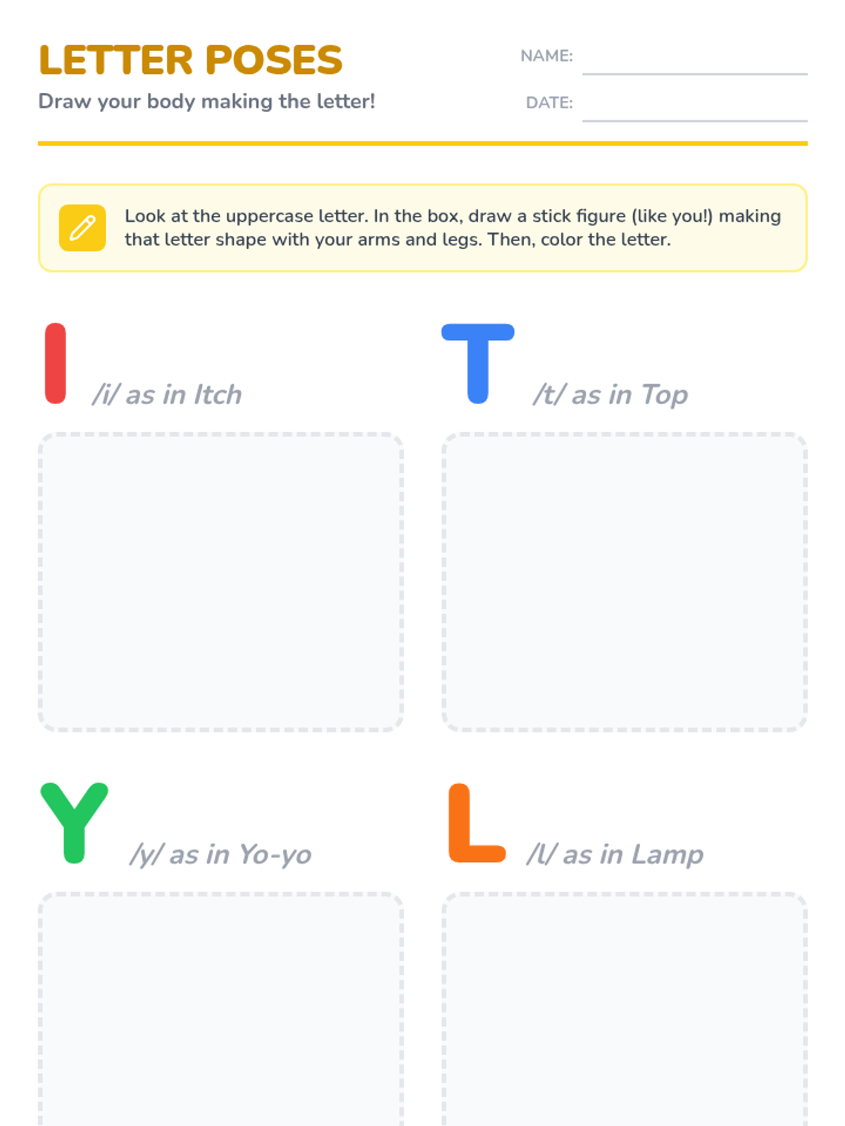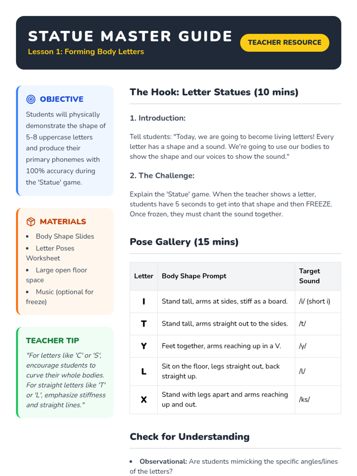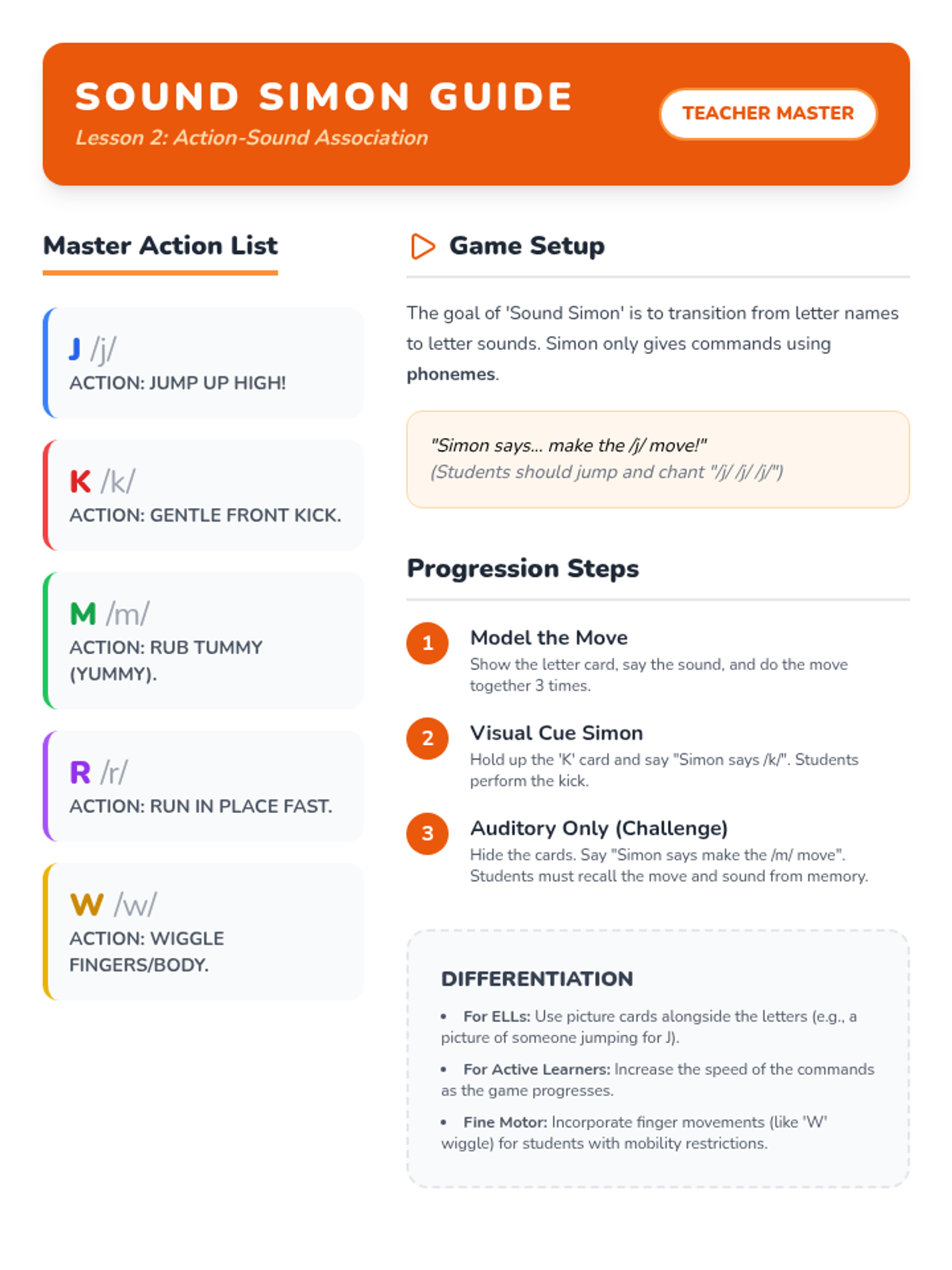 A Kindergarten phonics sequence focusing on uppercase letter-sound correspondence through Total Physical Response (TPR). Students use body movements, actions, and games to internalize letter shapes and their associated phonemes.