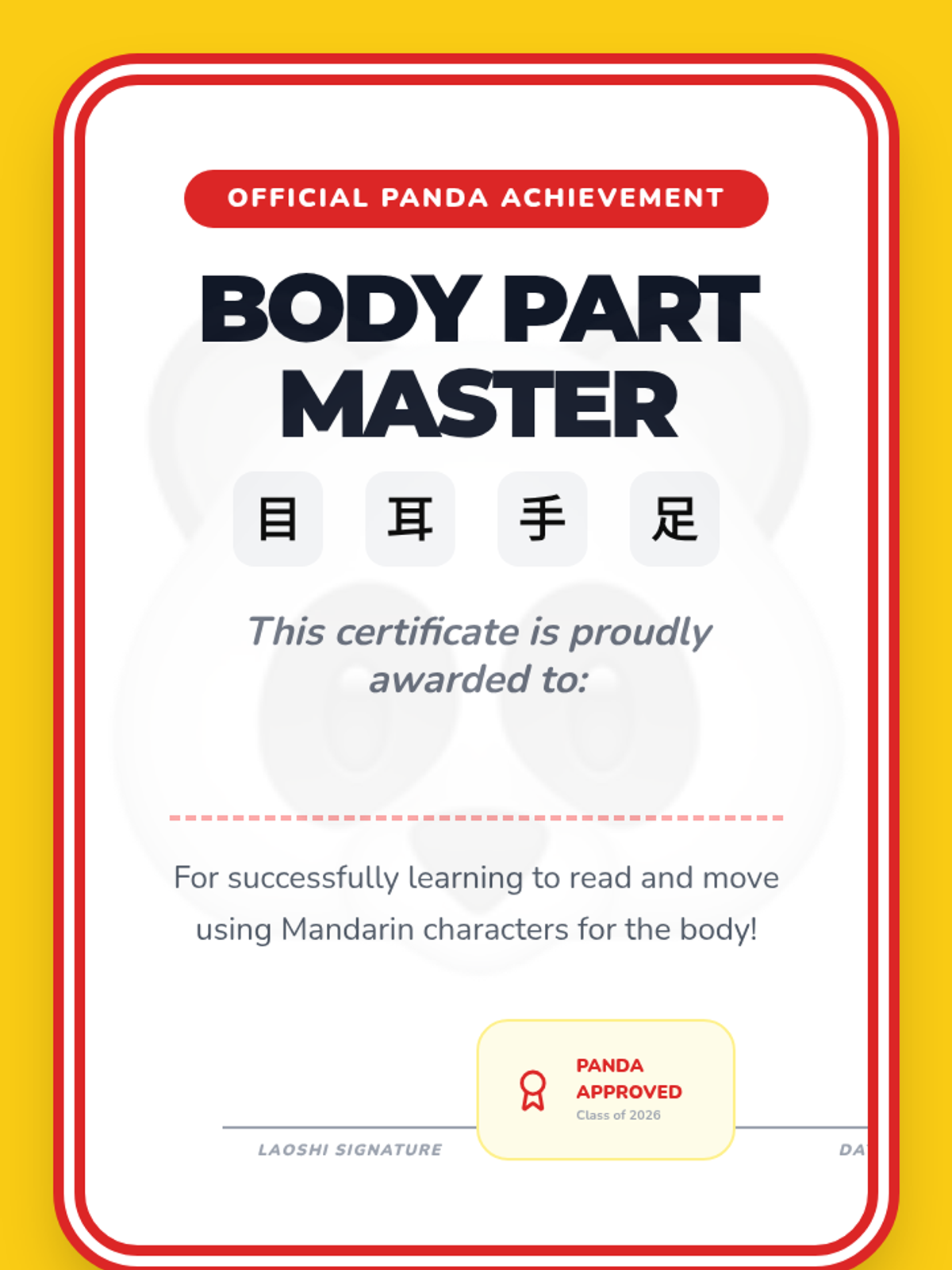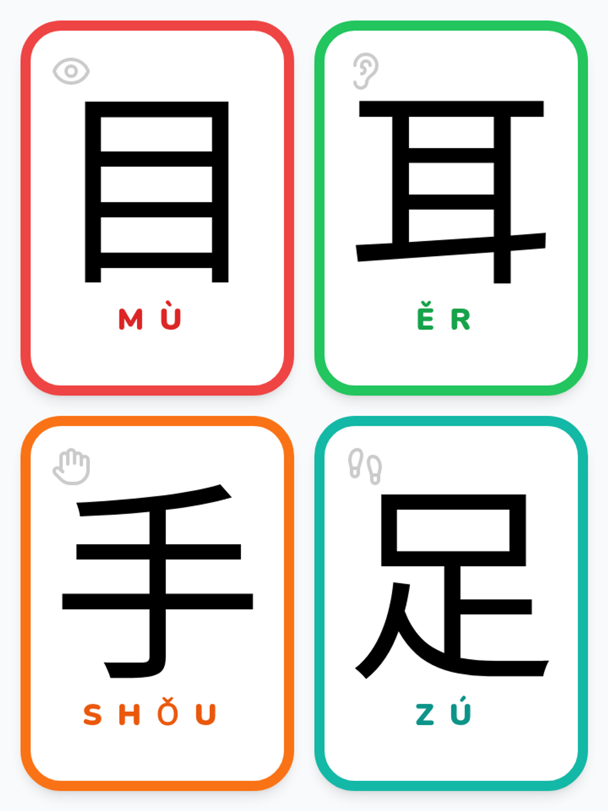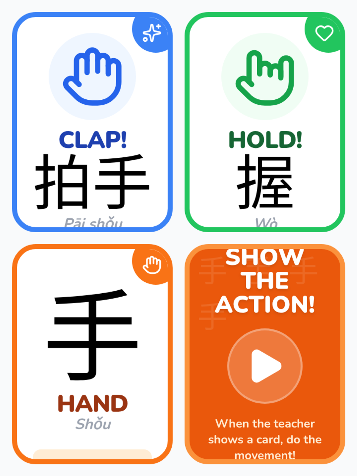 A Kindergarten sequence connecting Mandarin Chinese characters for body parts (Eye, Ear, Hand, Foot) to physical movement and creative play. Students use Total Physical Response (TPR) and project-based learning to build a foundational vocabulary of characters.