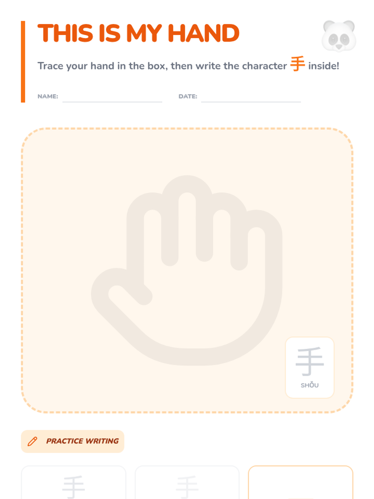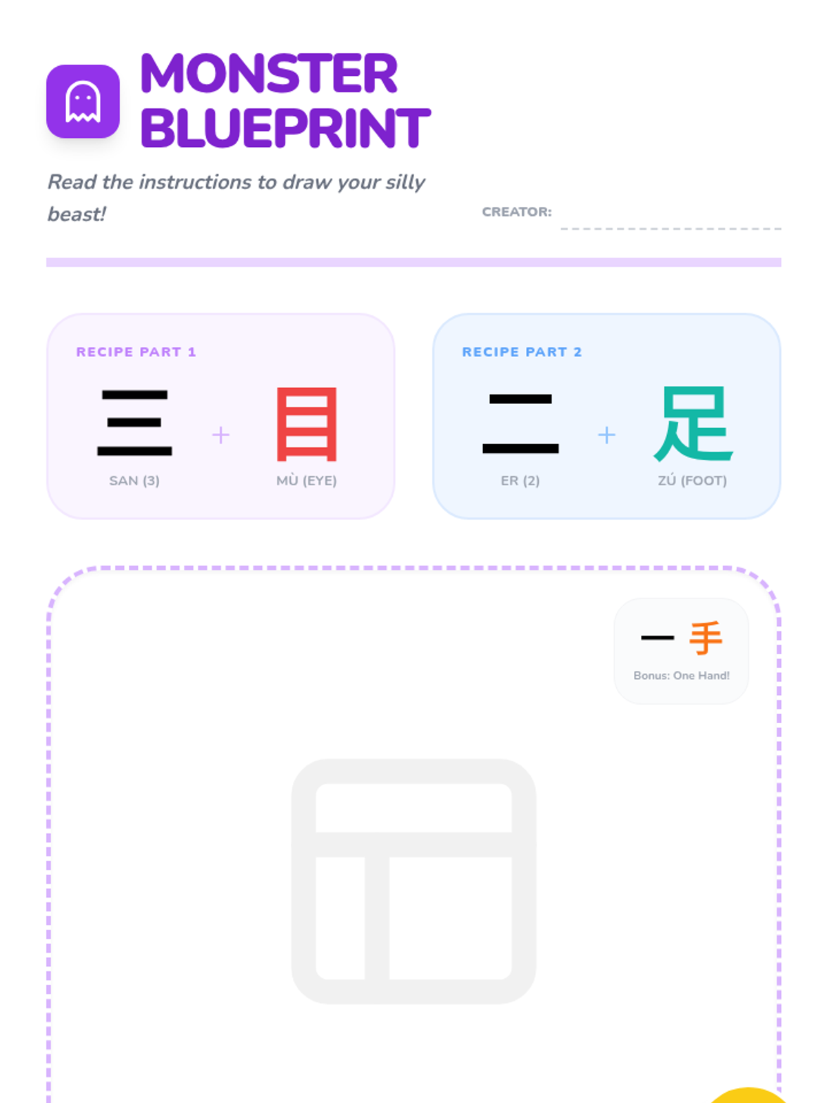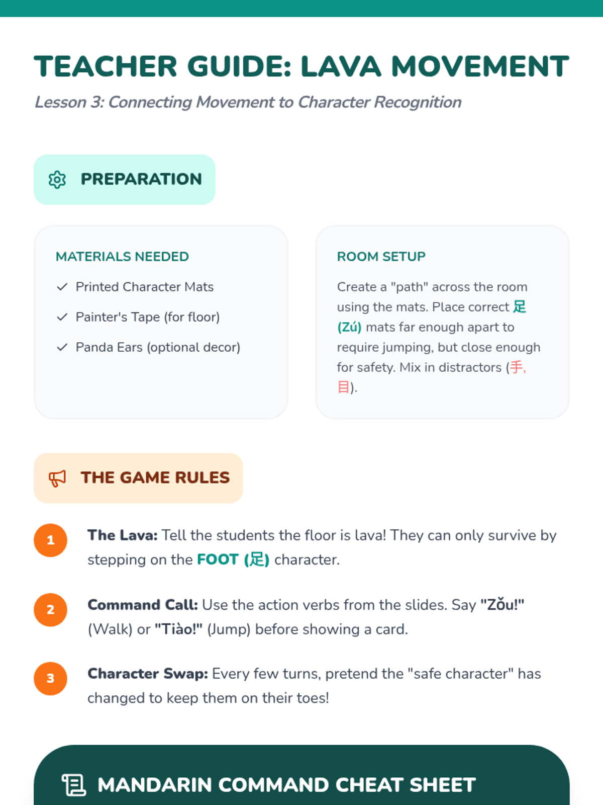 A Kindergarten sequence connecting Mandarin Chinese characters for body parts (Eye, Ear, Hand, Foot) to physical movement and creative play. Students use Total Physical Response (TPR) and project-based learning to build a foundational vocabulary of characters.