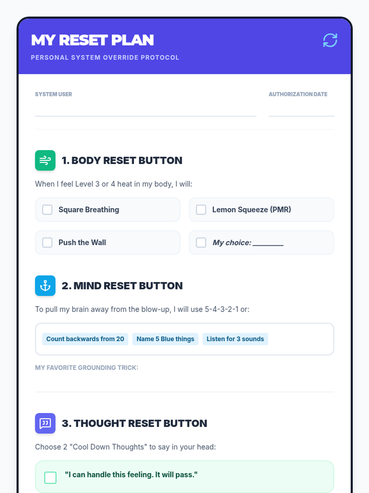 A comprehensive unit for 4th graders to identify internal body signals using a 'Blow-up Meter' metaphor and applying CBT-based strategies (breathing, grounding, and coping talk) to manage dysregulation.