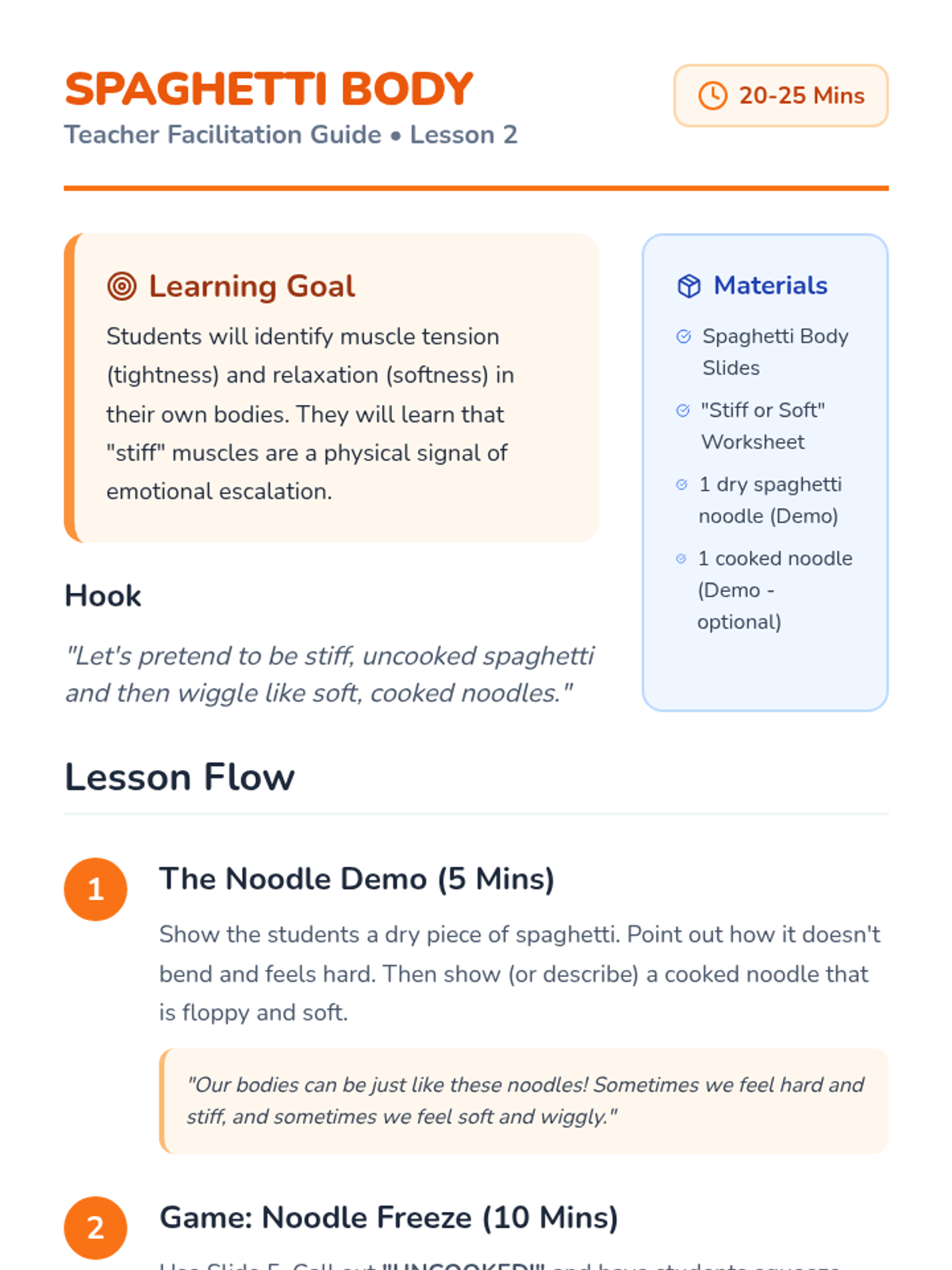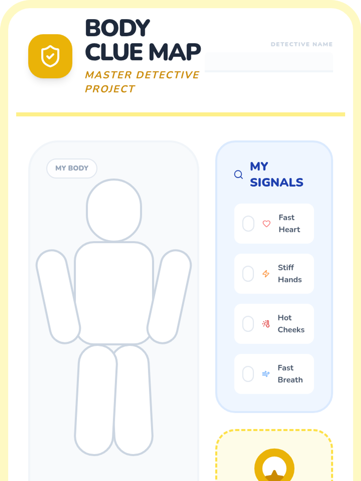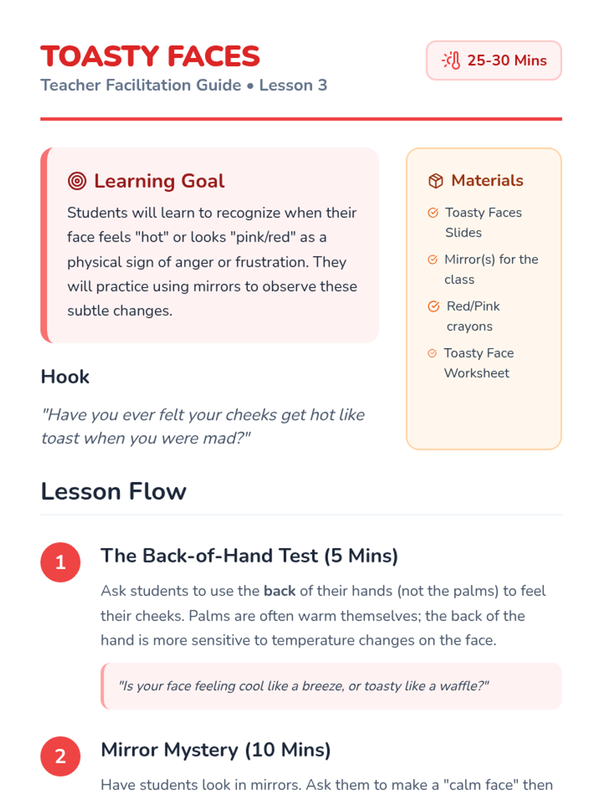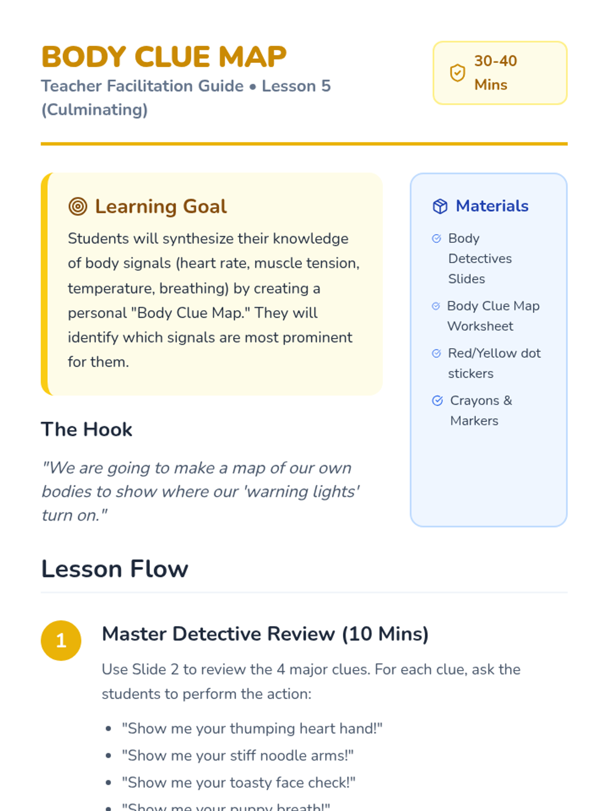 A Pre-K sequence focused on interoception and identifying physical signals of emotional escalation. Students learn to recognize heart rate changes, muscle tension, temperature shifts, and breathing patterns as 'body clues' for big feelings.