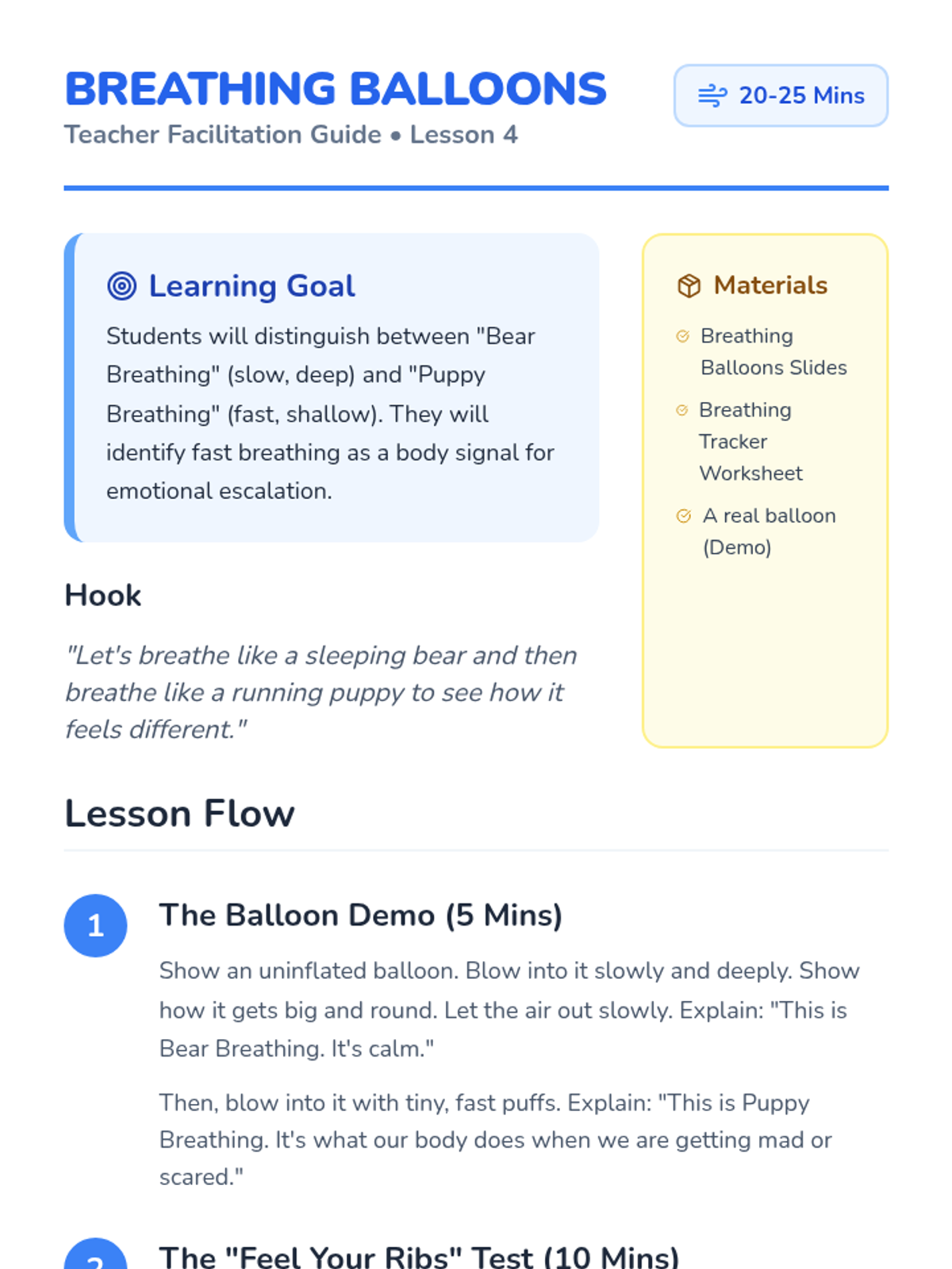 An 8-week social-emotional learning curriculum designed for 20-minute sessions. Students learn to identify, categorize, and apply coping skills through a blueprint-inspired framework of self-regulation.