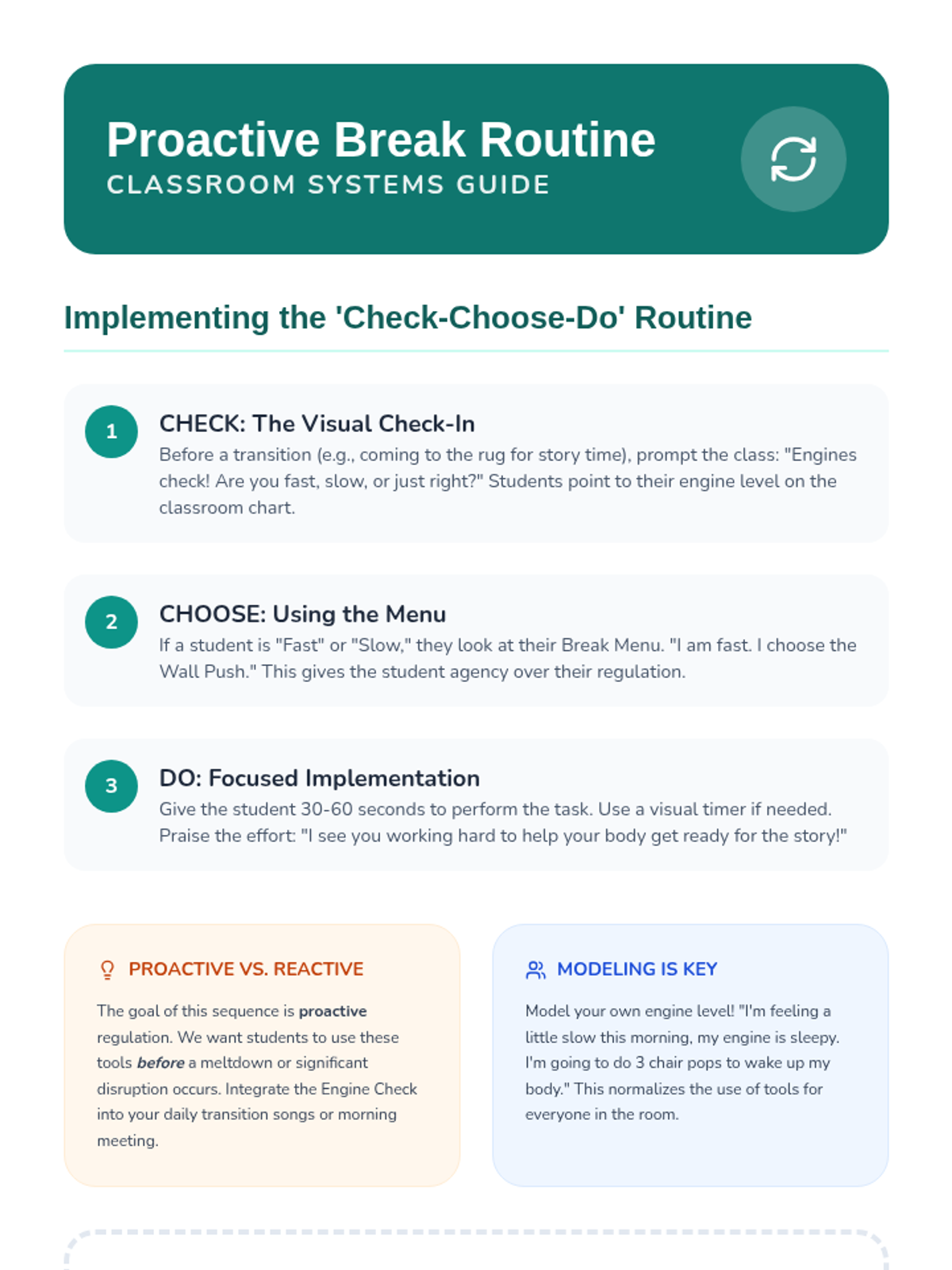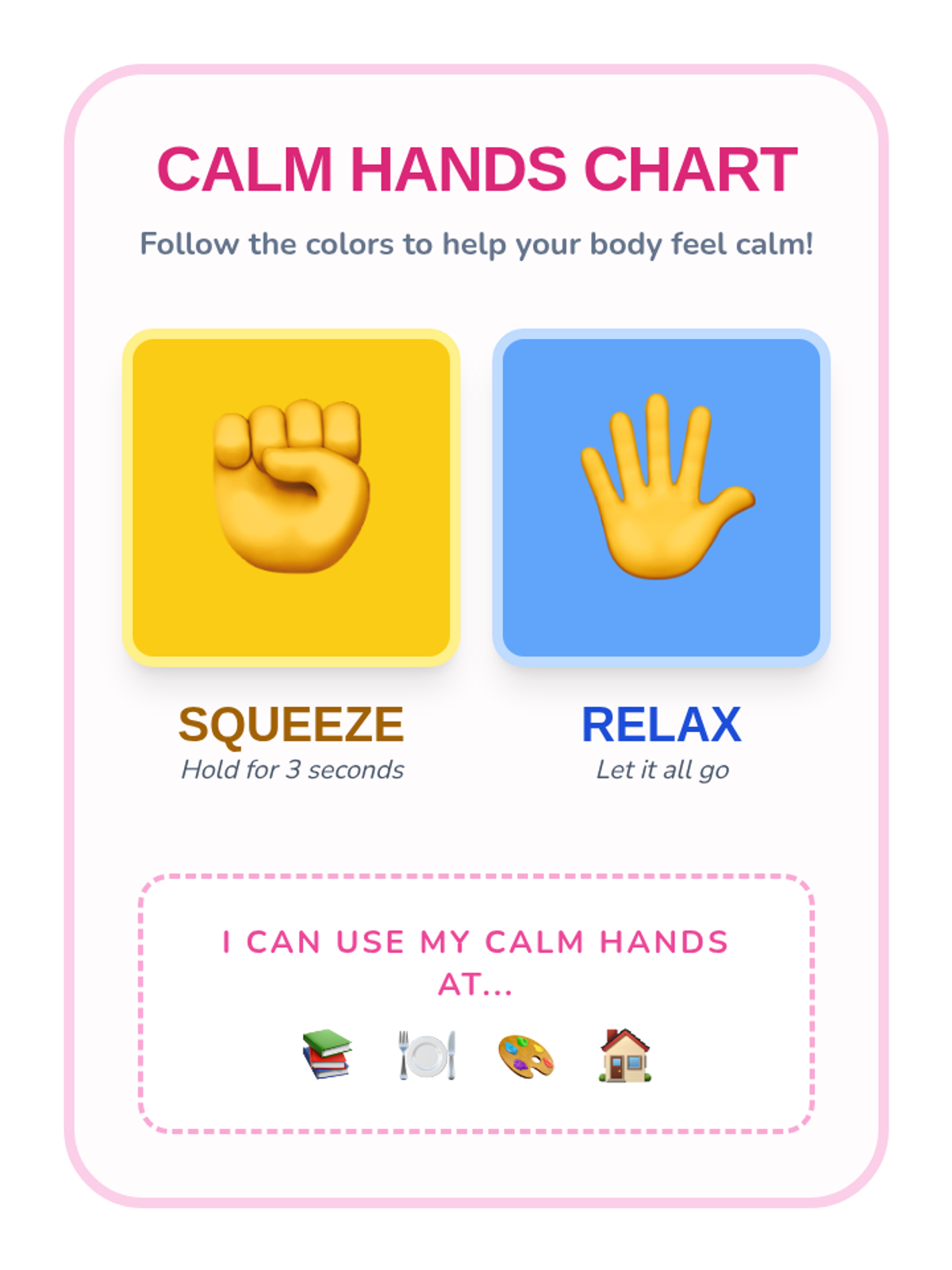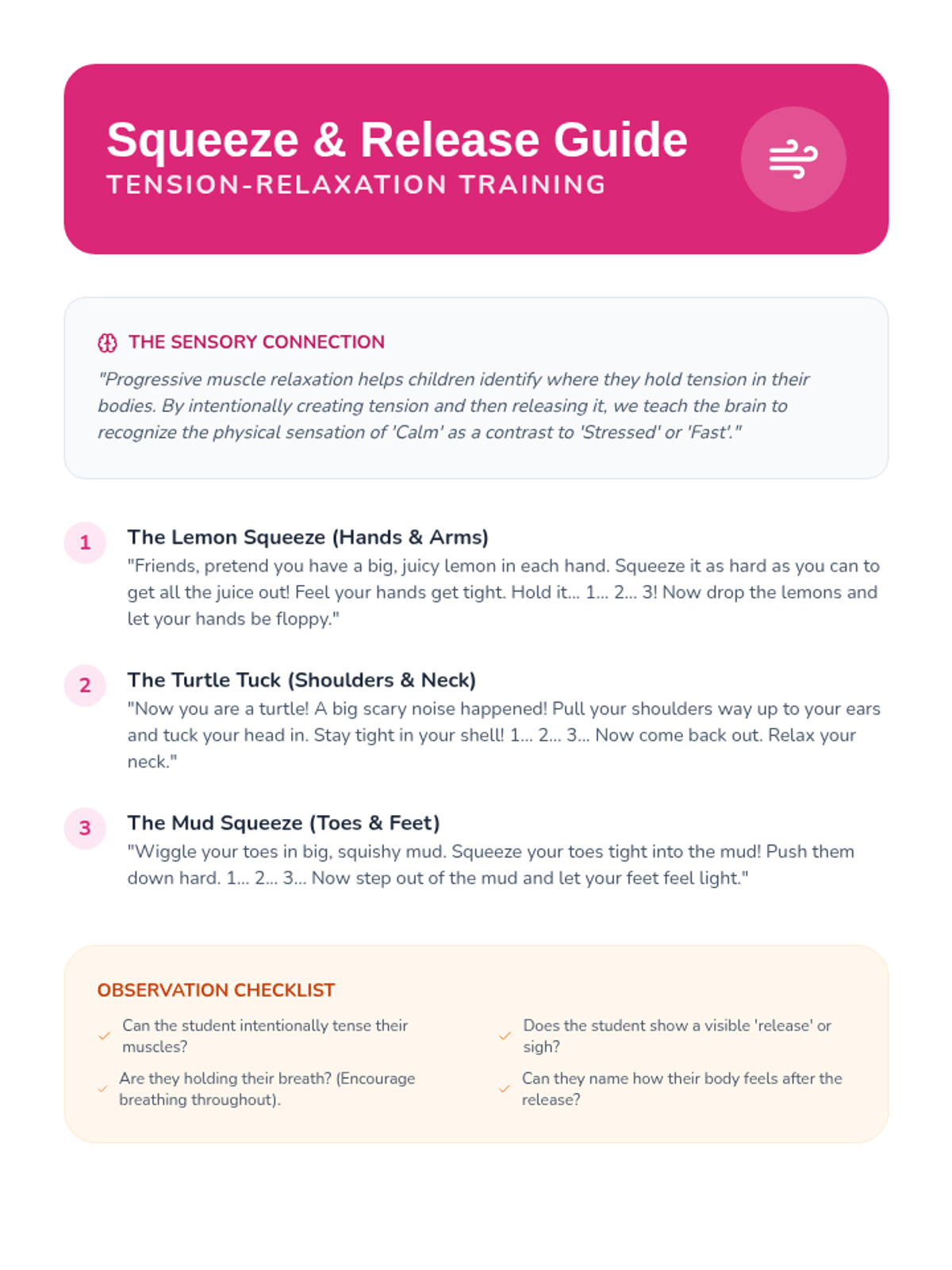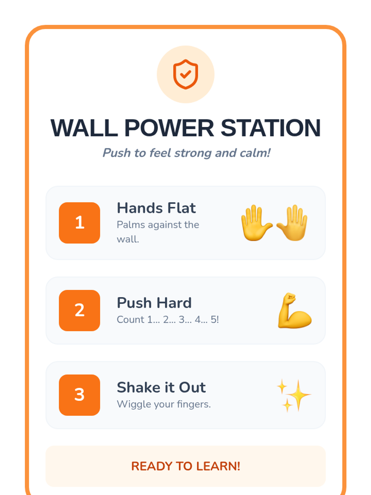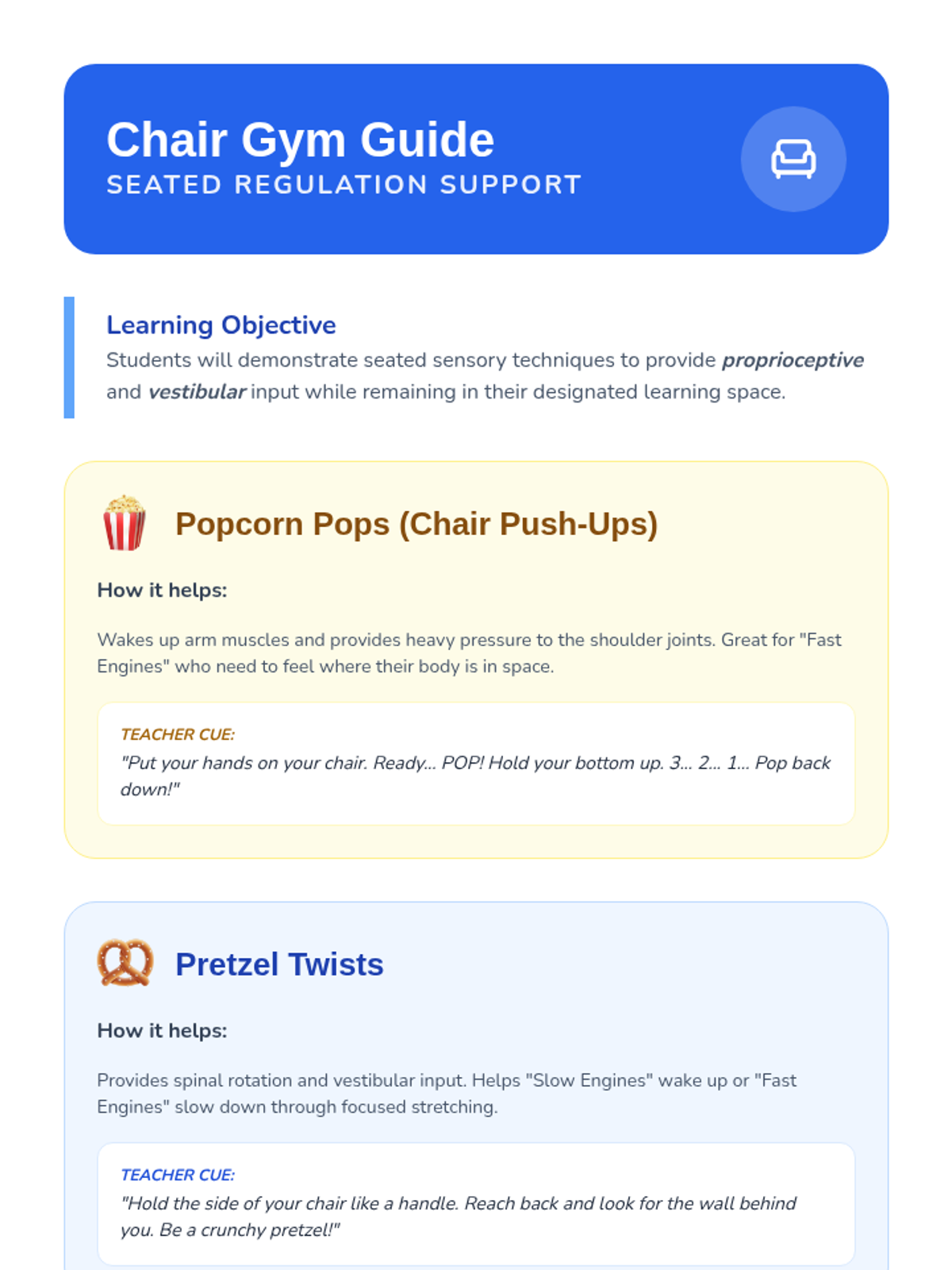 A Pre-K sequence focused on identifying body energy levels and learning proactive sensory regulation techniques like wall pushes, chair pops, and squeeze-and-release exercises. Students build a visual 'Sensory Toolbox' to manage their energy levels effectively throughout the school day.