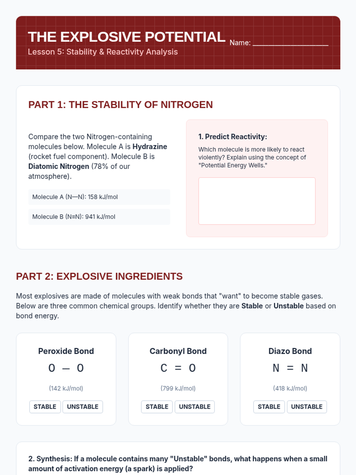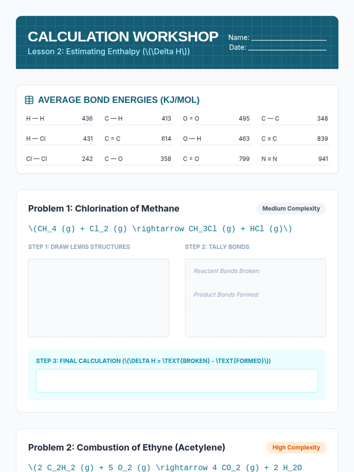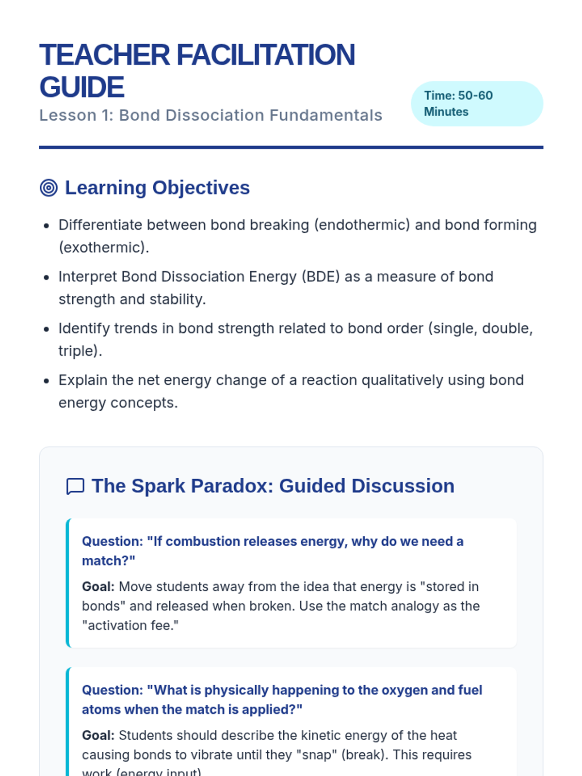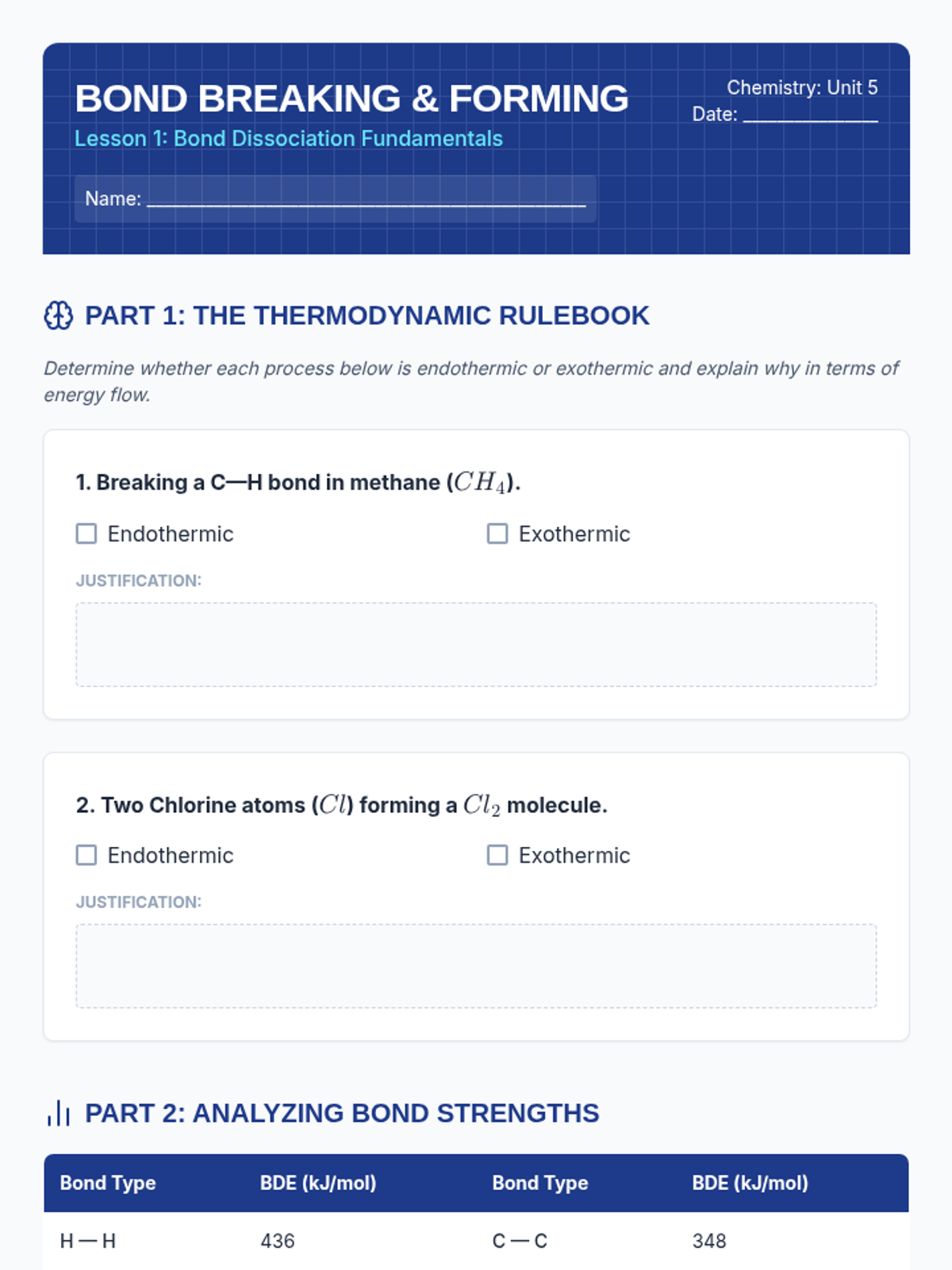 This 12th-grade chemistry sequence explores the relationship between chemical bond strength and reaction energy. Students move from understanding the microscopic energy of bond breaking and forming to predicting the macroscopic enthalpy changes of fuel combustion and molecular stability.