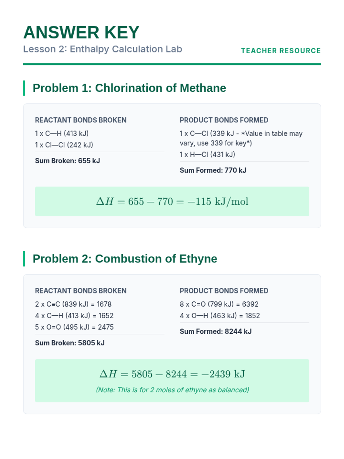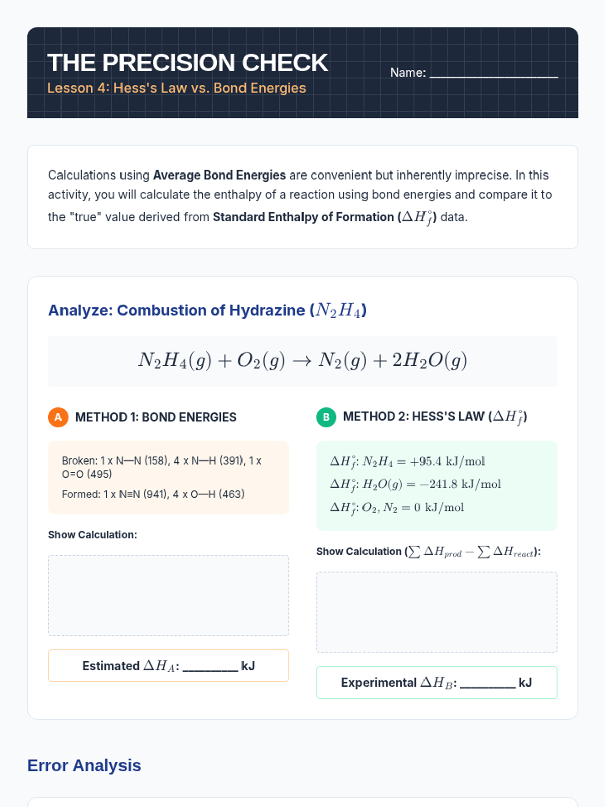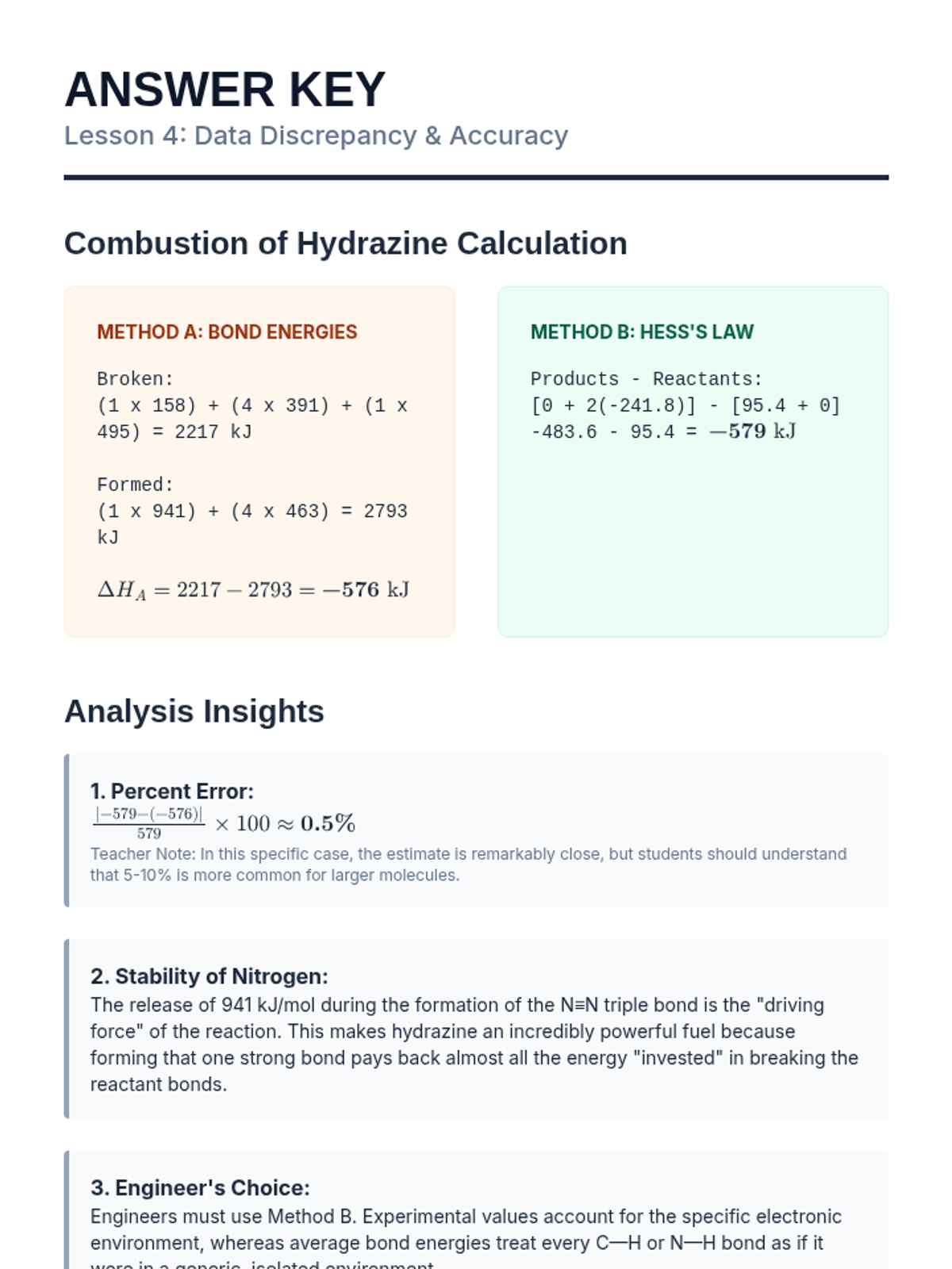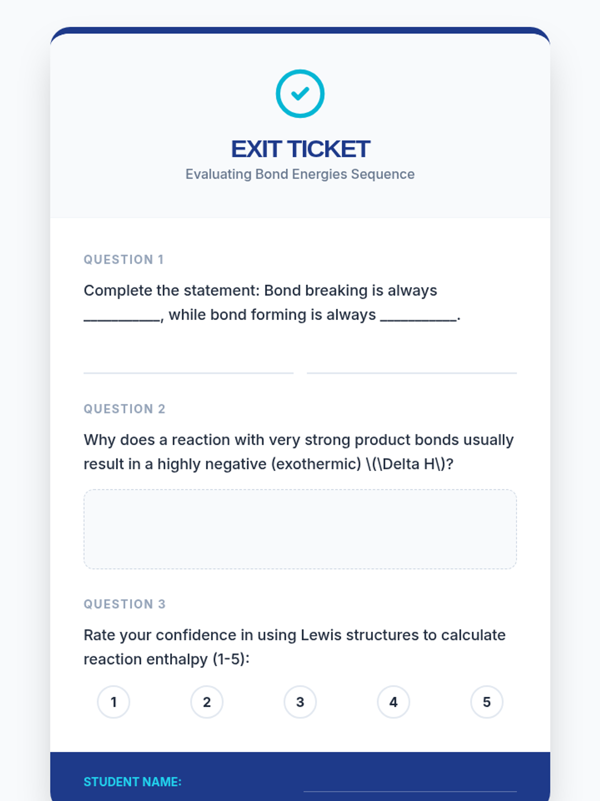 This 12th-grade chemistry sequence explores the relationship between chemical bond strength and reaction energy. Students move from understanding the microscopic energy of bond breaking and forming to predicting the macroscopic enthalpy changes of fuel combustion and molecular stability.