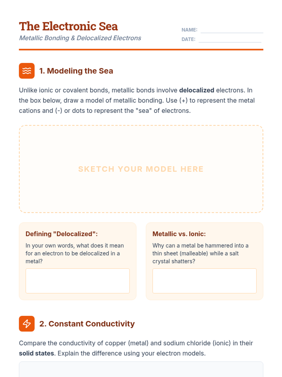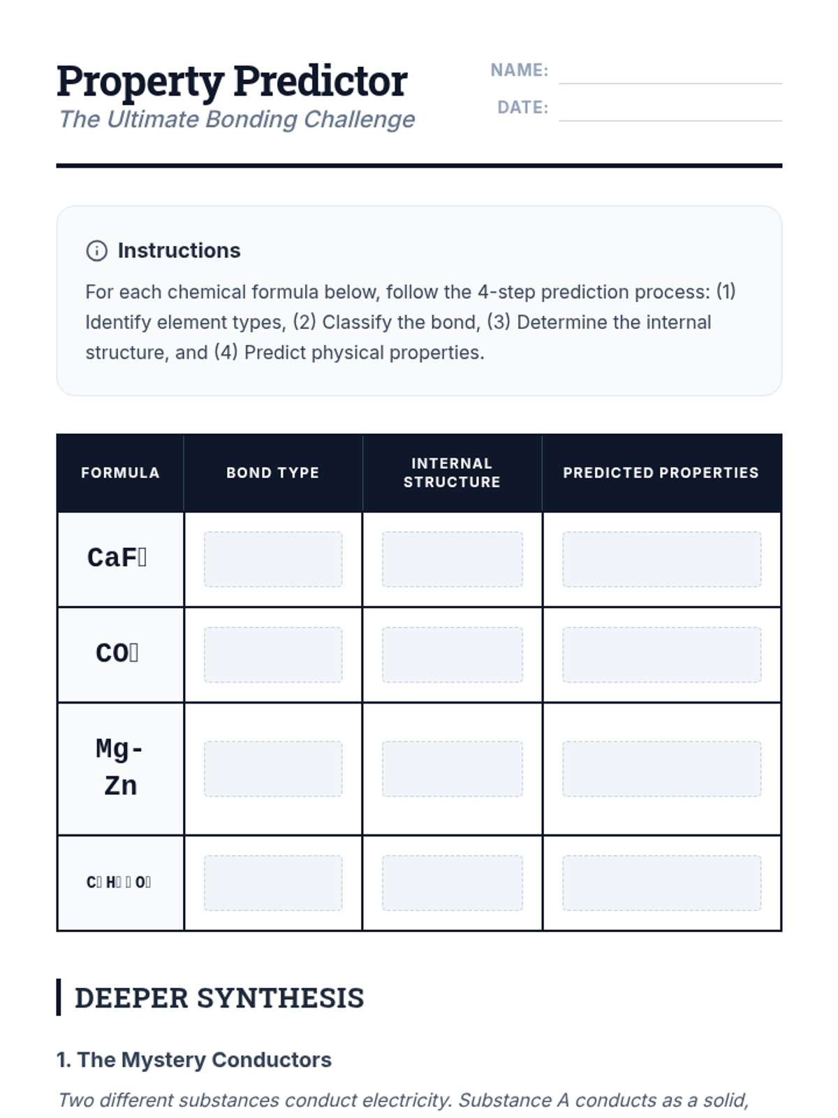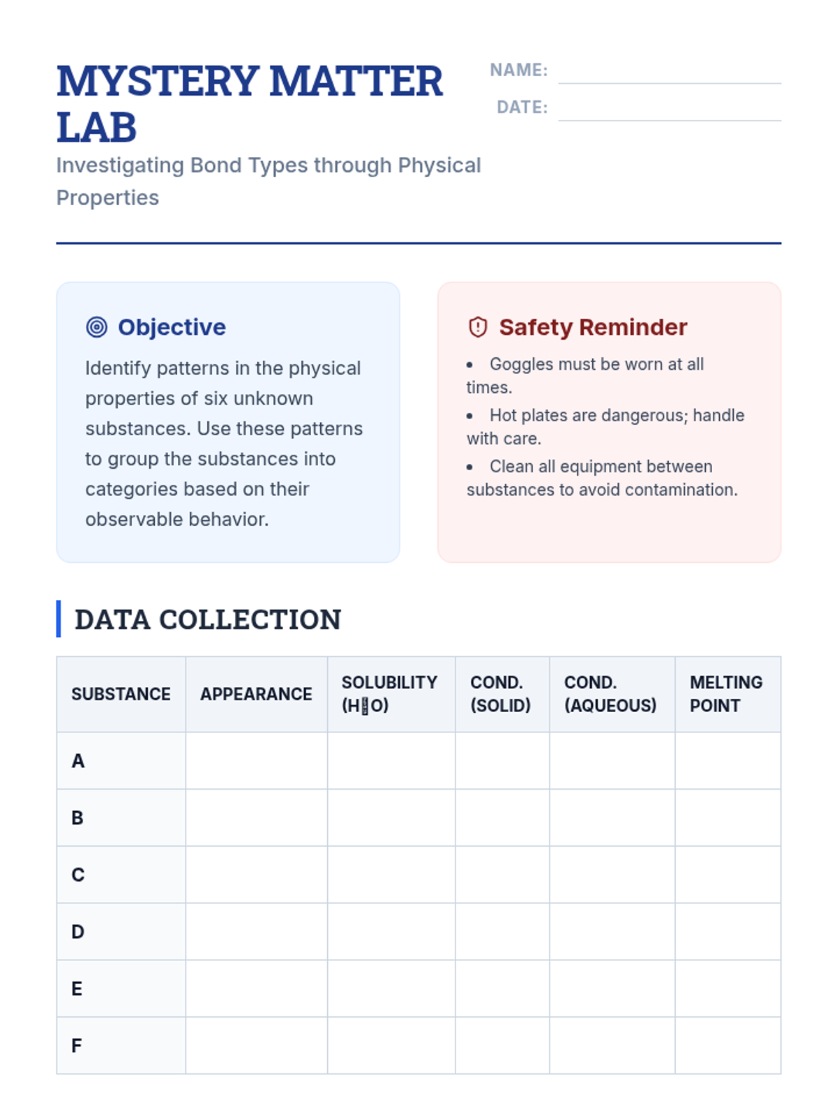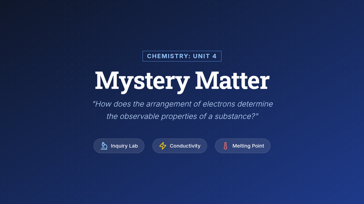 This inquiry-driven chemistry sequence guides students through discovering ionic, covalent, and metallic bonds by investigating macroscopic properties. Students bridge the gap between observable phenomena (conductivity, melting point) and microscopic electron arrangements to predict the behavior of unknown substances.