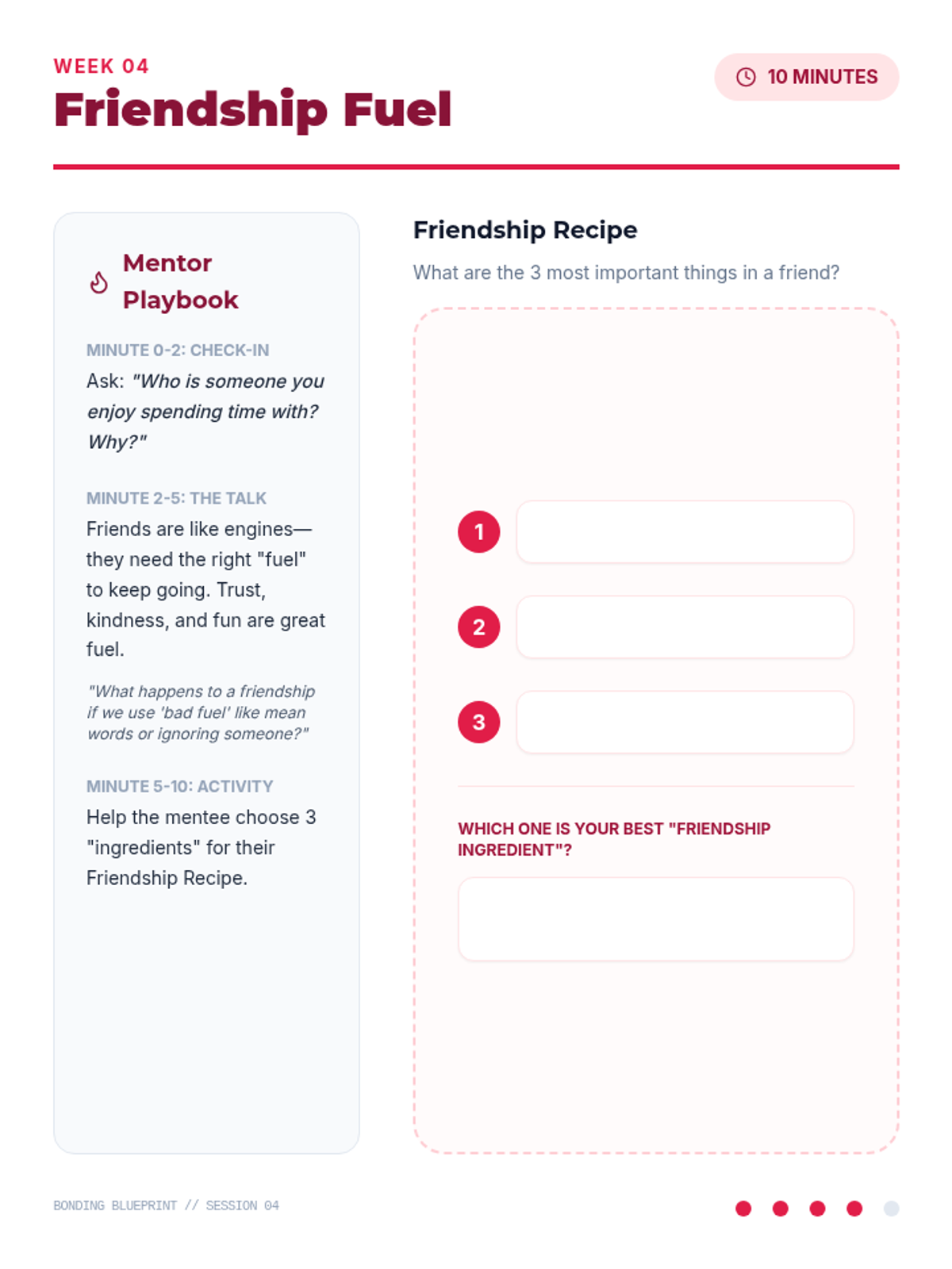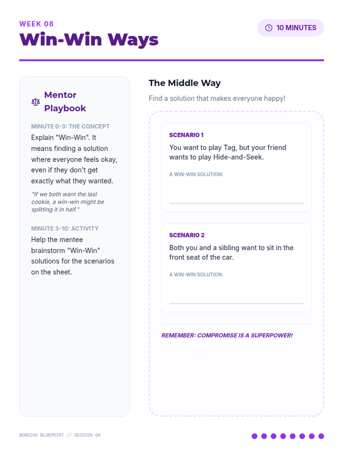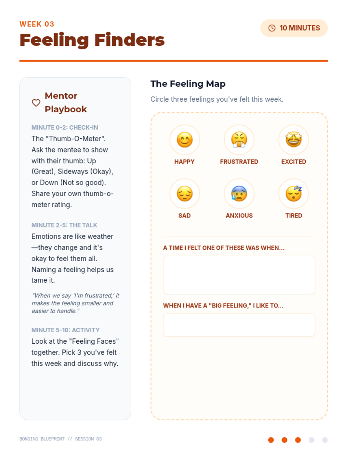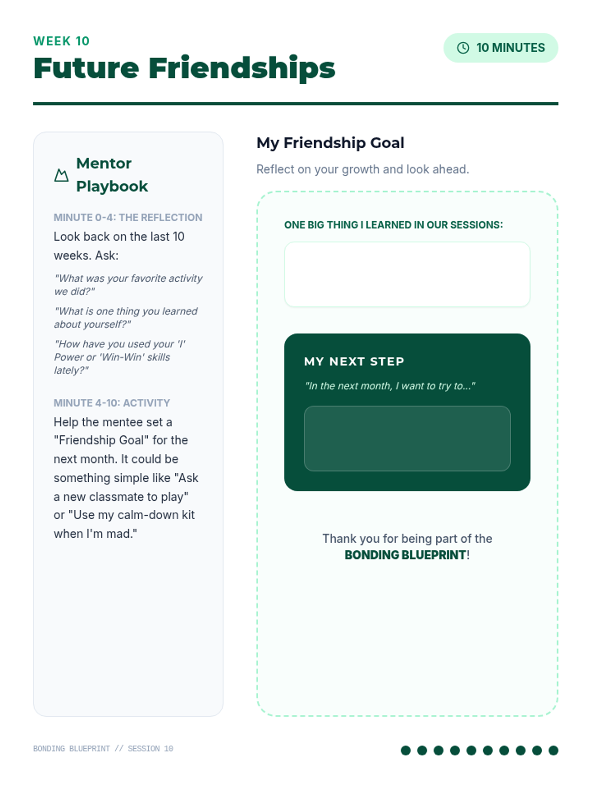 A 10-week mentorship program designed for short, 10-minute sessions focusing on friendship, conflict resolution, and coping skills. The sequence provides structured but flexible activities to build a strong mentor-mentee relationship while developing essential social-emotional skills.