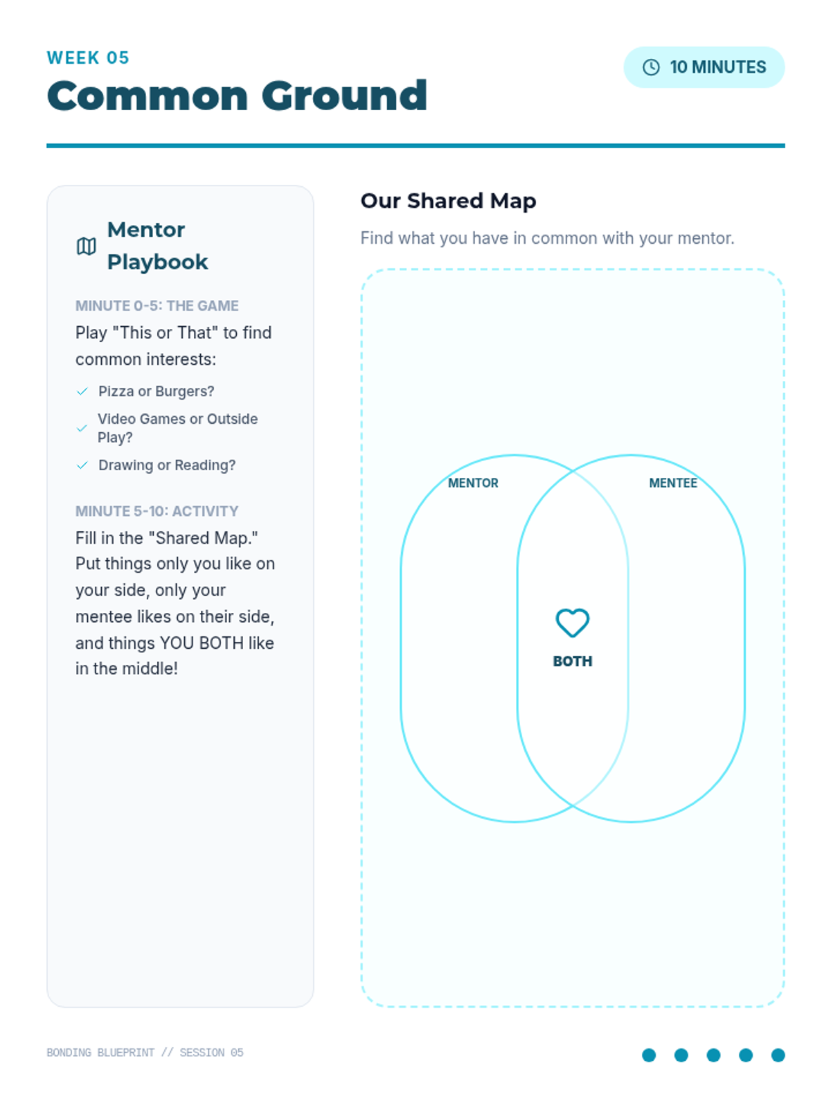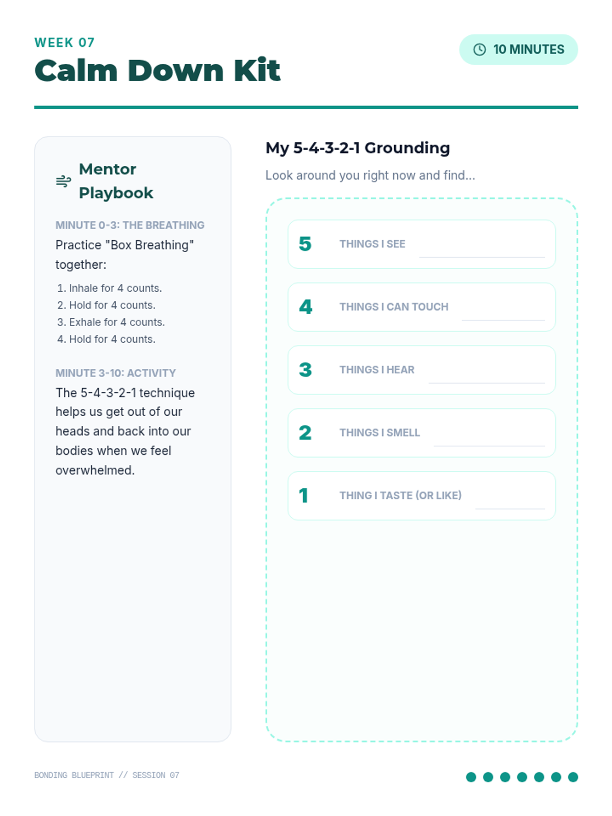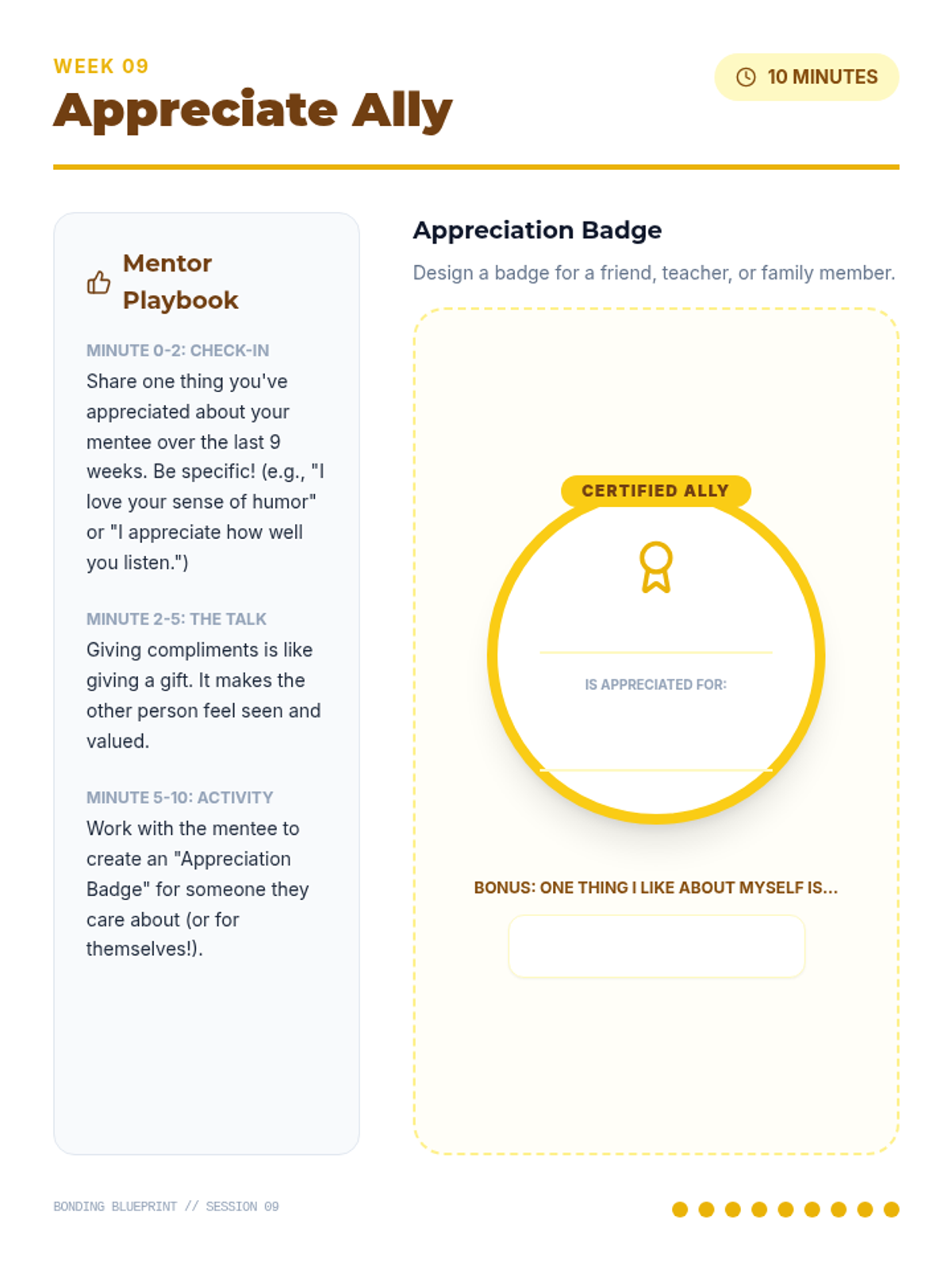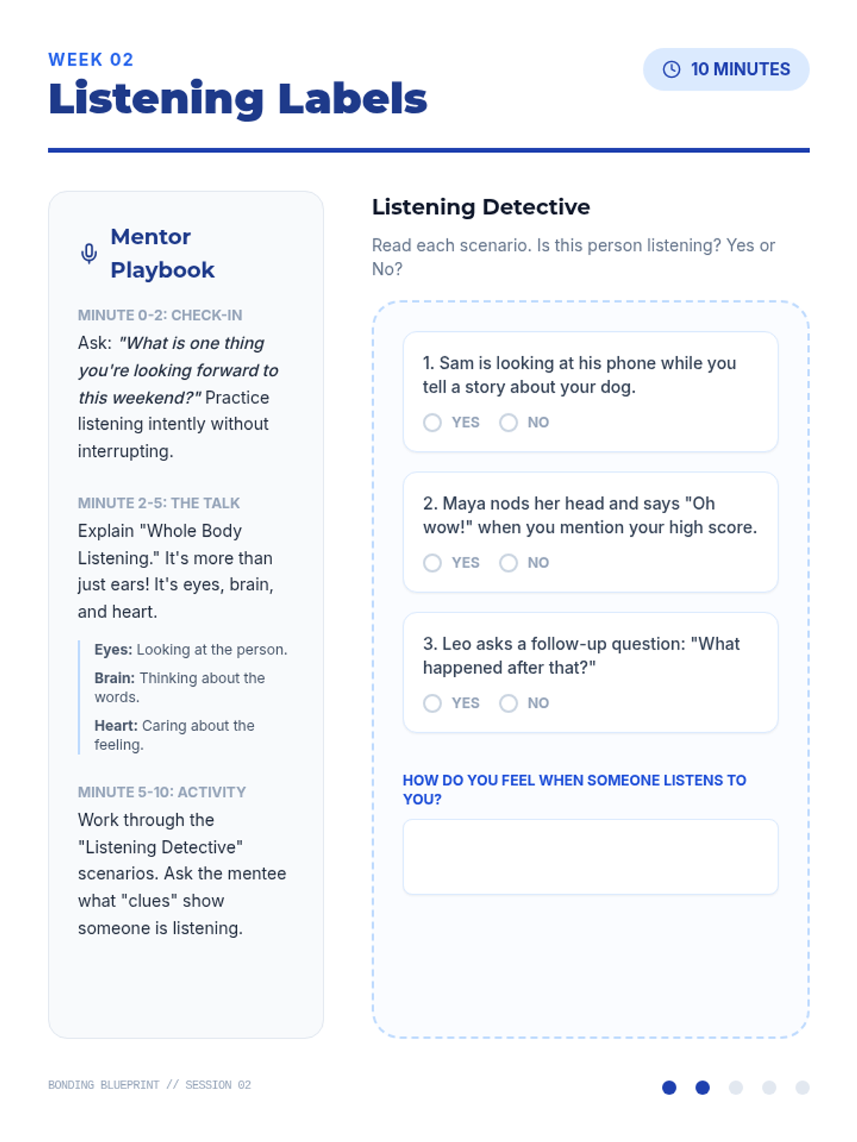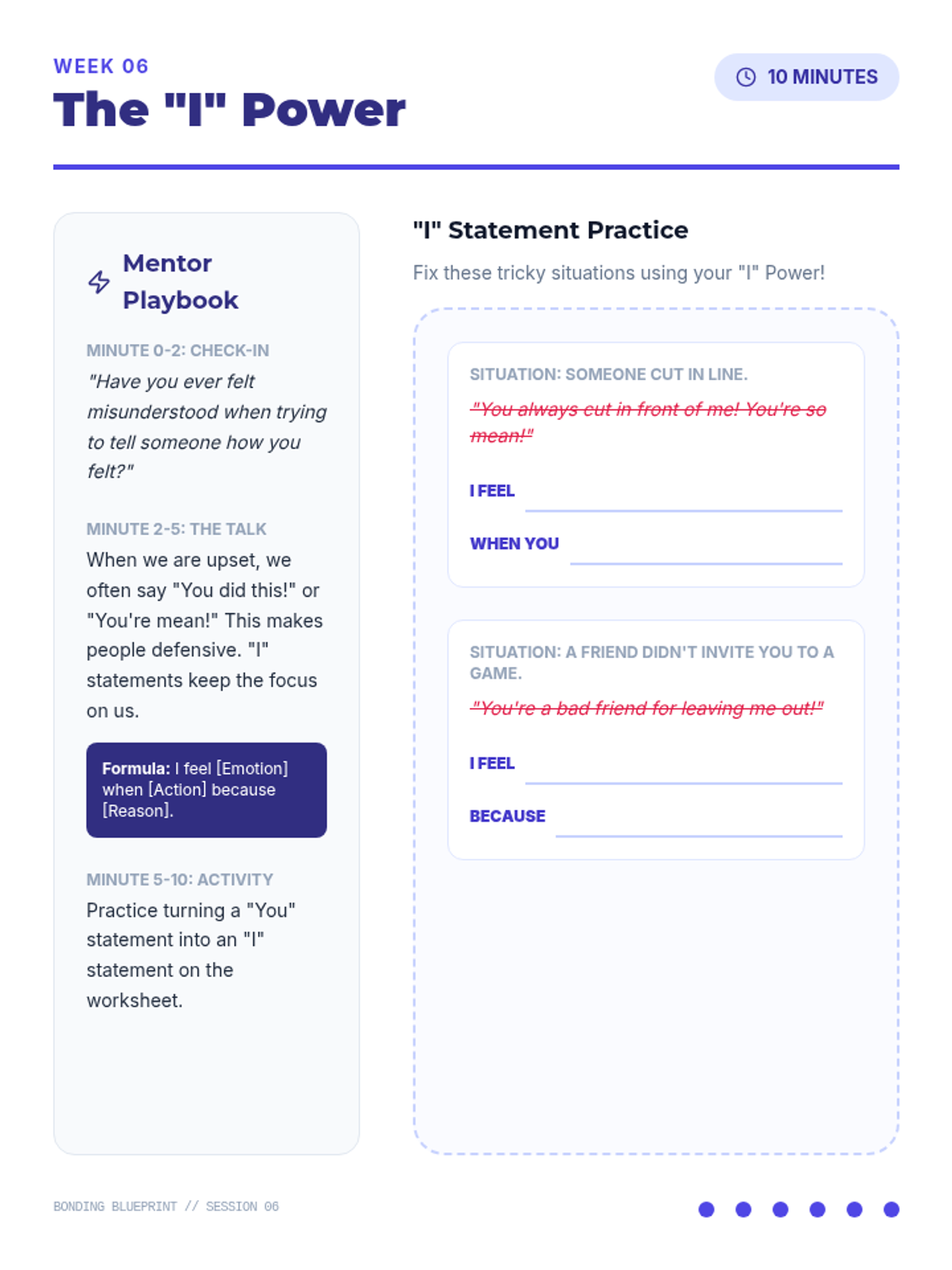 A 10-week mentorship program designed for short, 10-minute sessions focusing on friendship, conflict resolution, and coping skills. The sequence provides structured but flexible activities to build a strong mentor-mentee relationship while developing essential social-emotional skills.