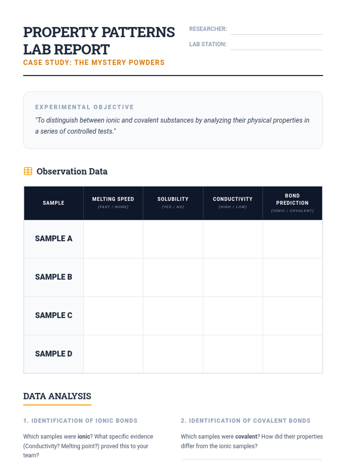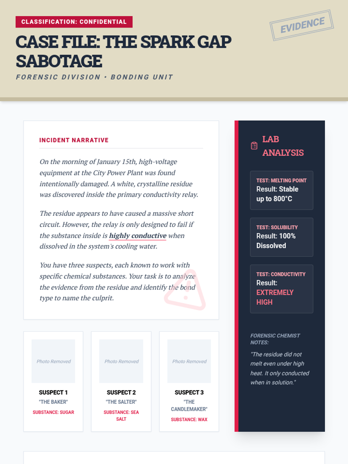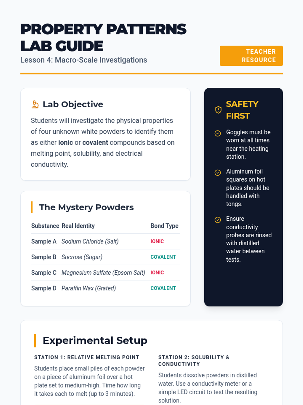 A comprehensive 8th-grade chemistry sequence exploring ionic and covalent bonding. Students move from micro-scale electron models to macro-scale physical property investigations, culminating in a forensic-style application of their knowledge.