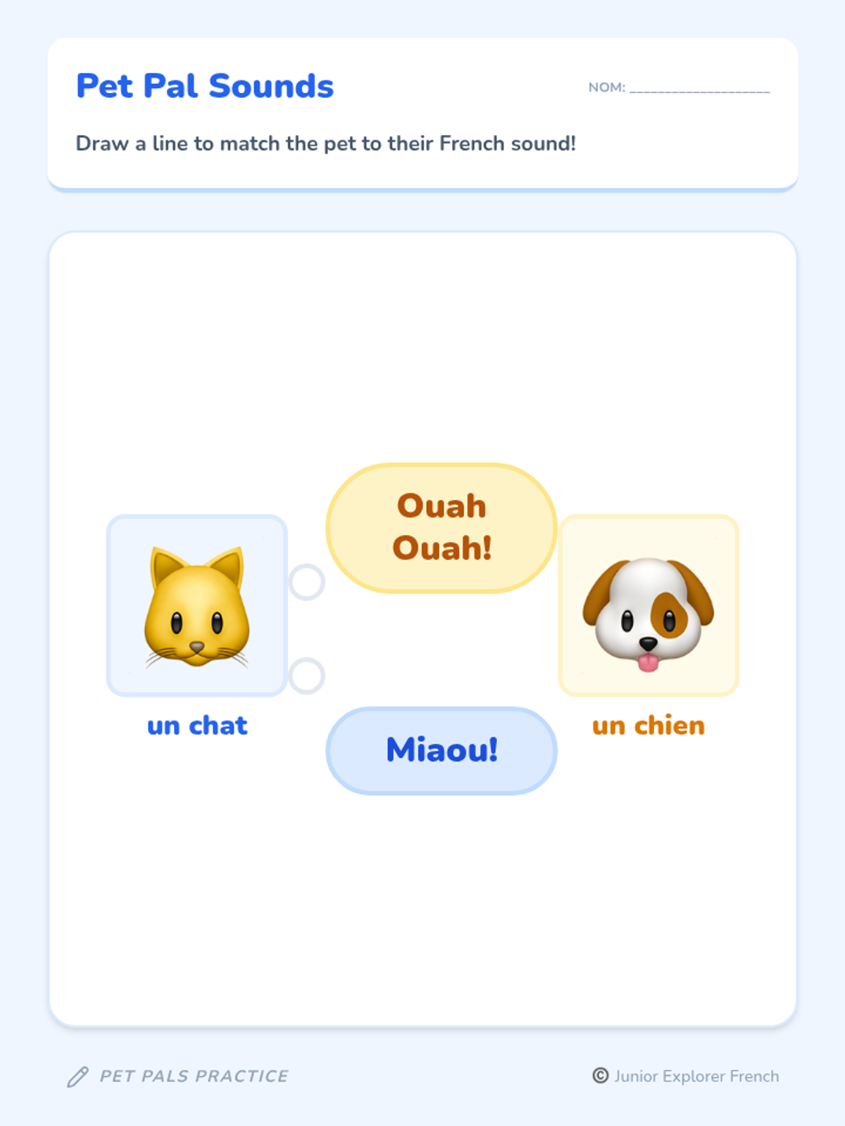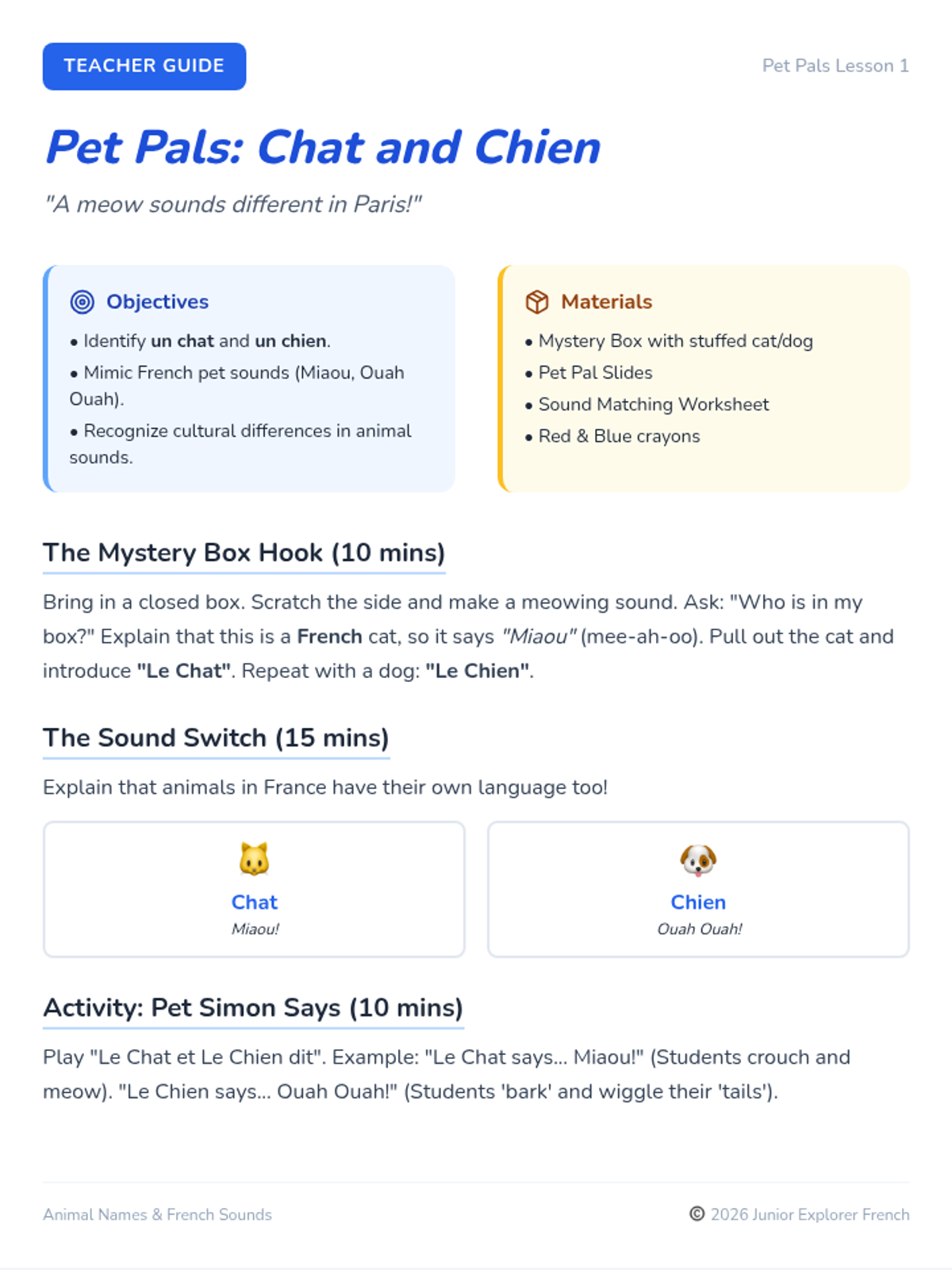 A playful introduction to French through animal names and sounds, designed for Pre-K learners to build phonemic awareness and cultural curiosity. Students learn French vocabulary and the unique sounds animals make in French-speaking cultures.
