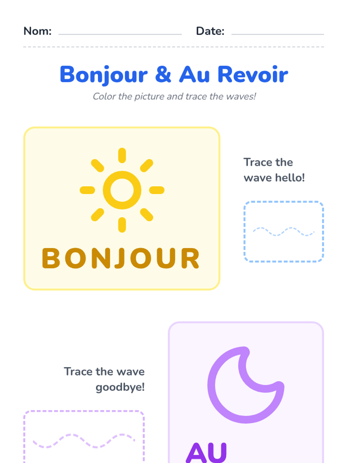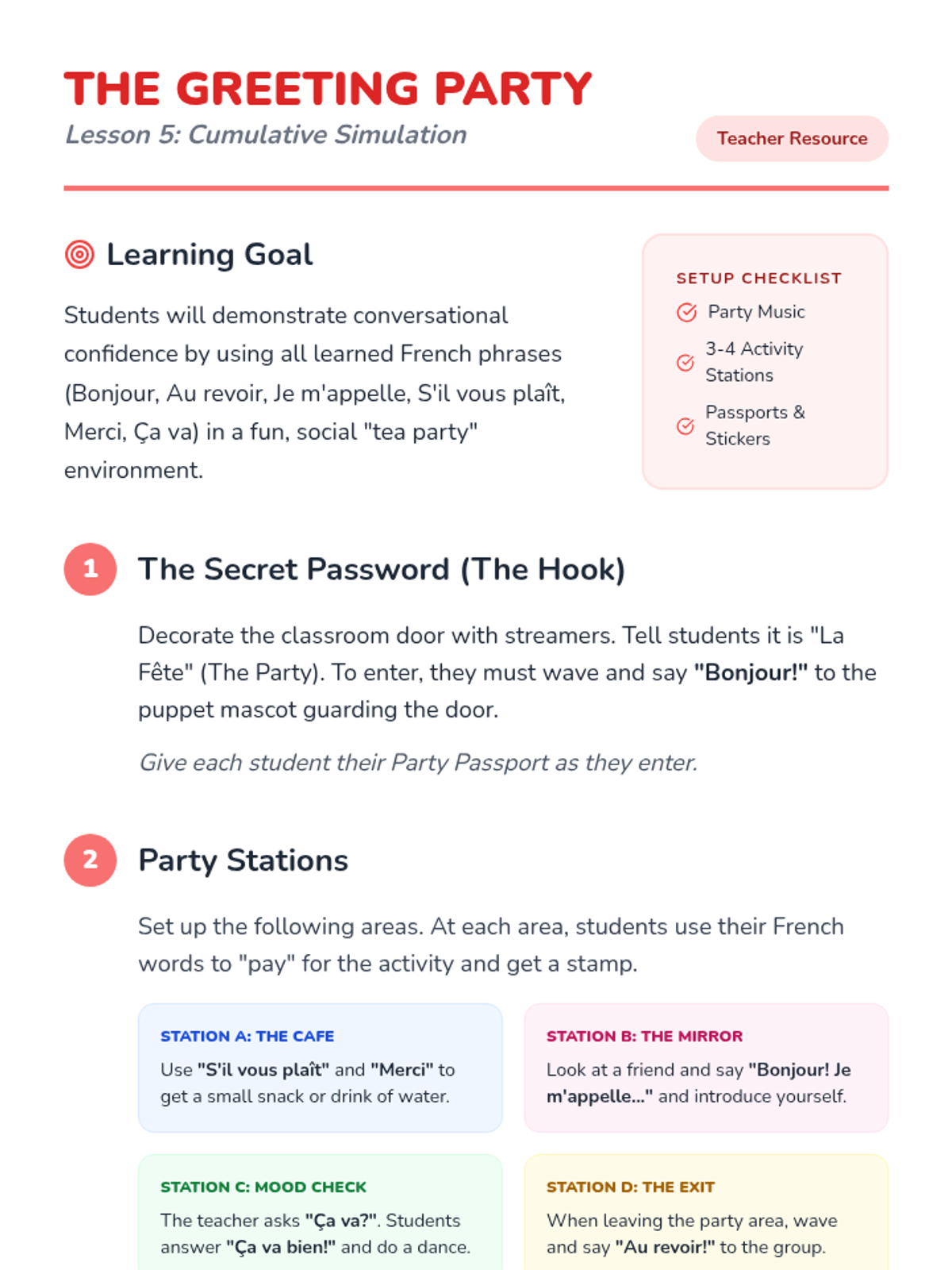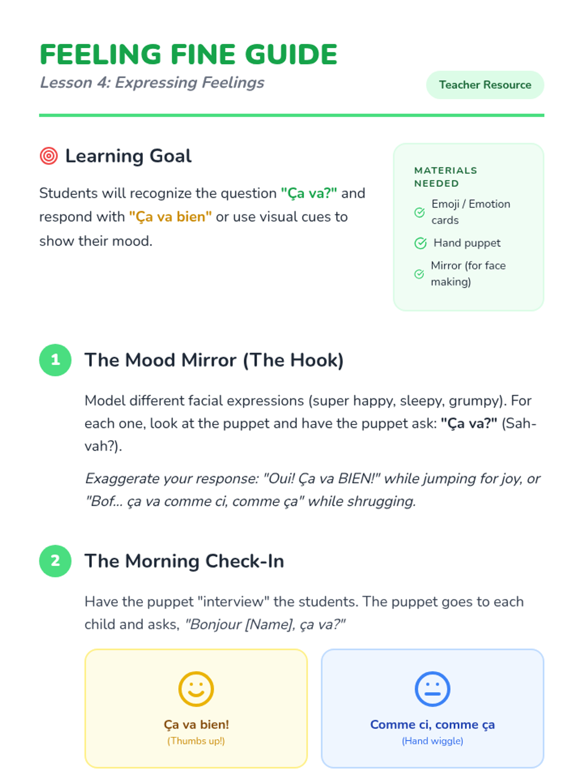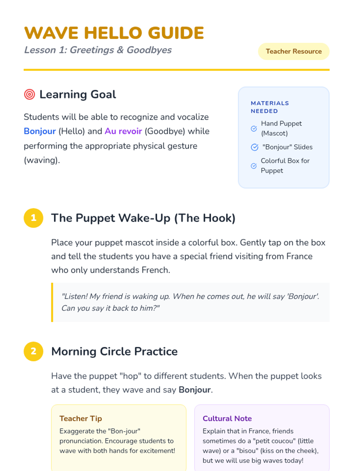 A fun, interactive introduction to French for Pre-K students, focusing on greetings, introductions, and manners through puppet play, songs, and social games.
