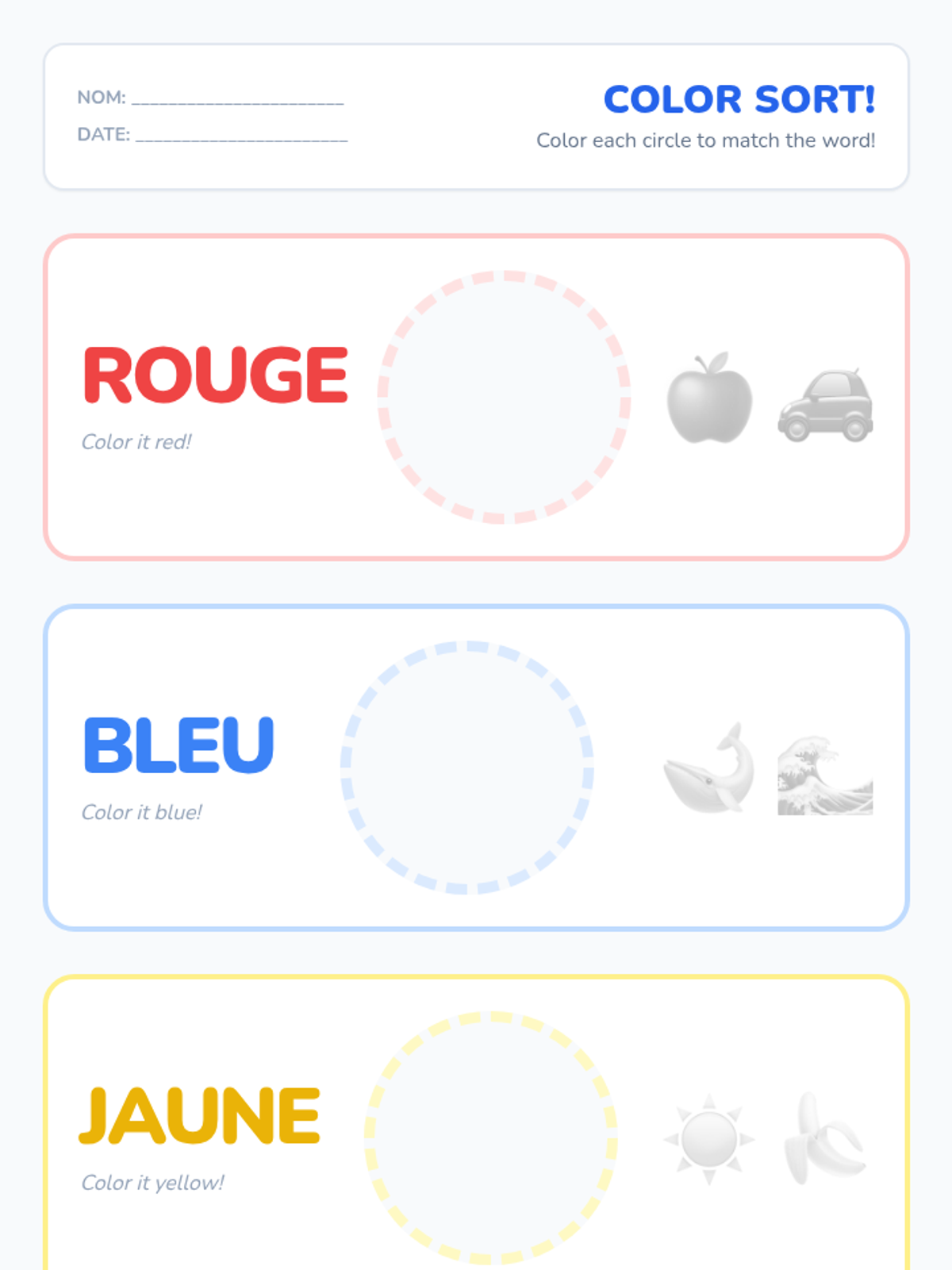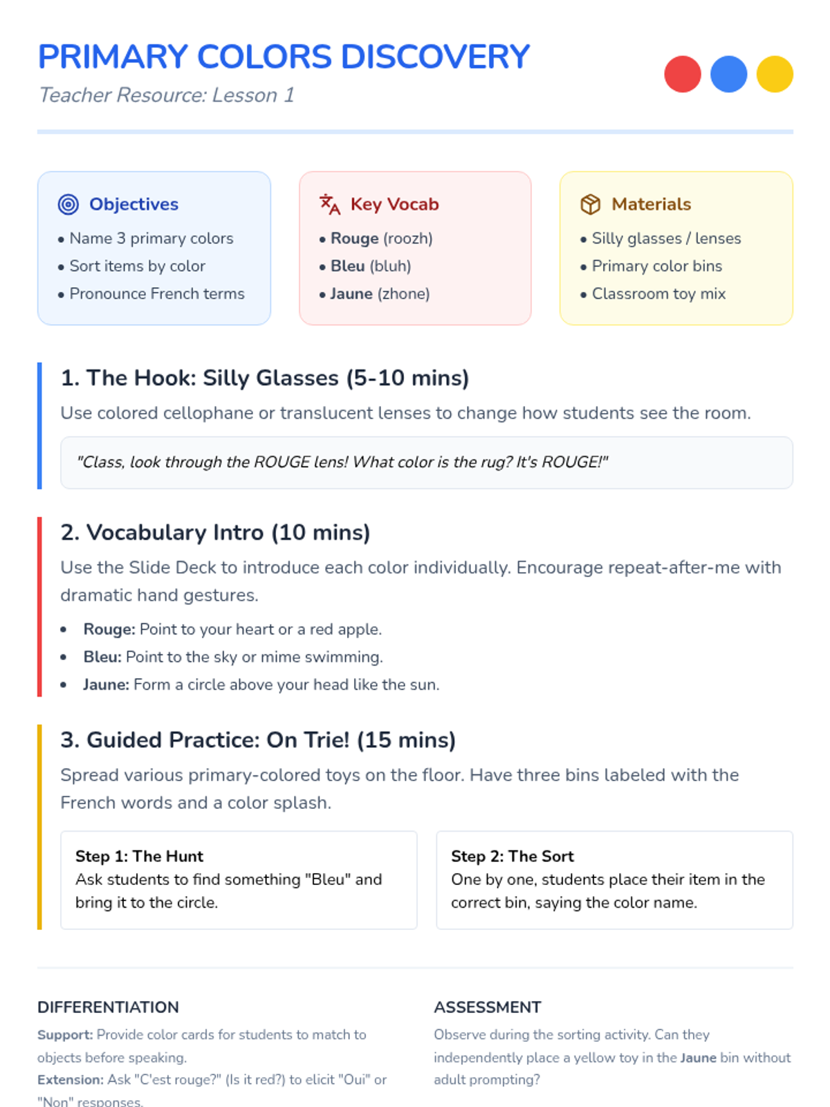 This sequence introduces Pre-K students to basic French colors and numbers 1-5 through multisensory, play-based activities. Students will learn to identify and name colors (rouge, bleu, jaune, vert, orange) and count objects (un to cinq) in French, culminating in a synthesis project that combines both skills.