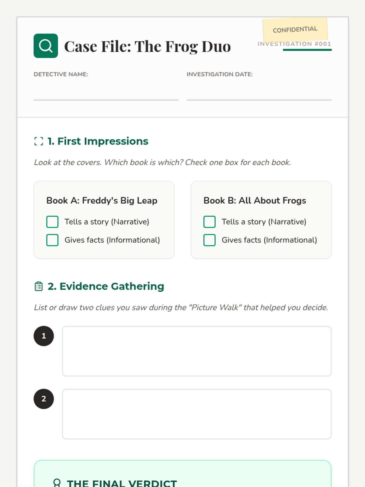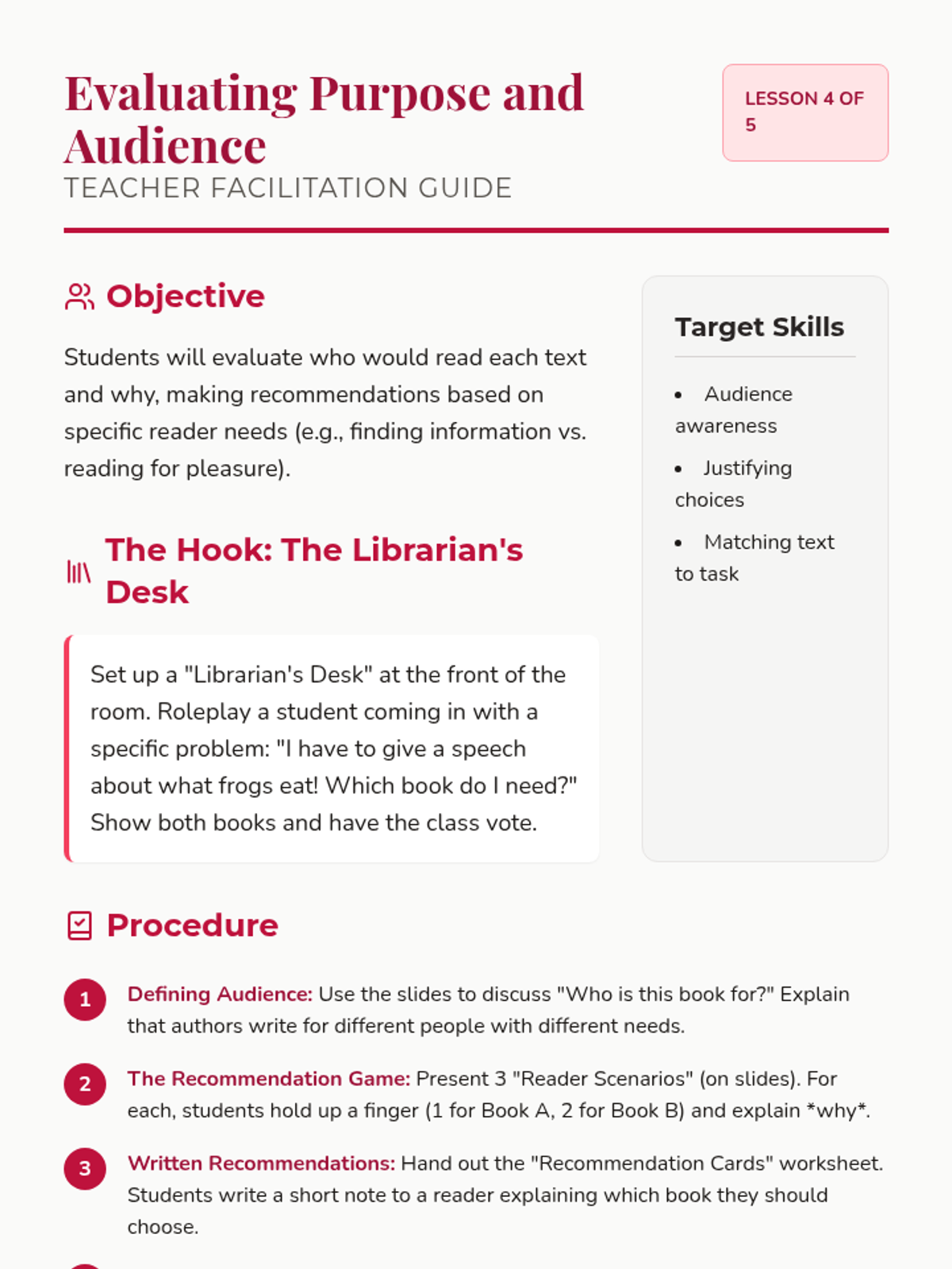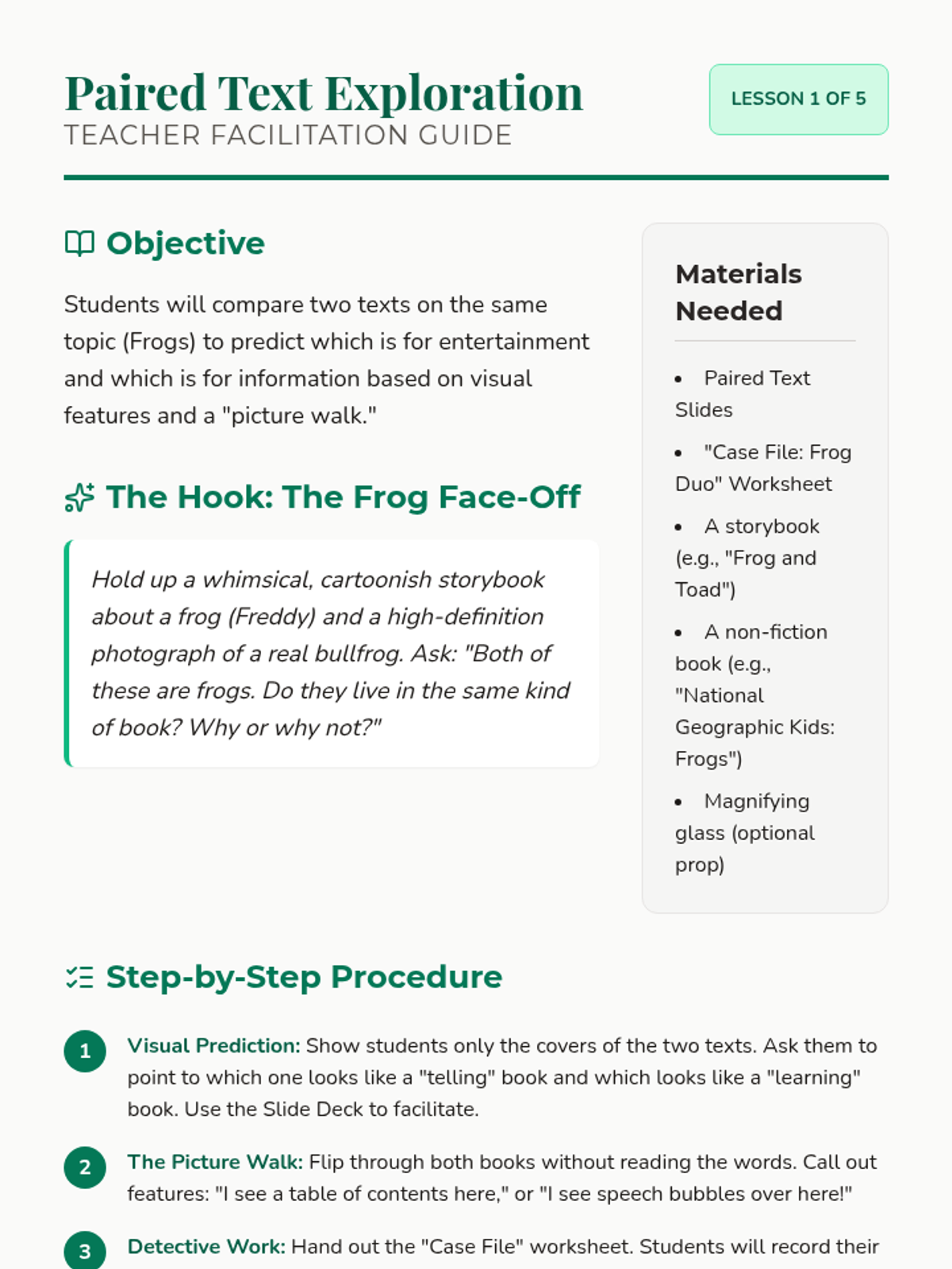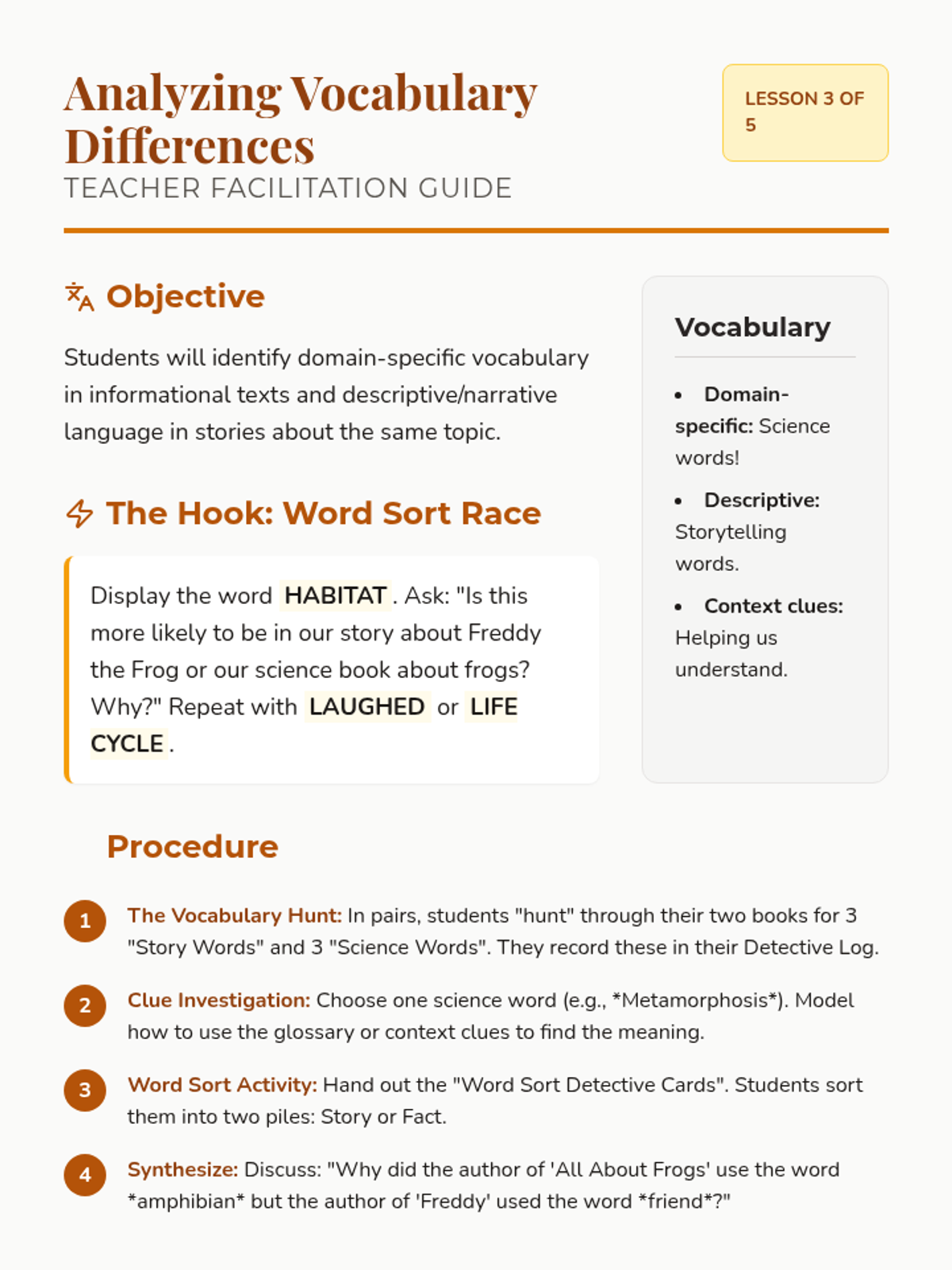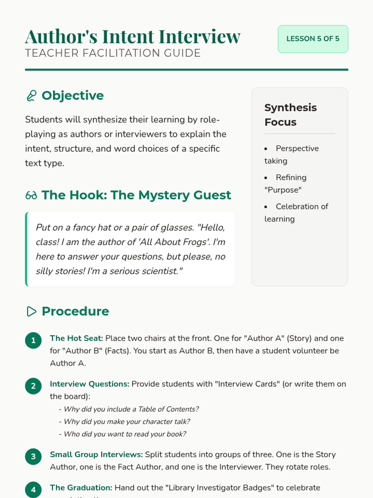 This sequence guides 2nd grade students through comparing fictional and informational texts on the same topic to understand author's purpose, structure, and vocabulary. Students act as 'Library Investigators' to analyze how authors' goals shape their writing.