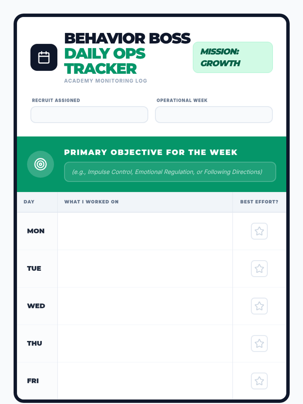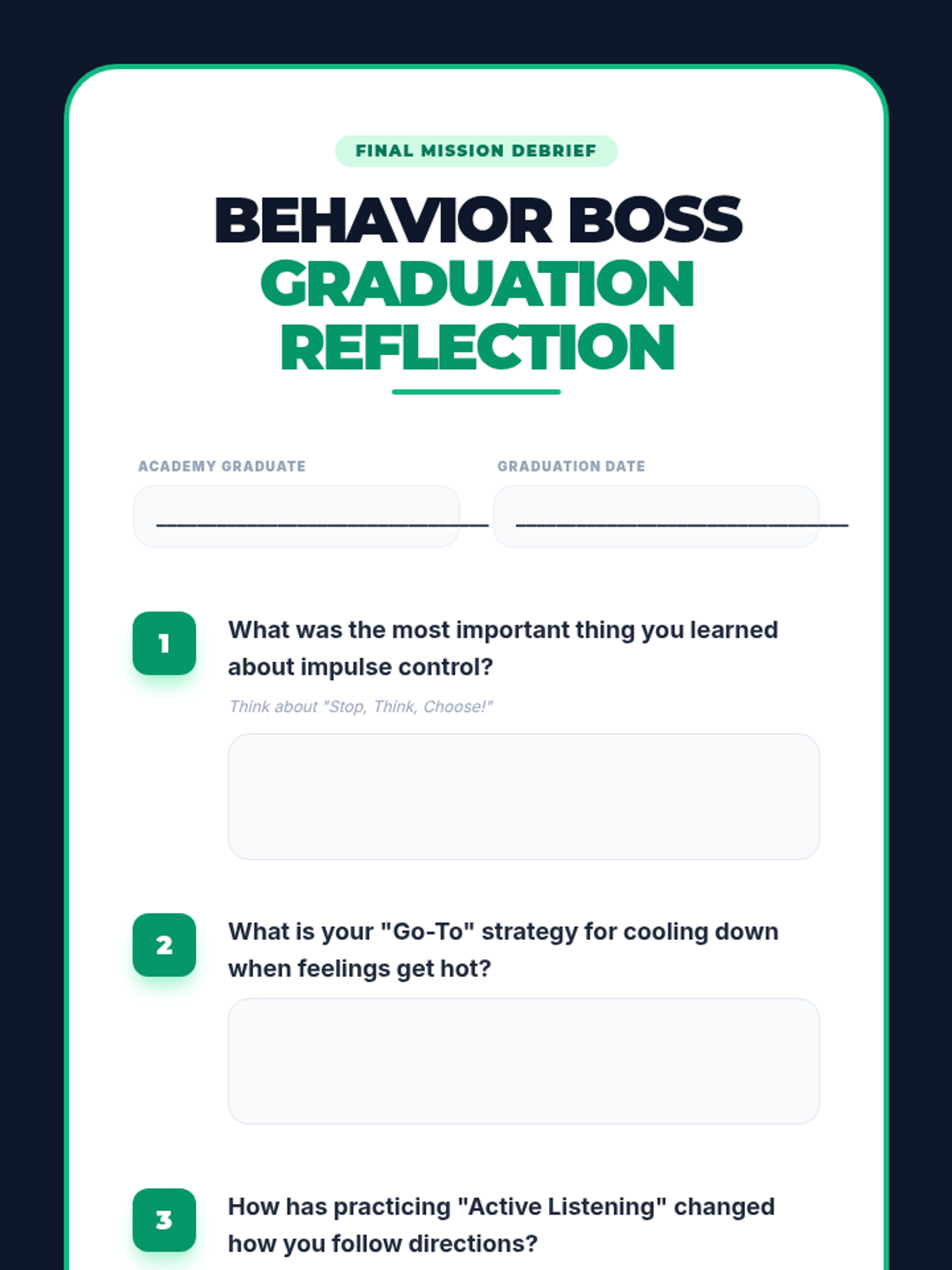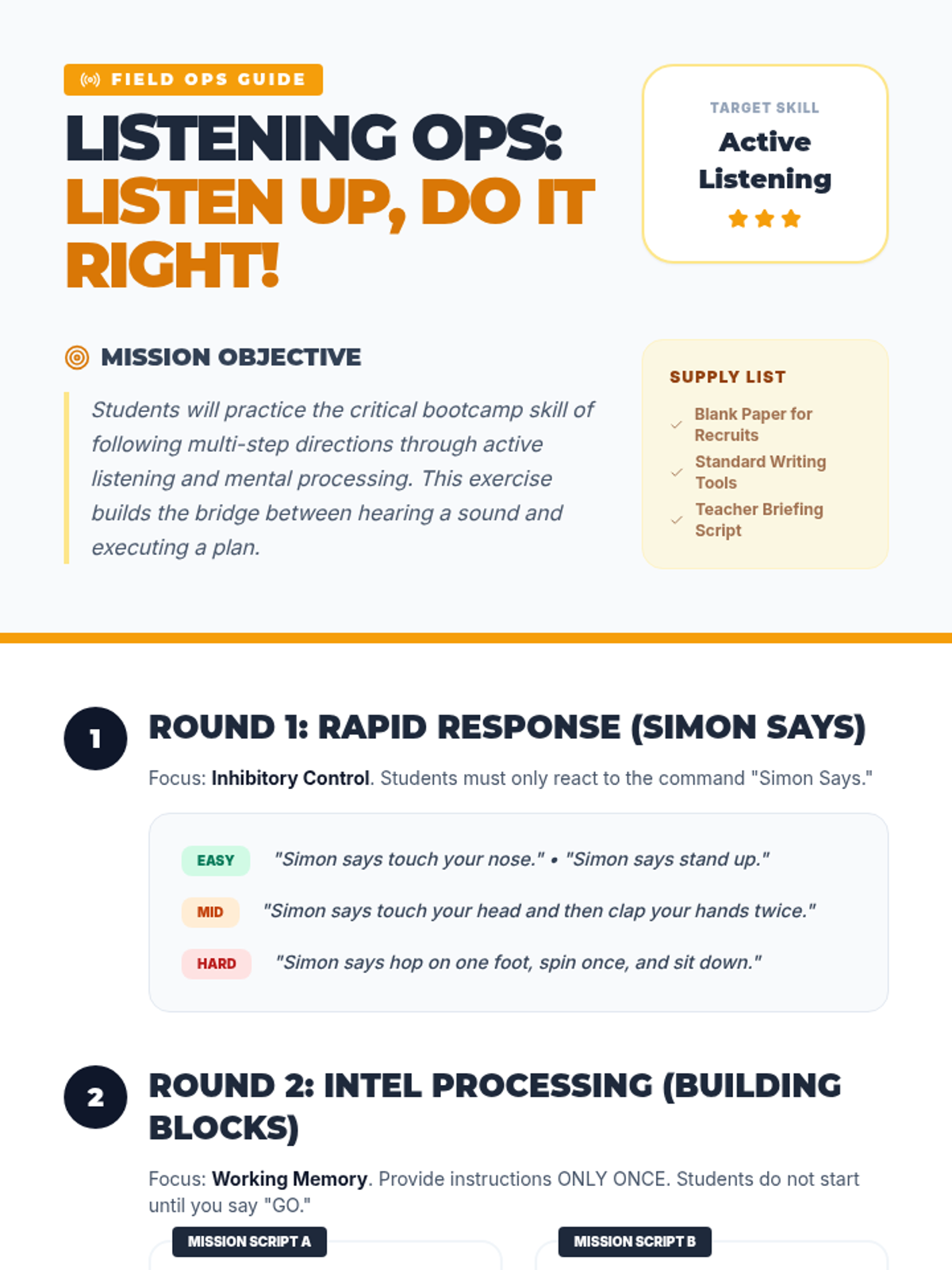 A 6-week behavior academy sequence for elementary students focusing on impulse control, emotional regulation, and following directions through engaging "bootcamp" style training.