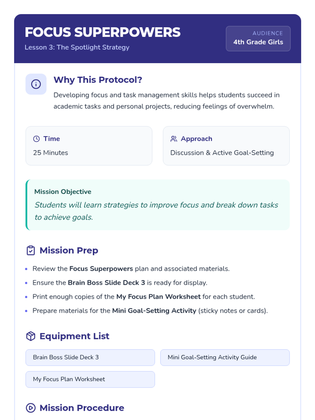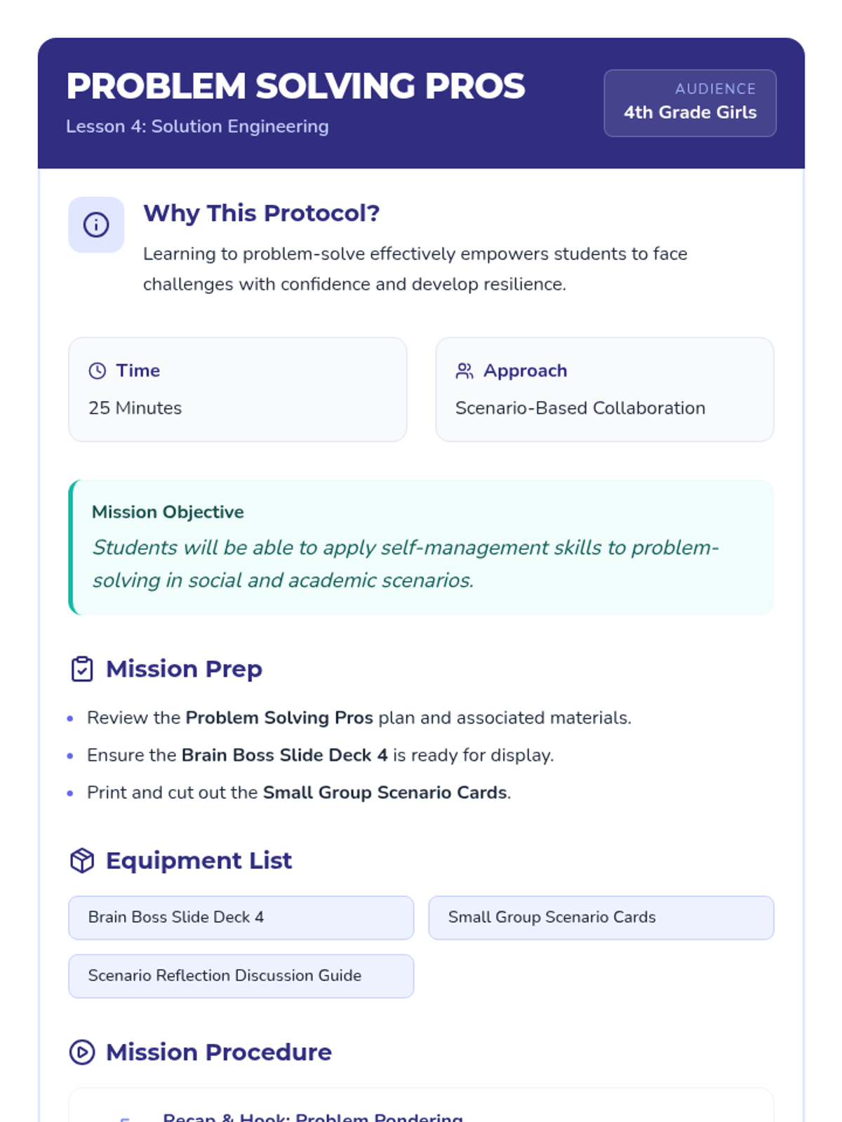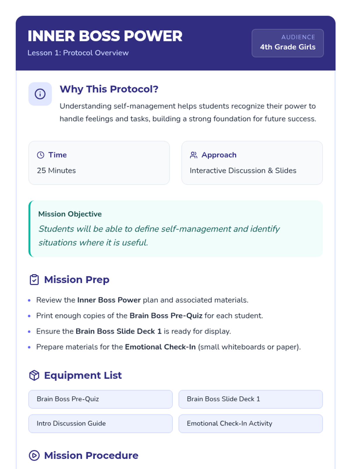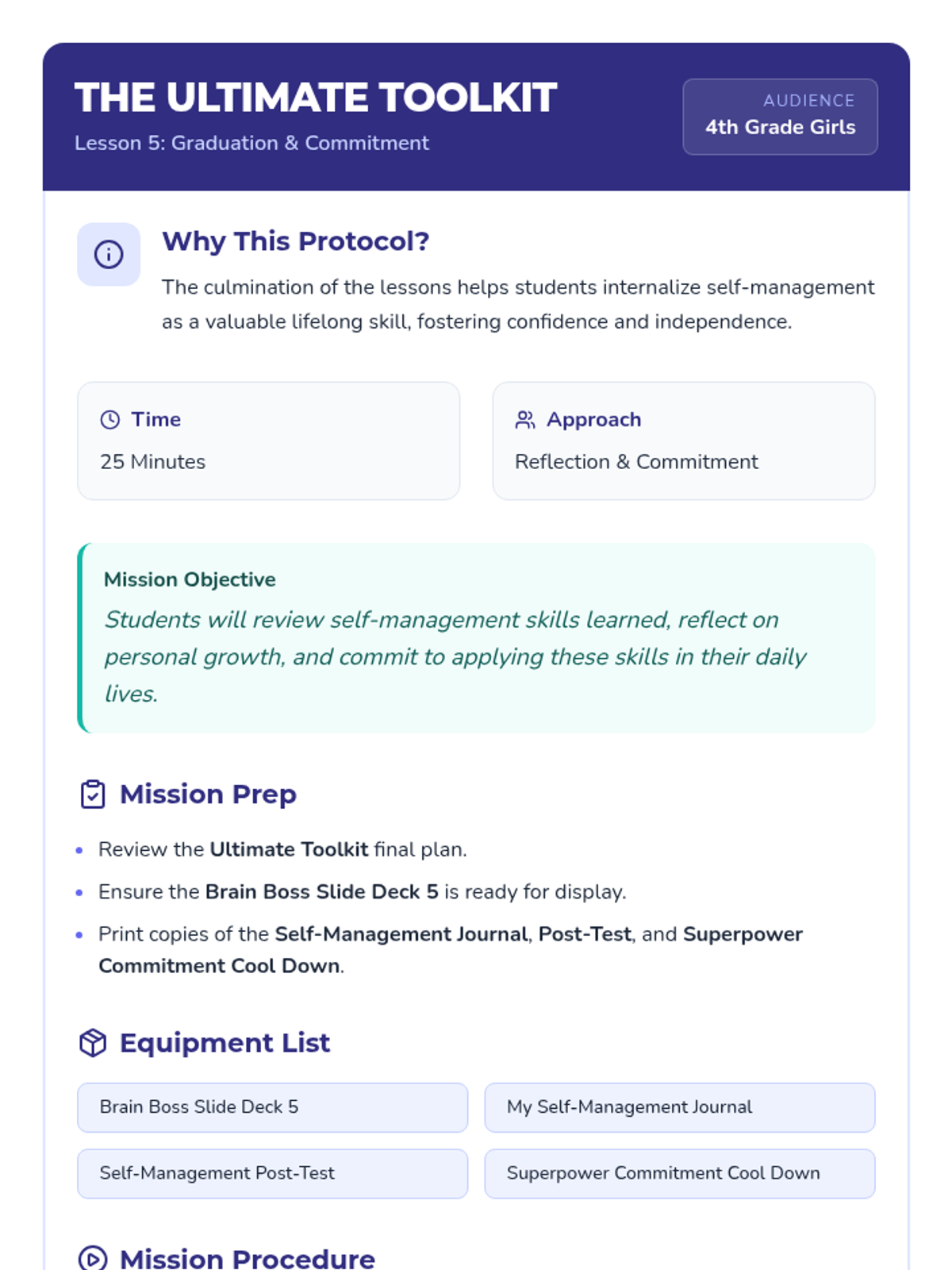 A five-part small group series for 4th-grade girls focused on self-management, emotional regulation, focus, and problem-solving through a 'Brain Boss' superpower theme.