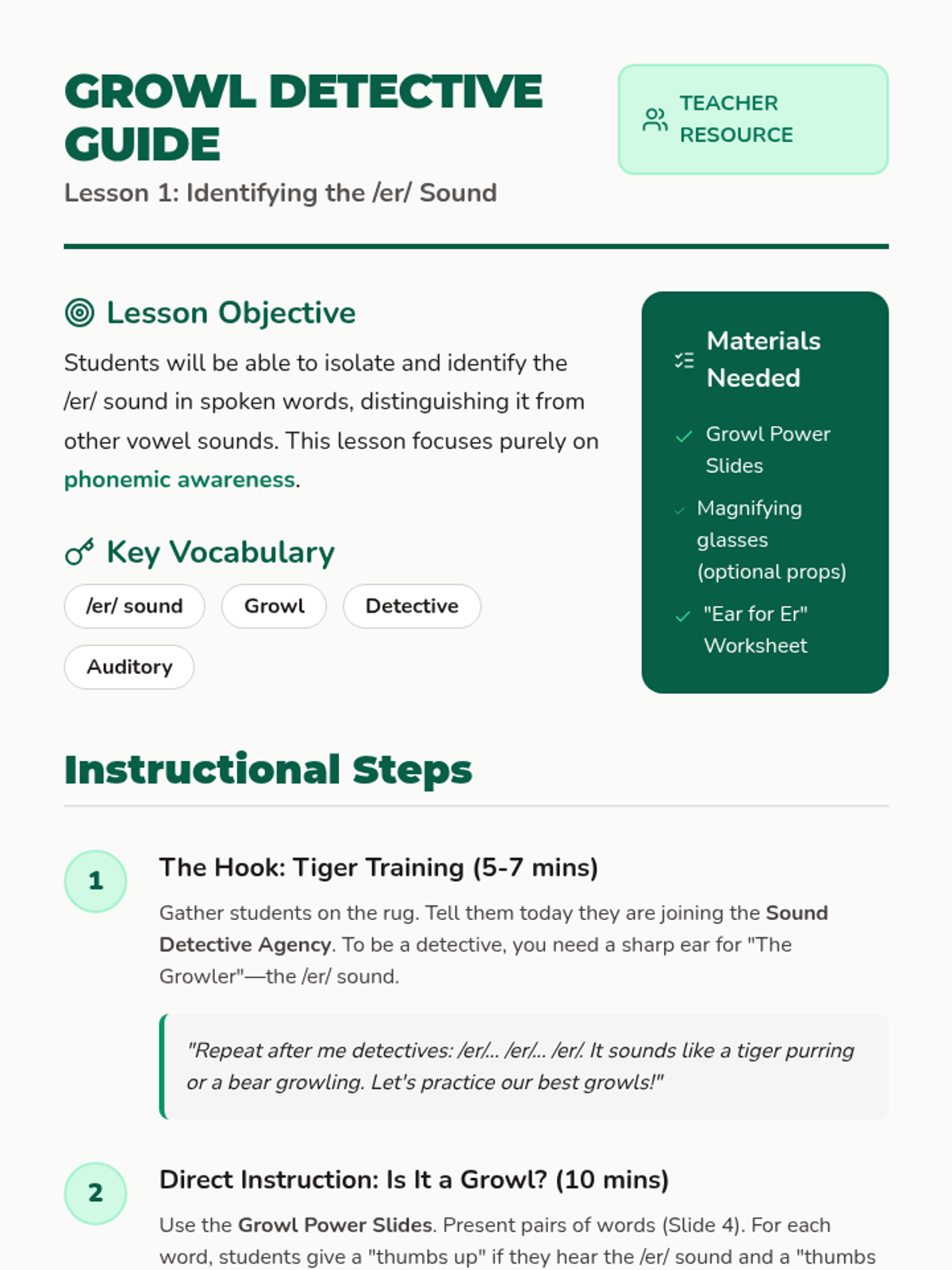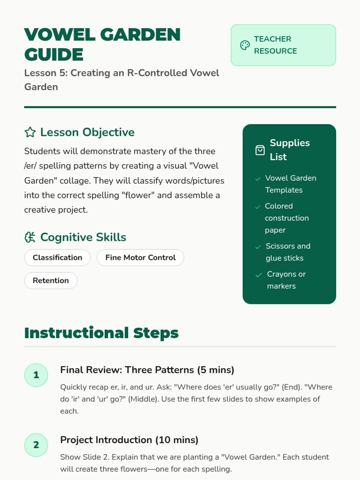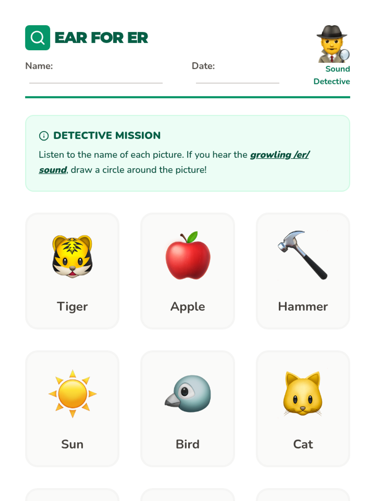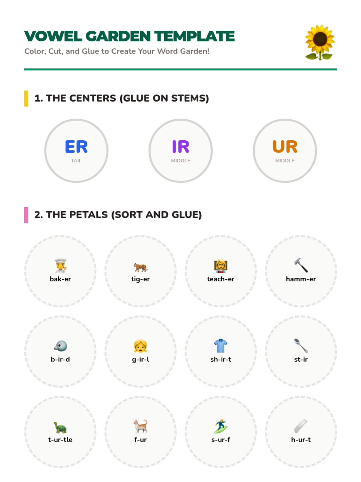 Students become sound detectives to investigate the /er/ sound and its three common spelling patterns: er, ir, and ur. Through multisensory activities and creative projects, they master distinguishing these tricky 'Bossy R' vowels in Kindergarten-friendly words.