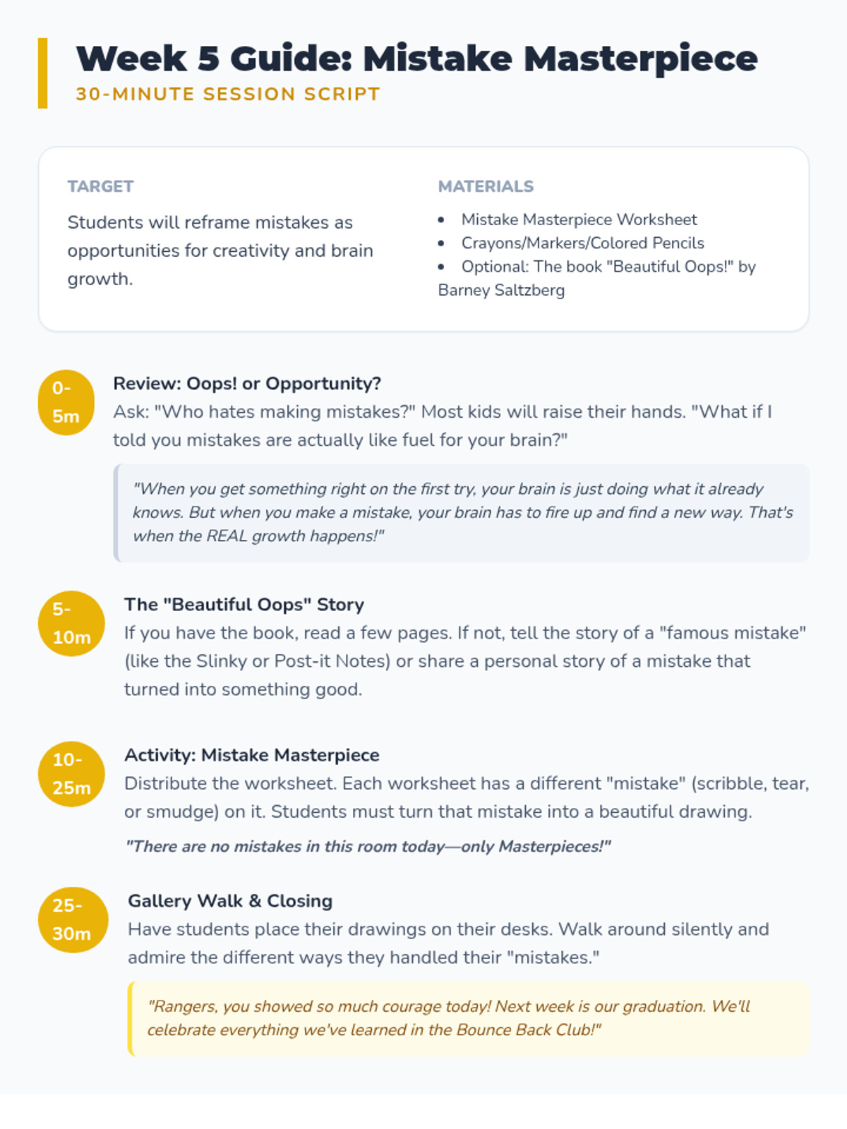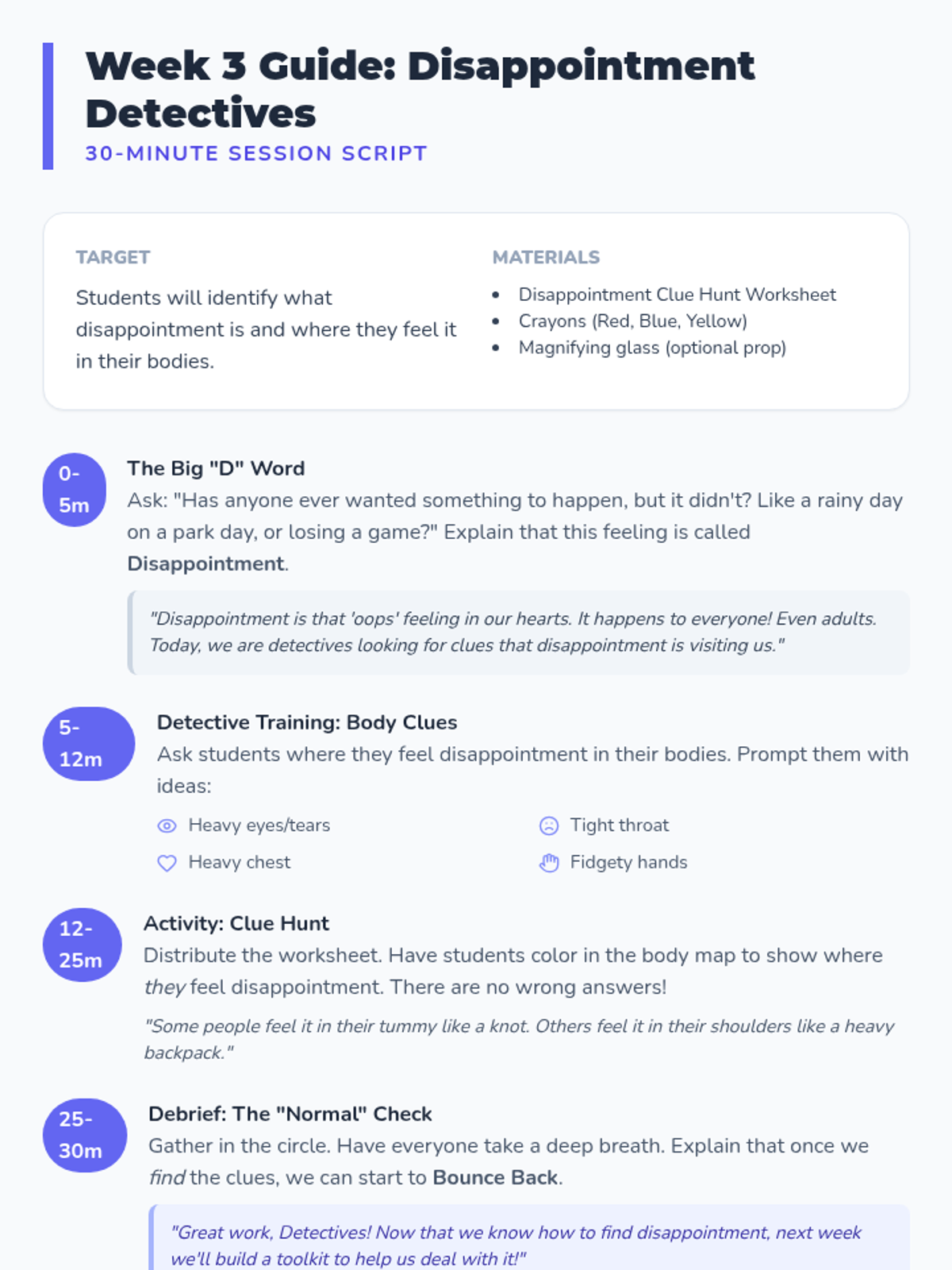A 6-week social-emotional learning group for 2nd graders focused on developing a growth mindset and learning to navigate disappointment through hands-on activities and discussion.