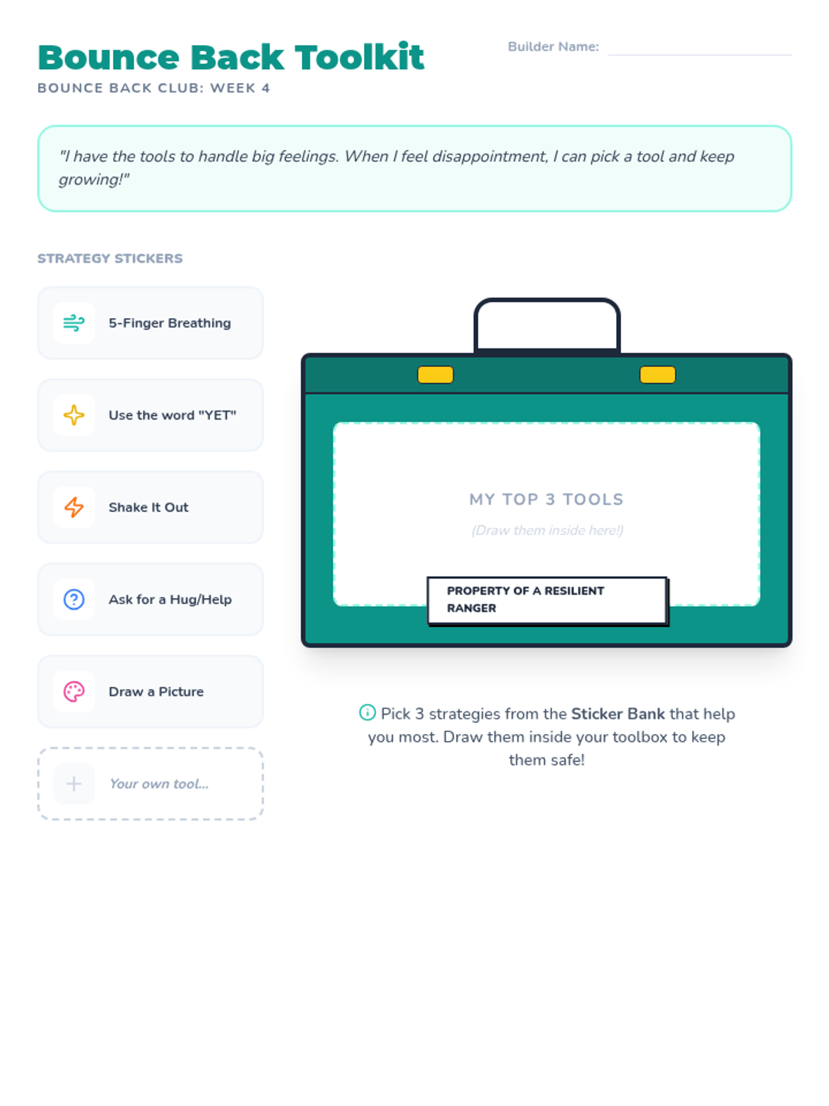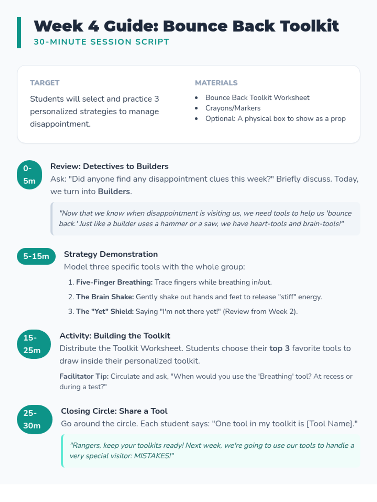 A 6-week confidence-building small group for 2nd graders, designed for 15-minute lunch-time sessions. The curriculum focuses on self-identity, positive self-talk, growth mindset, and social confidence using hands-on activities and conversational prompts.
