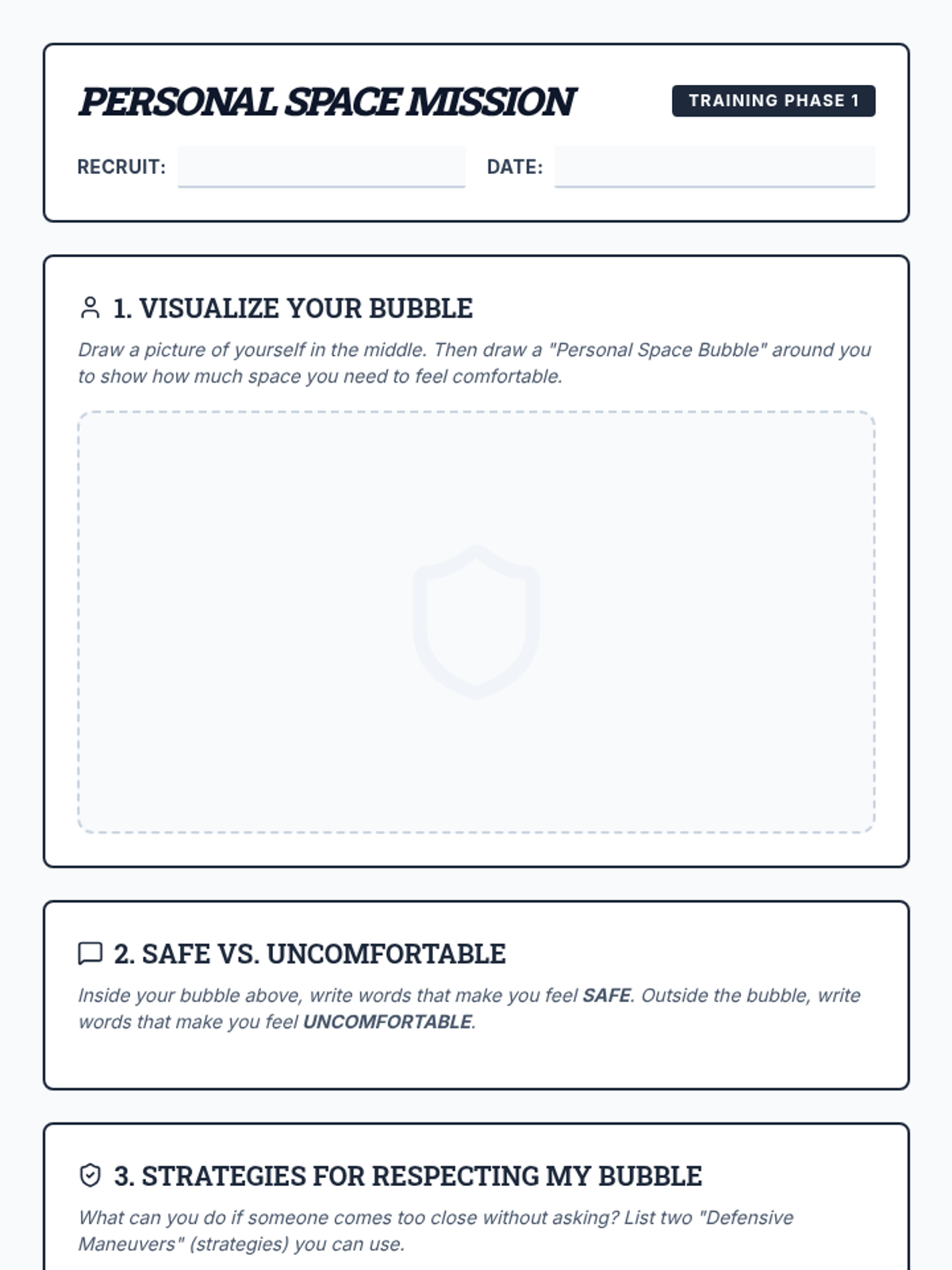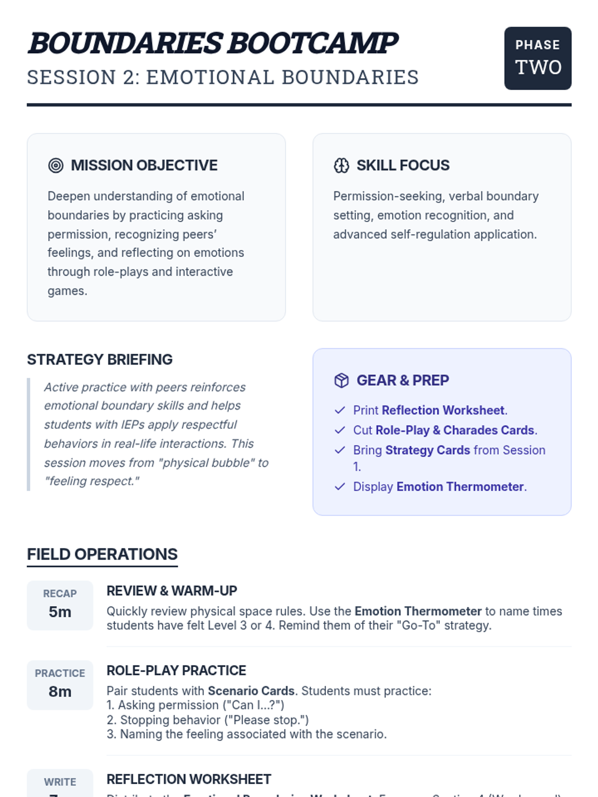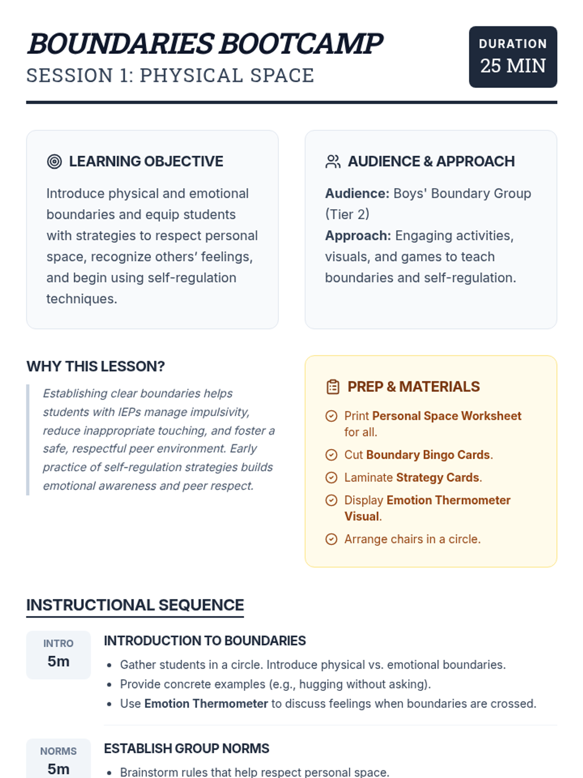 A two-session group lesson series for boys with IEPs to learn and practice recognizing physical and emotional boundaries, including self-regulation strategies and social skills.