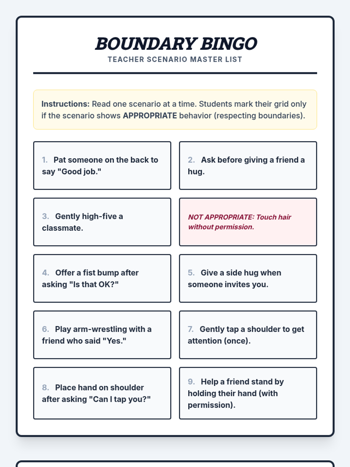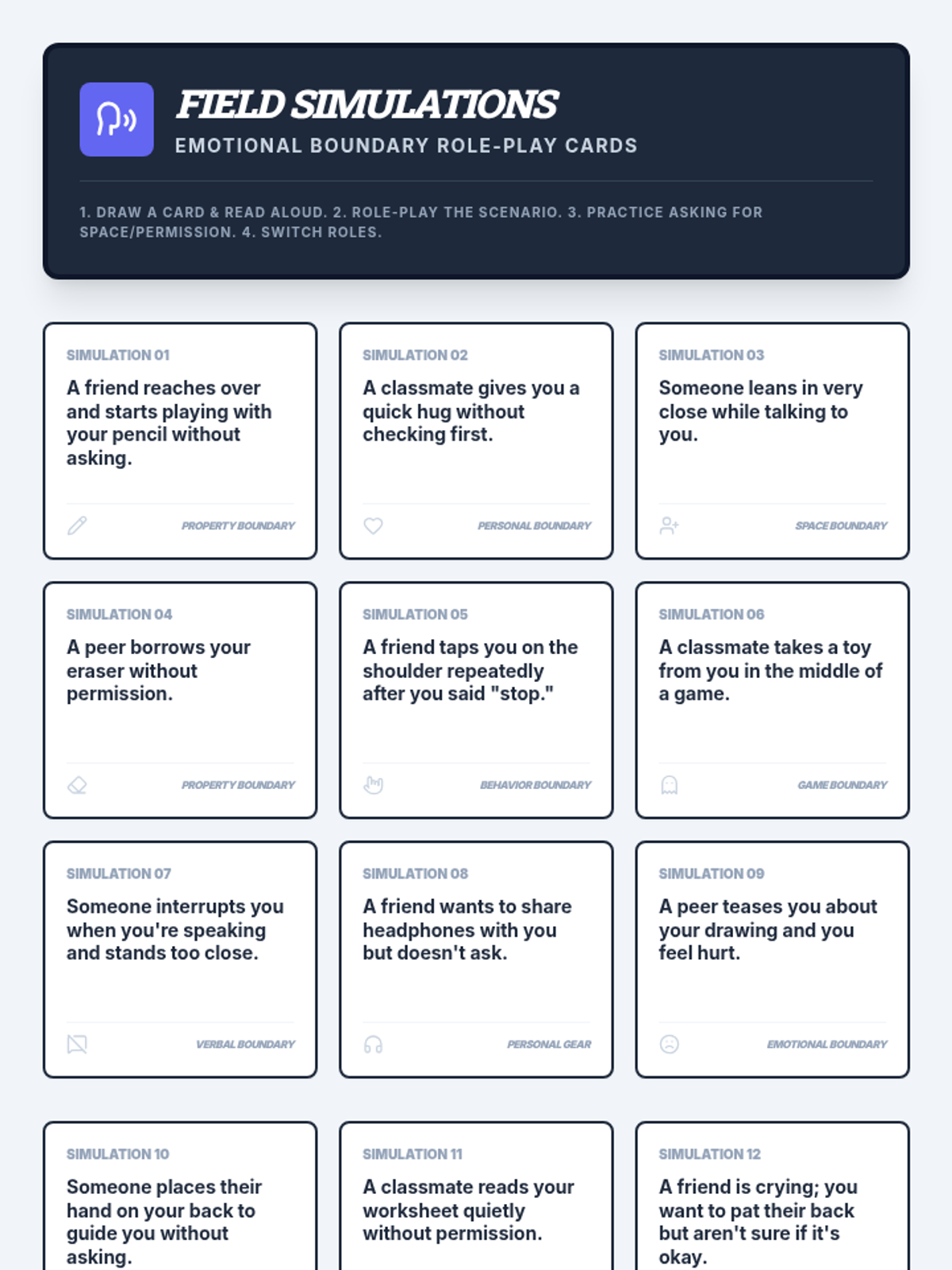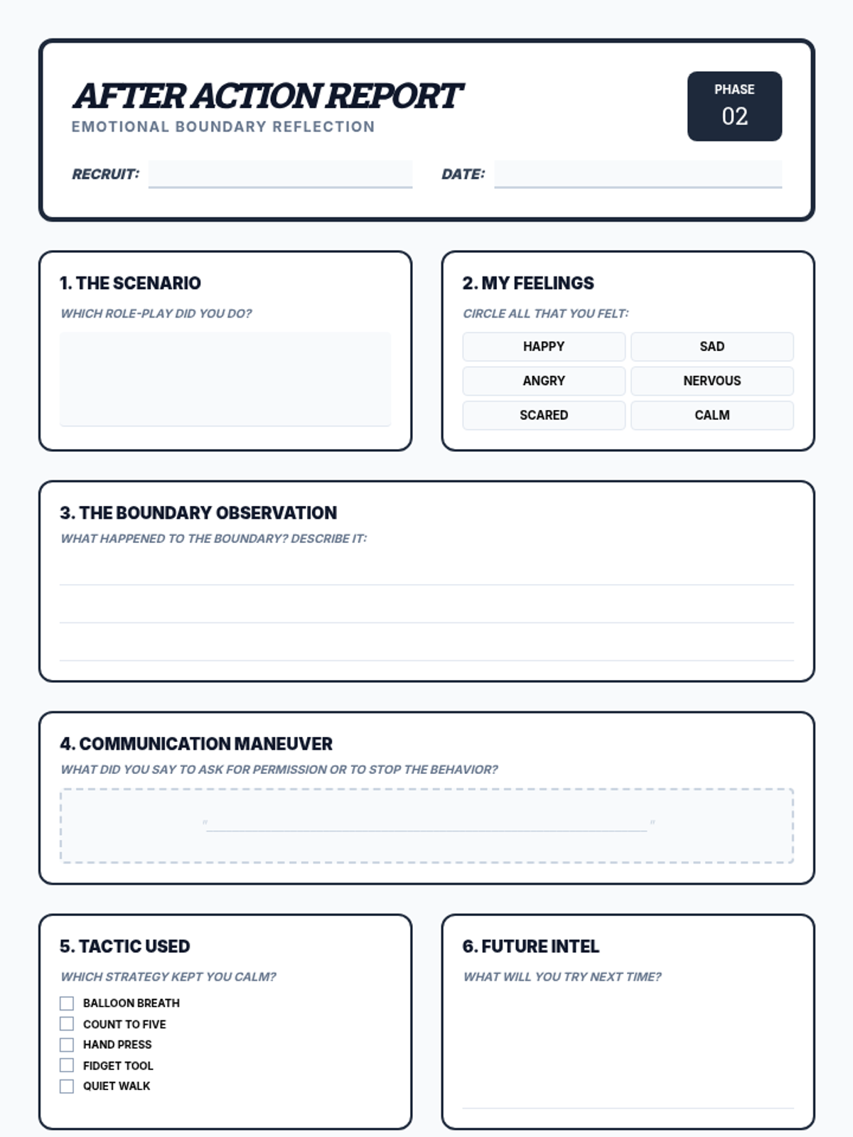 A two-session group lesson series for boys with IEPs to learn and practice recognizing physical and emotional boundaries, including self-regulation strategies and social skills.