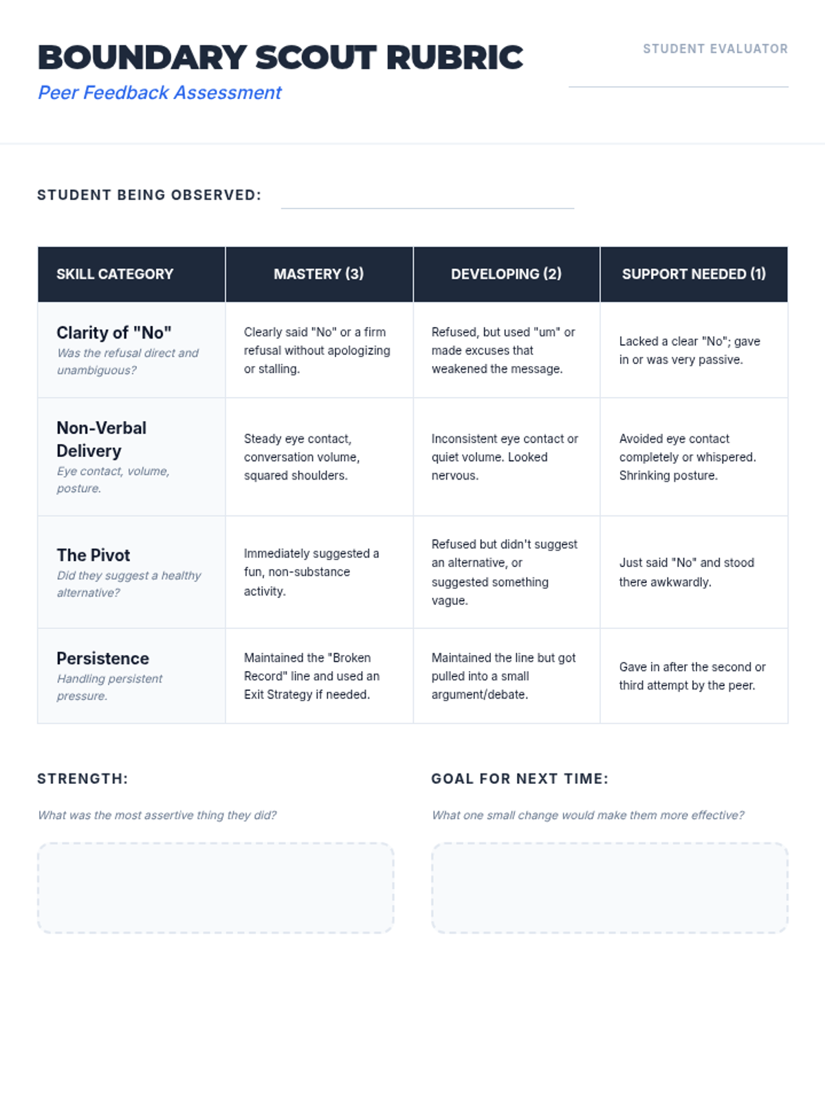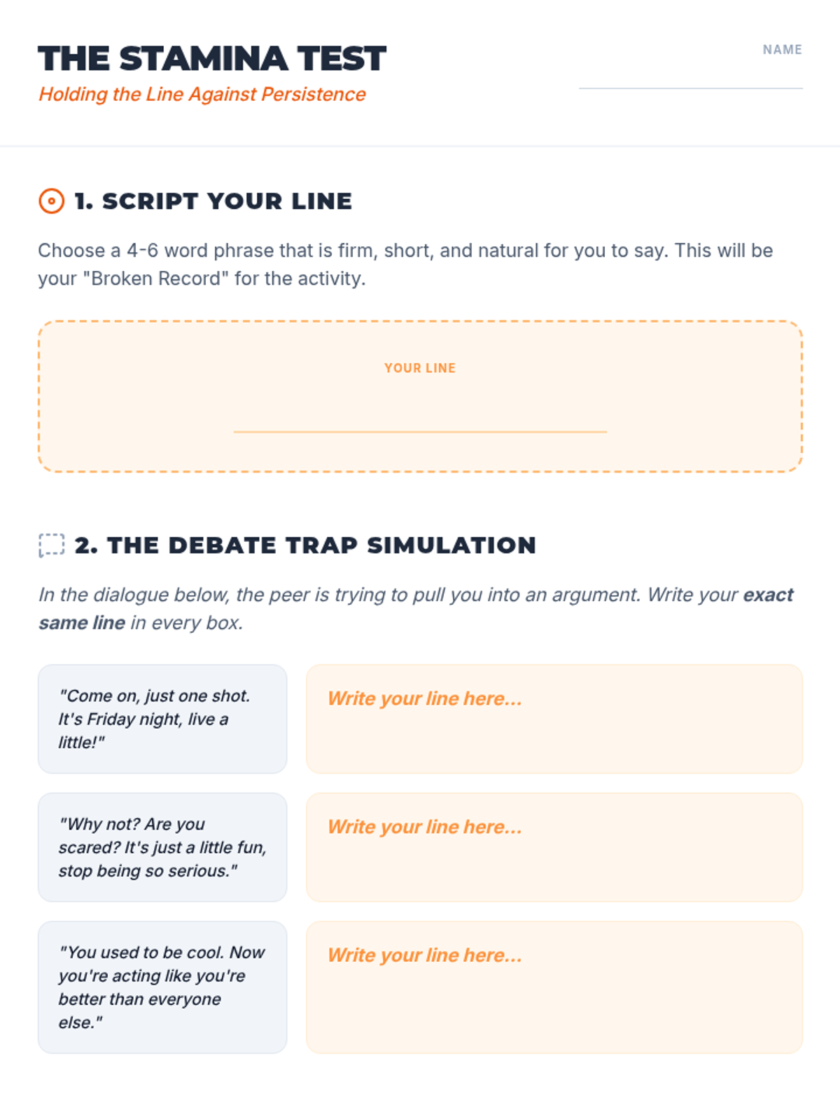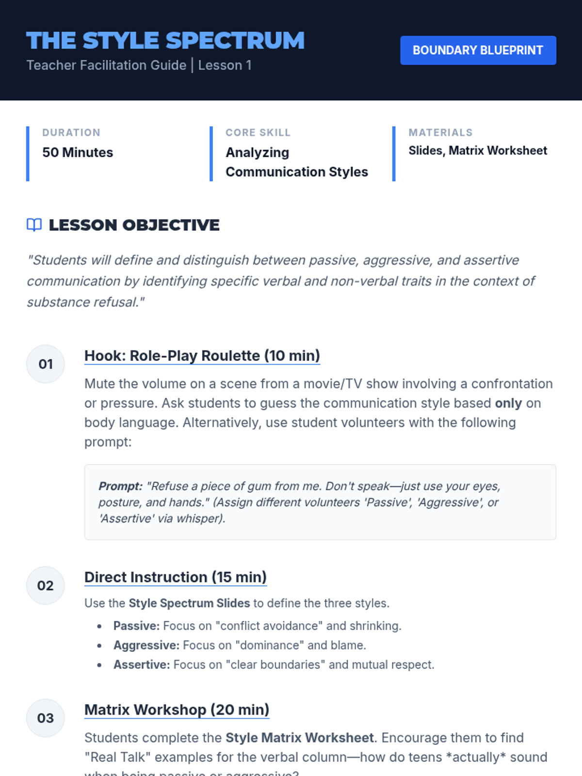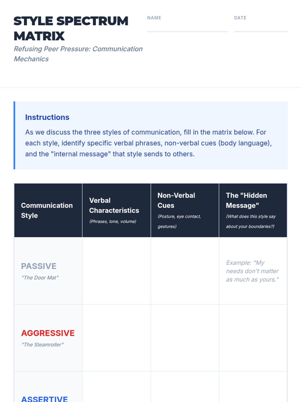 A 10th-grade health sequence focused on the mechanics of assertive communication to refuse peer pressure. Students analyze communication styles, identify internal barriers to saying 'no', and master specific verbal techniques like the 'broken record' to maintain boundaries.