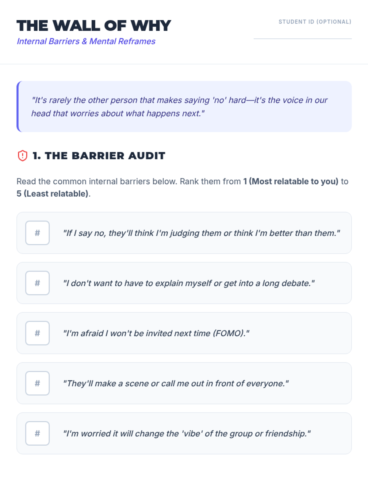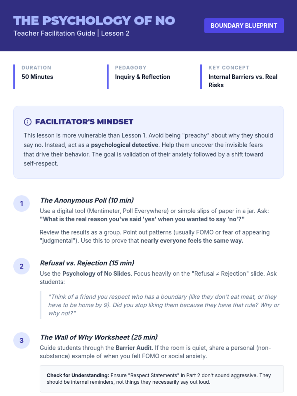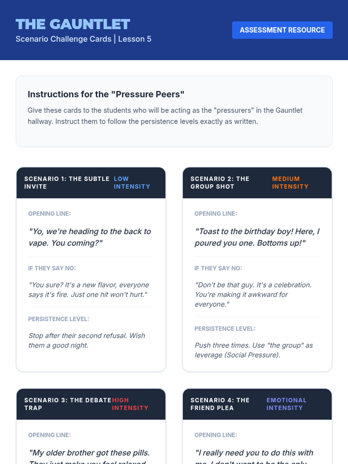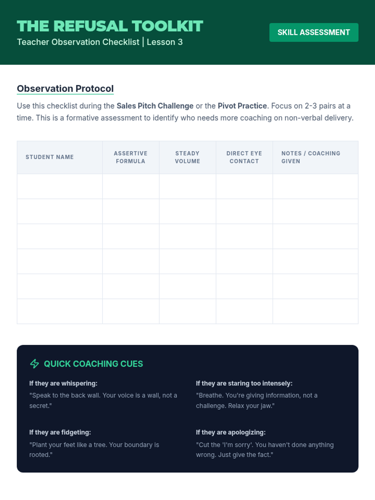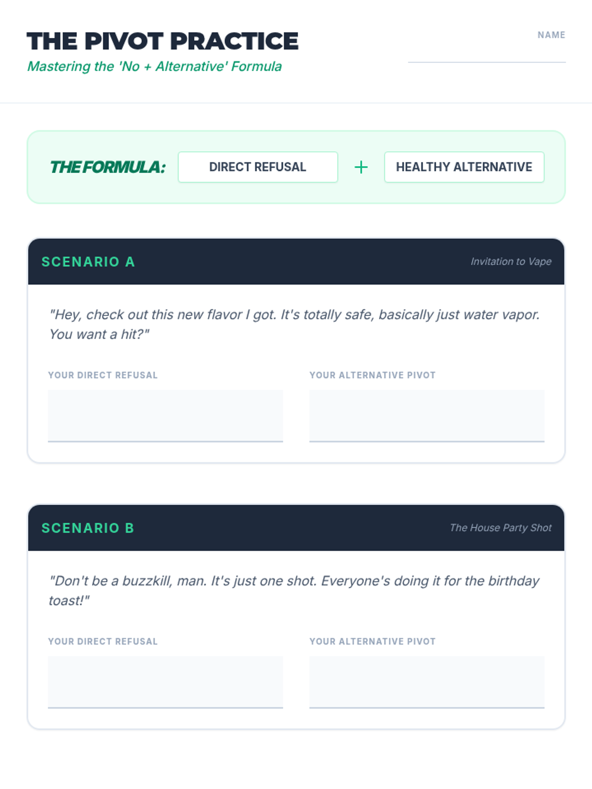 A 10th-grade health sequence focused on the mechanics of assertive communication to refuse peer pressure. Students analyze communication styles, identify internal barriers to saying 'no', and master specific verbal techniques like the 'broken record' to maintain boundaries.