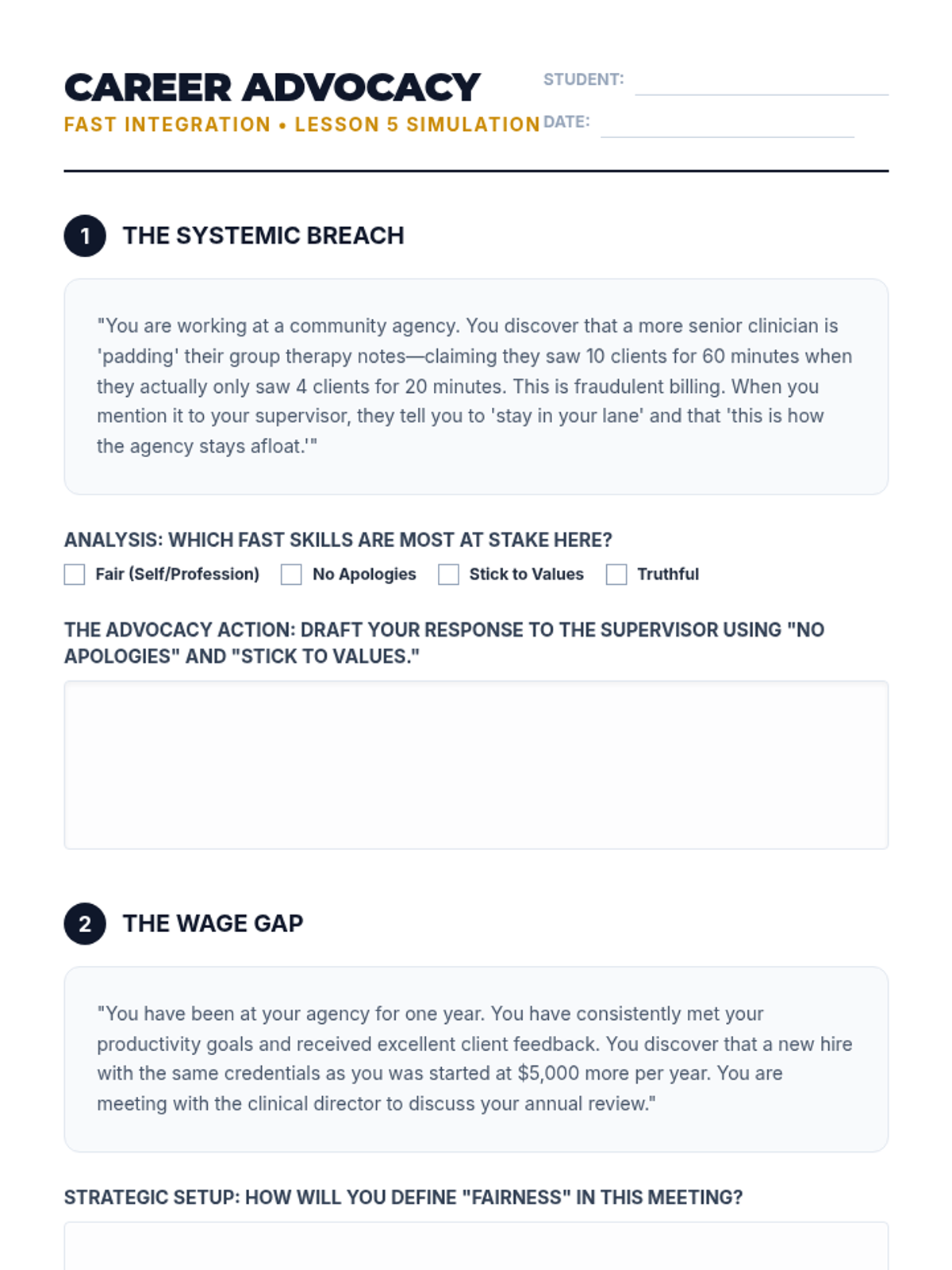 A graduate-level sequence focused on applying FAST skills (Fair, Apologies, Stick to Values, Truthful) to professional identity, boundary setting, and therapist resilience. Students learn to navigate imposter syndrome, ethical documentation, and career advocacy through a clinician-centered lens.
