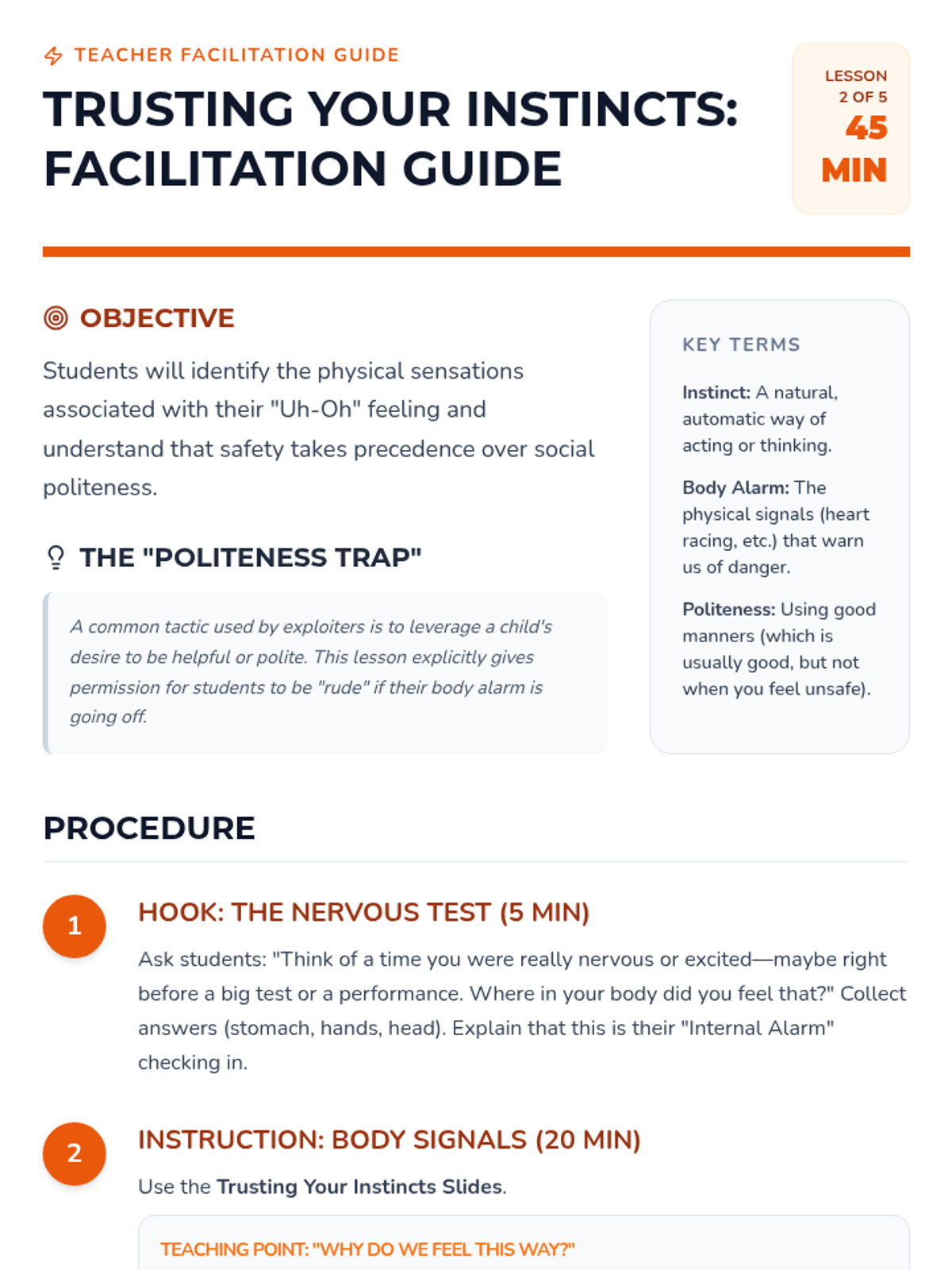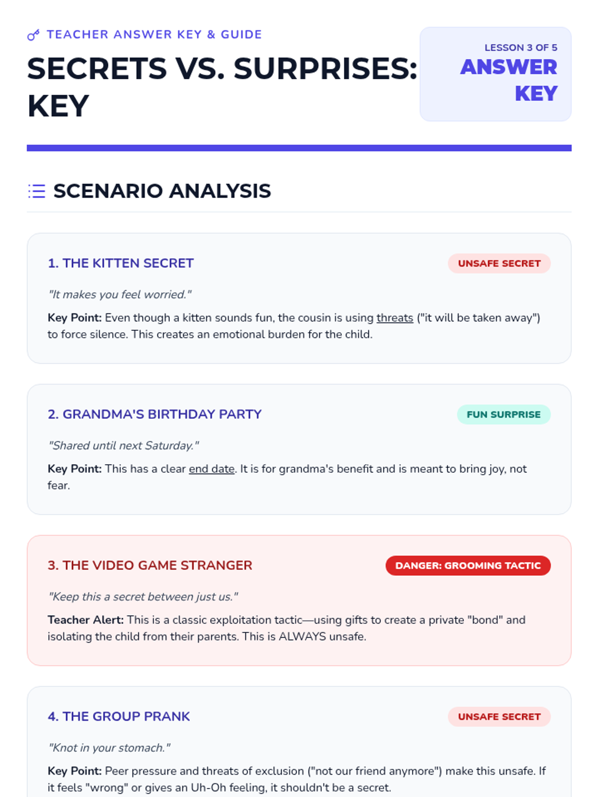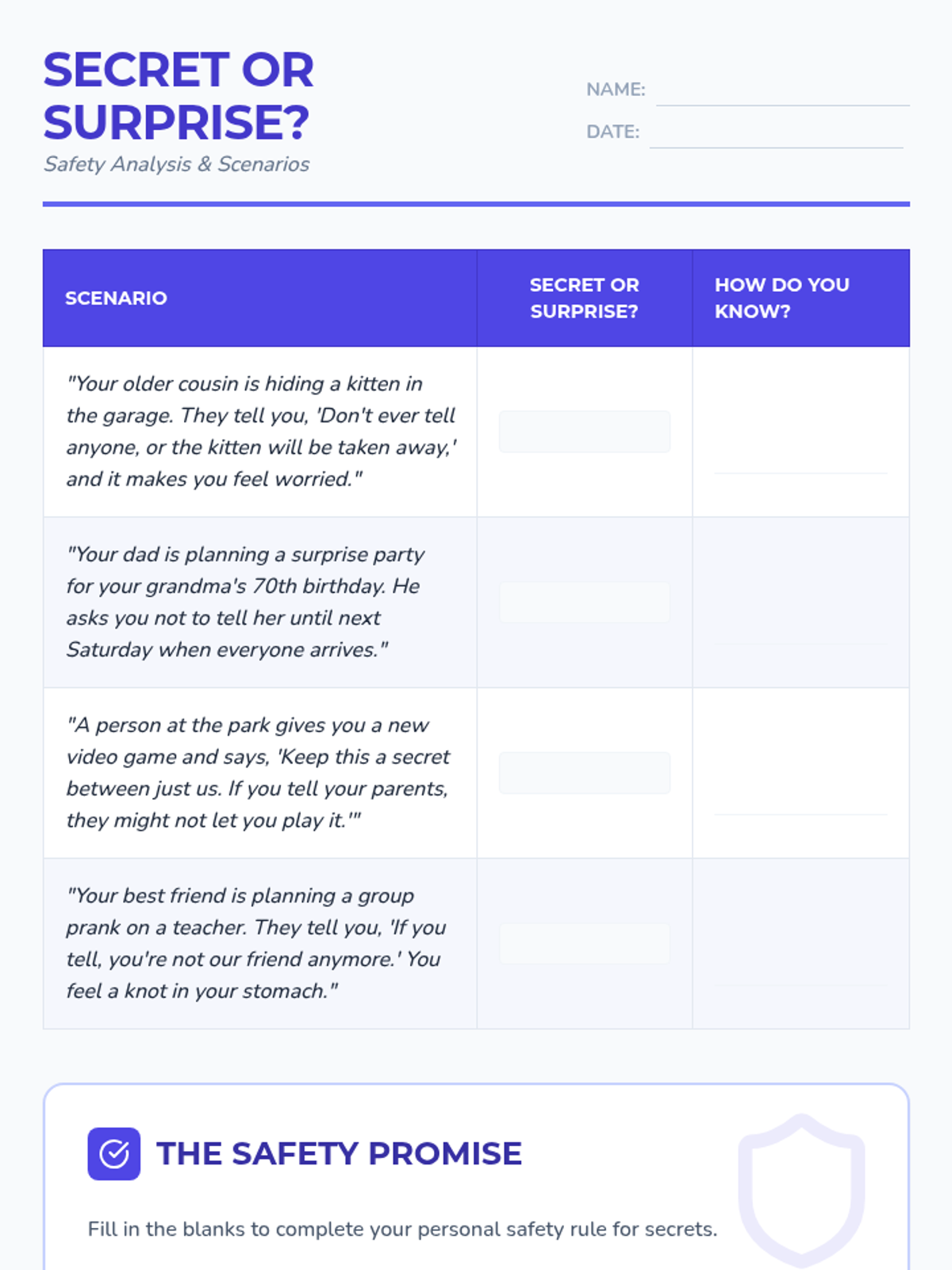 This sequence equips 5th-grade students with foundational safety skills, including defining personal boundaries, recognizing physiological 'Uh-Oh' feelings, distinguishing between secrets and surprises, and developing assertive refusal techniques. By identifying a network of trusted adults, students build the confidence to advocate for their own physical and emotional well-being.