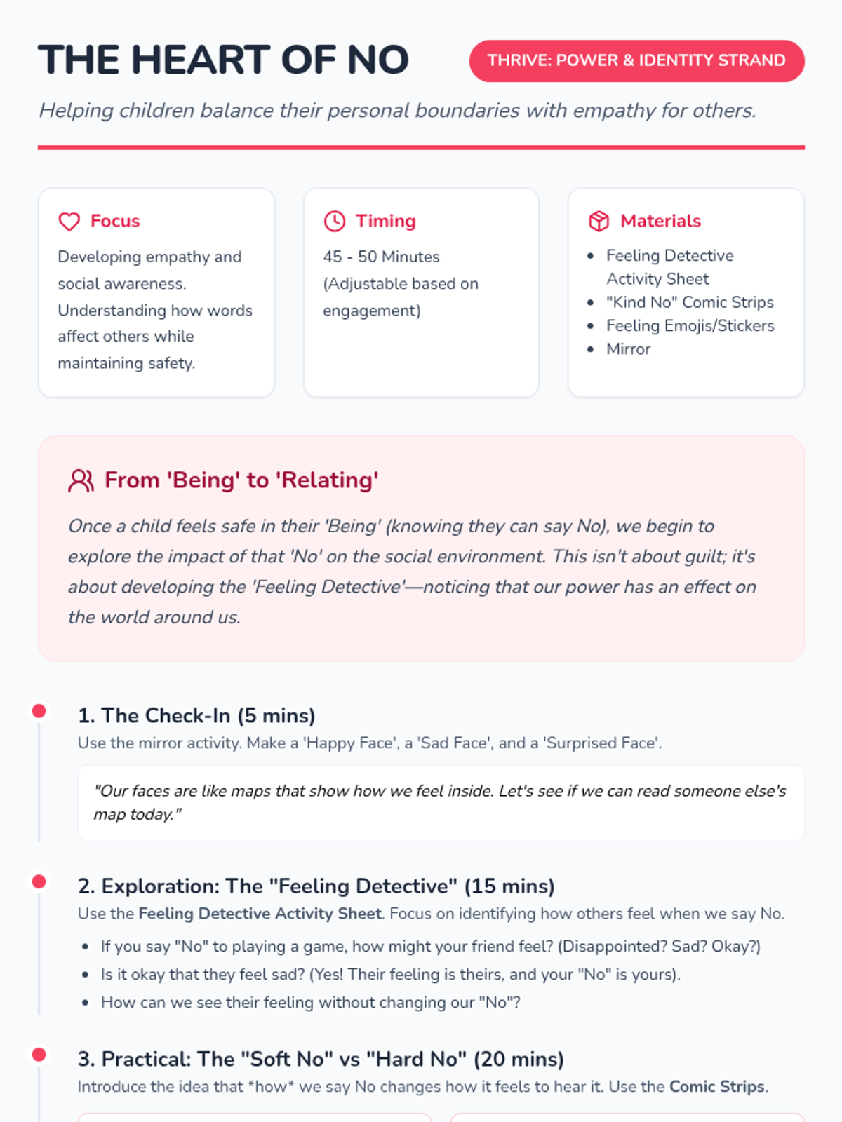 A therapeutic series of lessons designed to help children build healthy boundaries and social awareness, moving from self-assertion to understanding social impact and empathy.