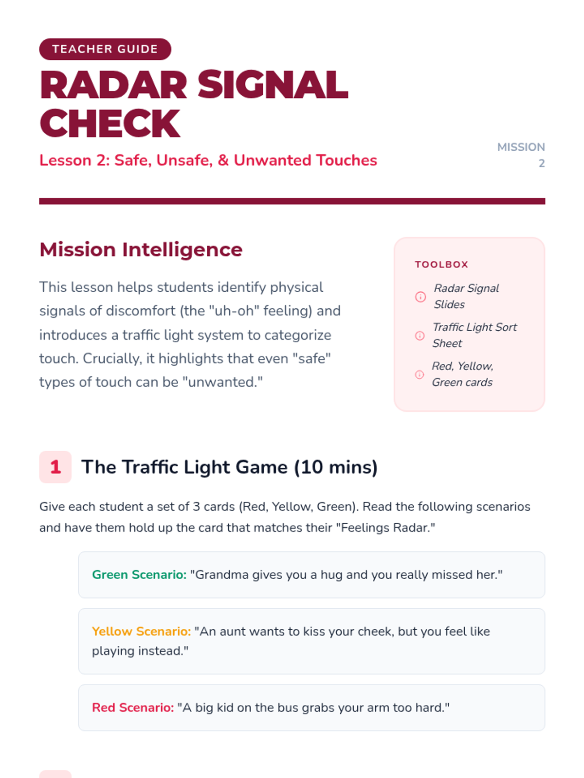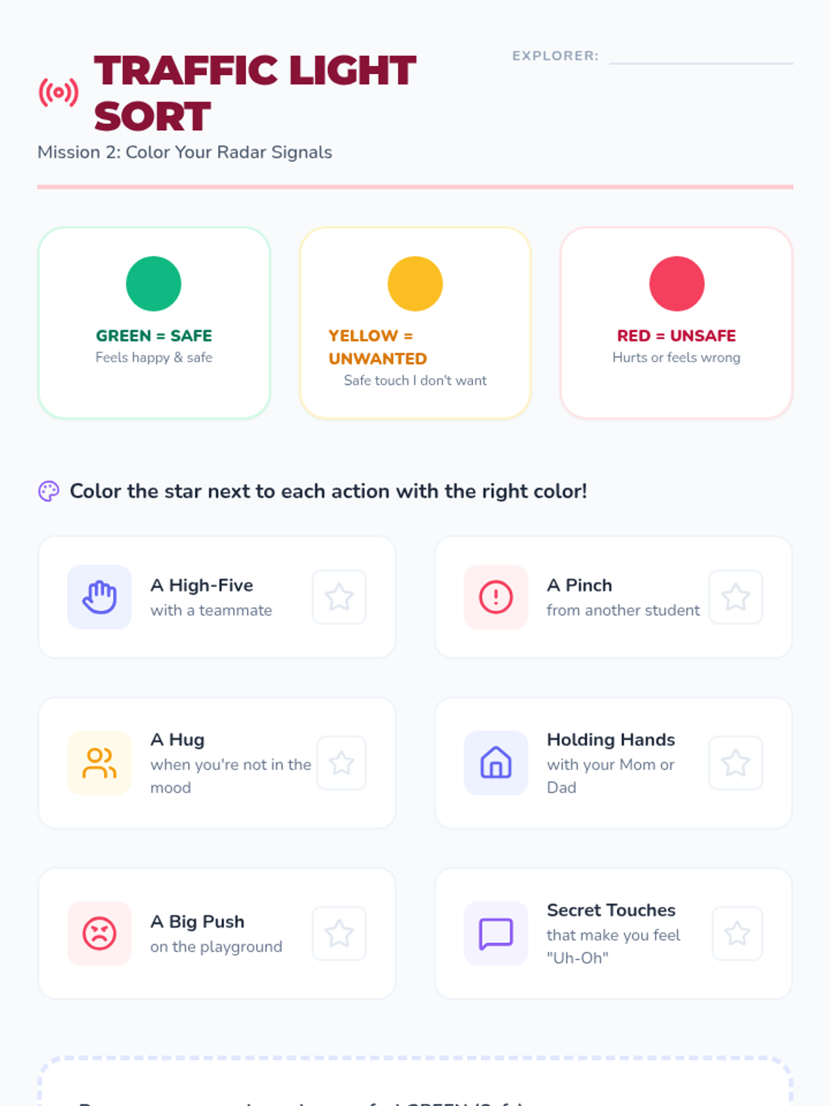 A comprehensive 5-lesson unit for 1st-grade students focused on personal bodily autonomy, emotional safety, and support networks using a friendly space explorer theme.