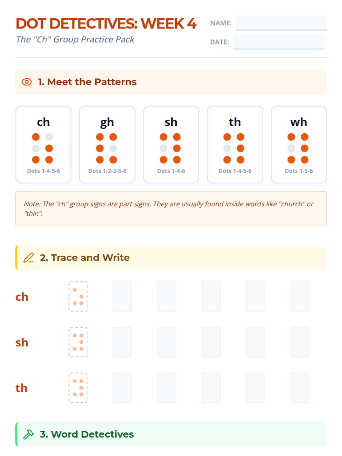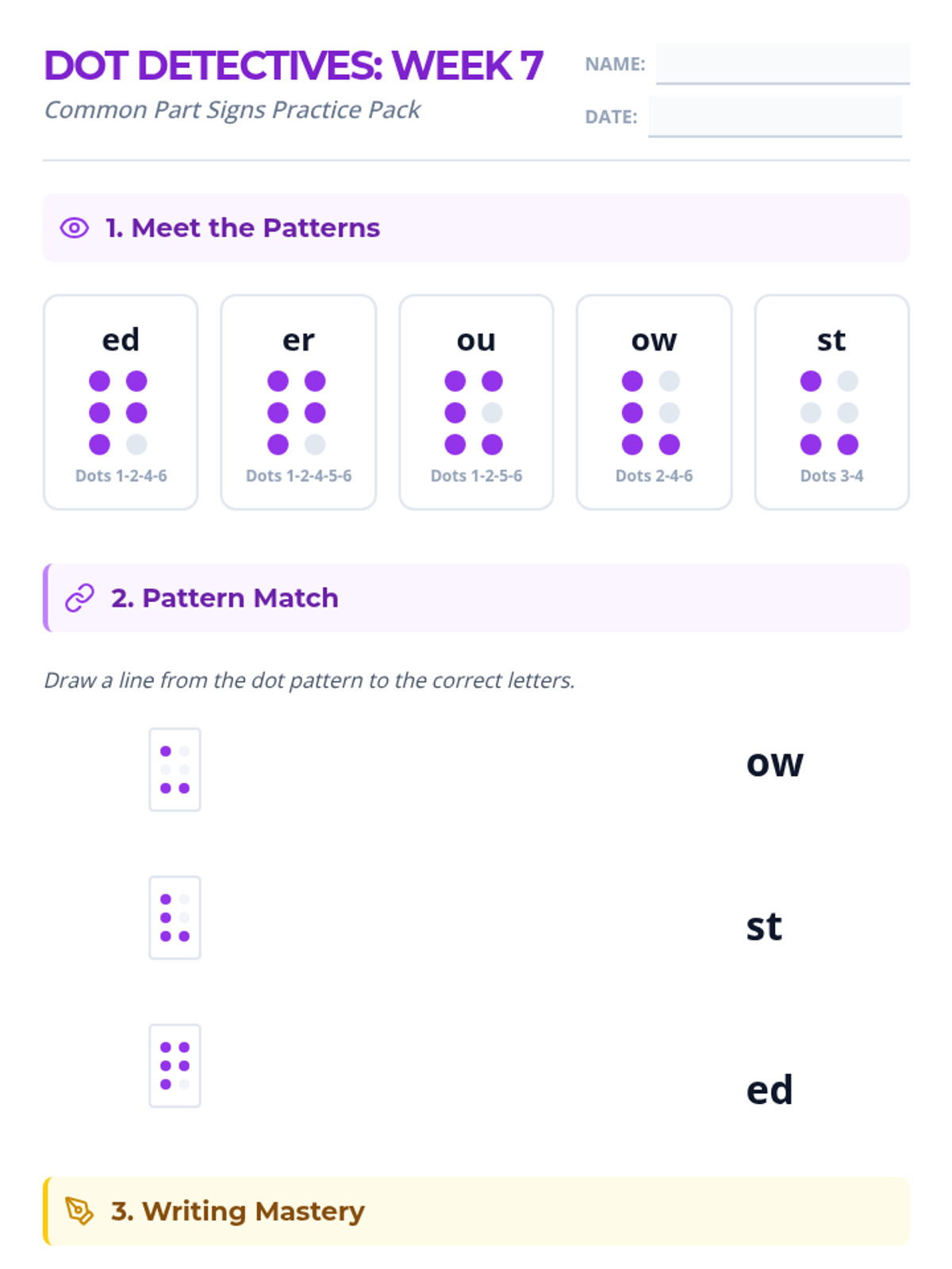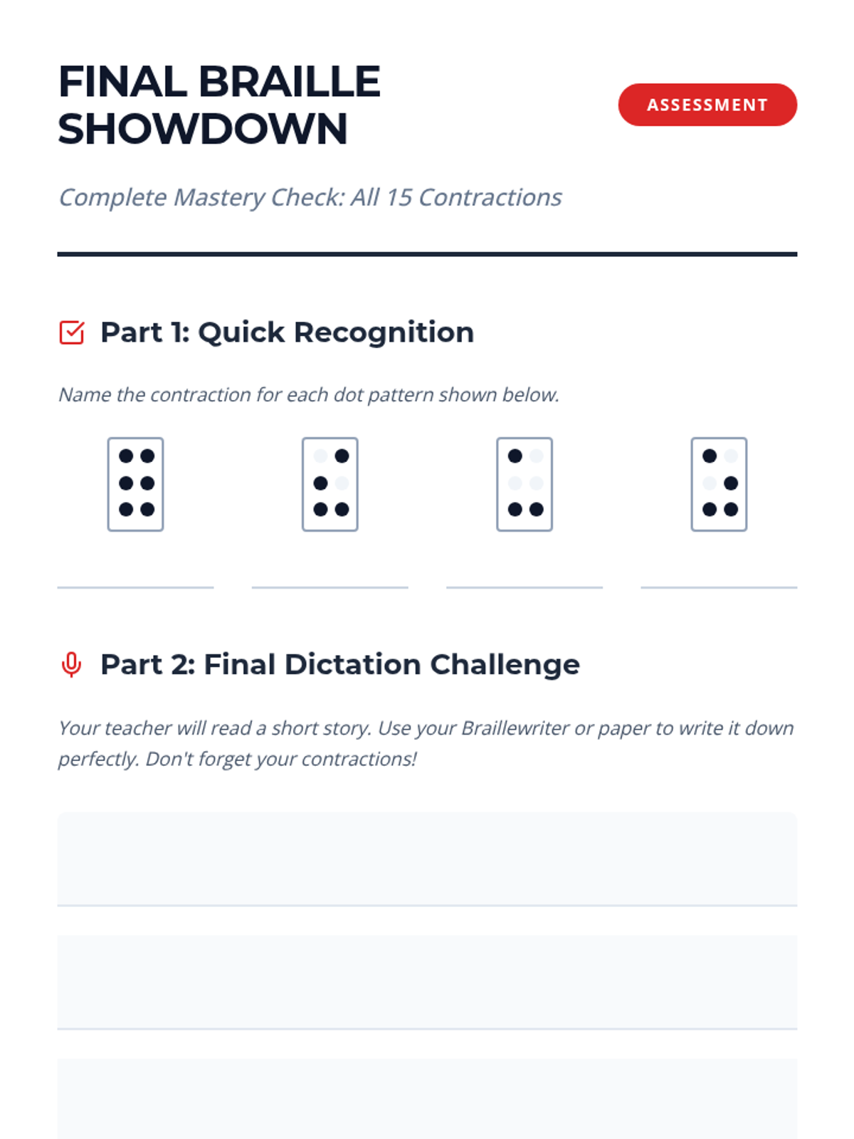 A comprehensive 9-week instructional sequence designed for students with Blind and Low Vision needs, focusing on mastery of common Braille contractions through repetitive practice, tracing, and dictation.
