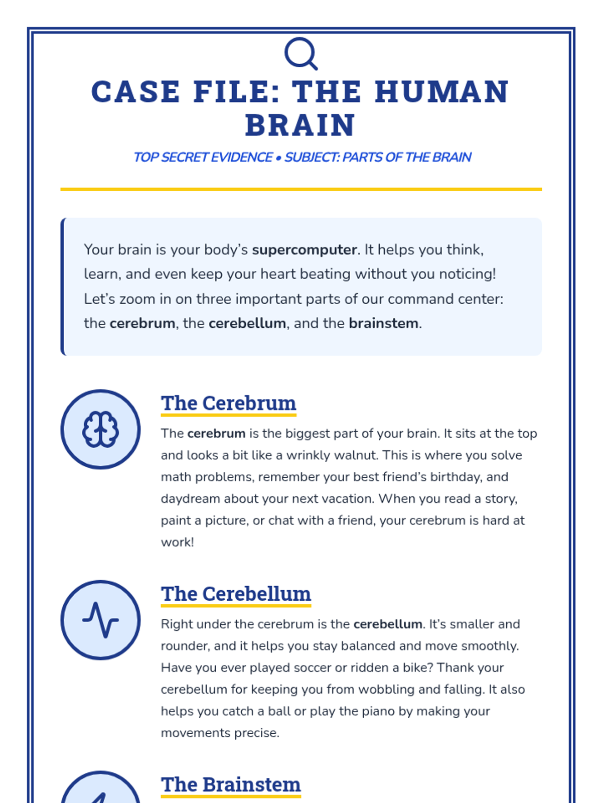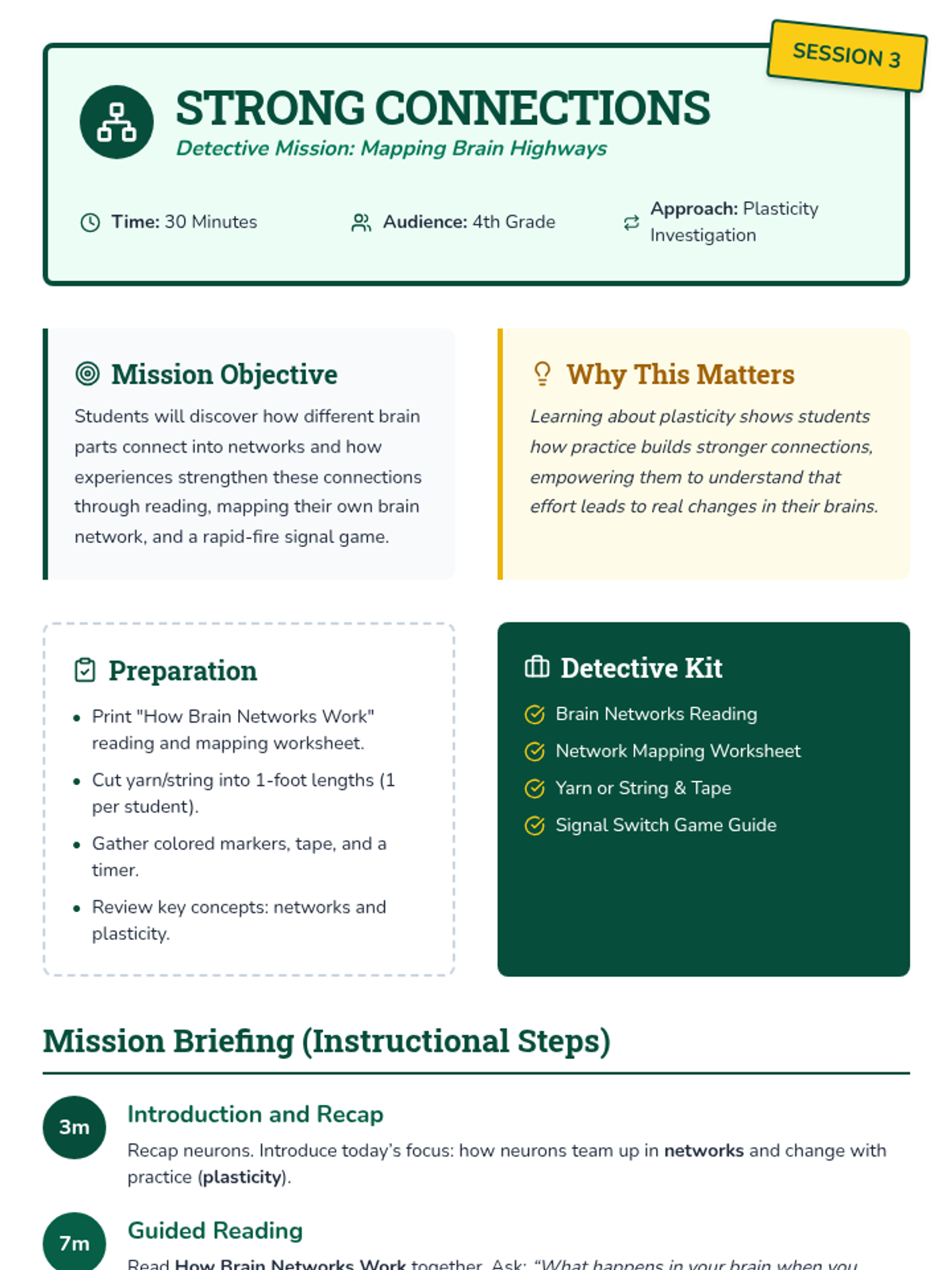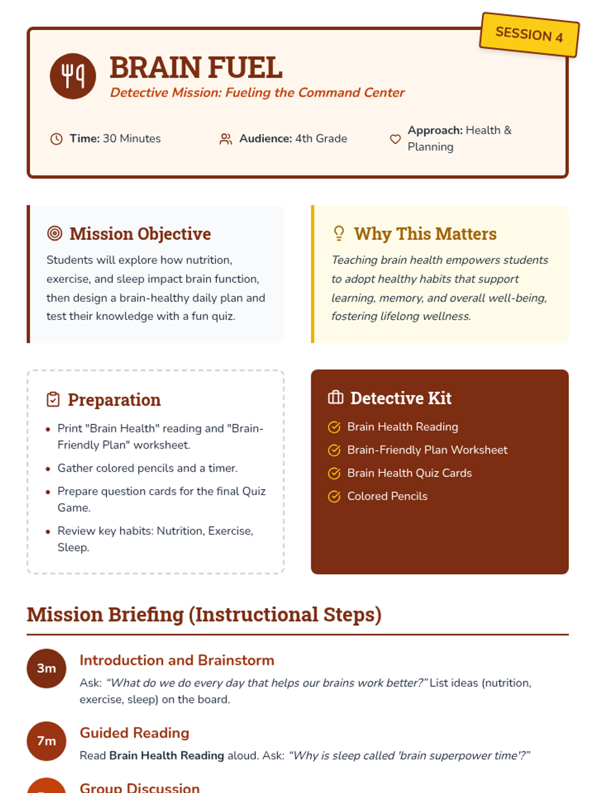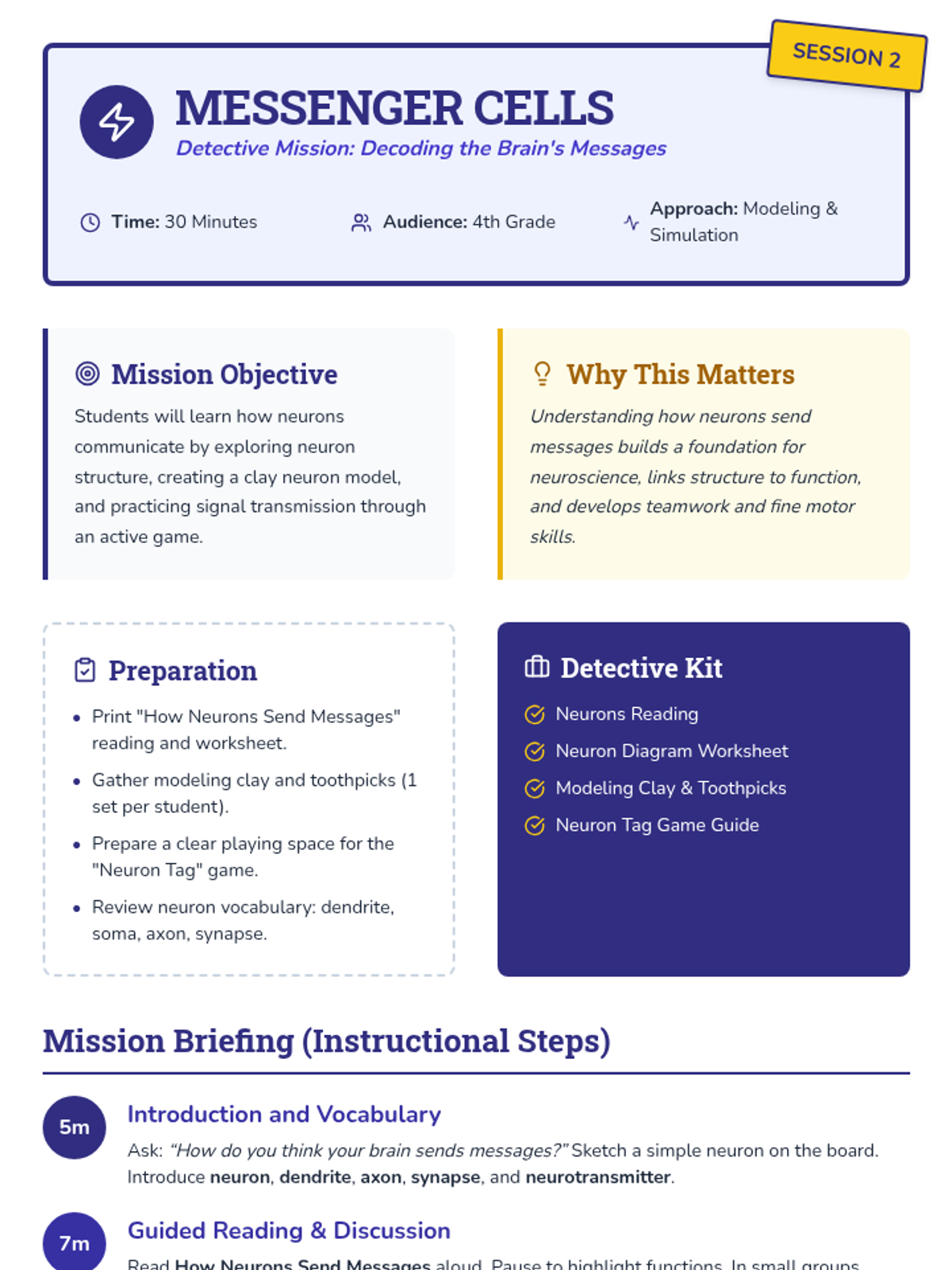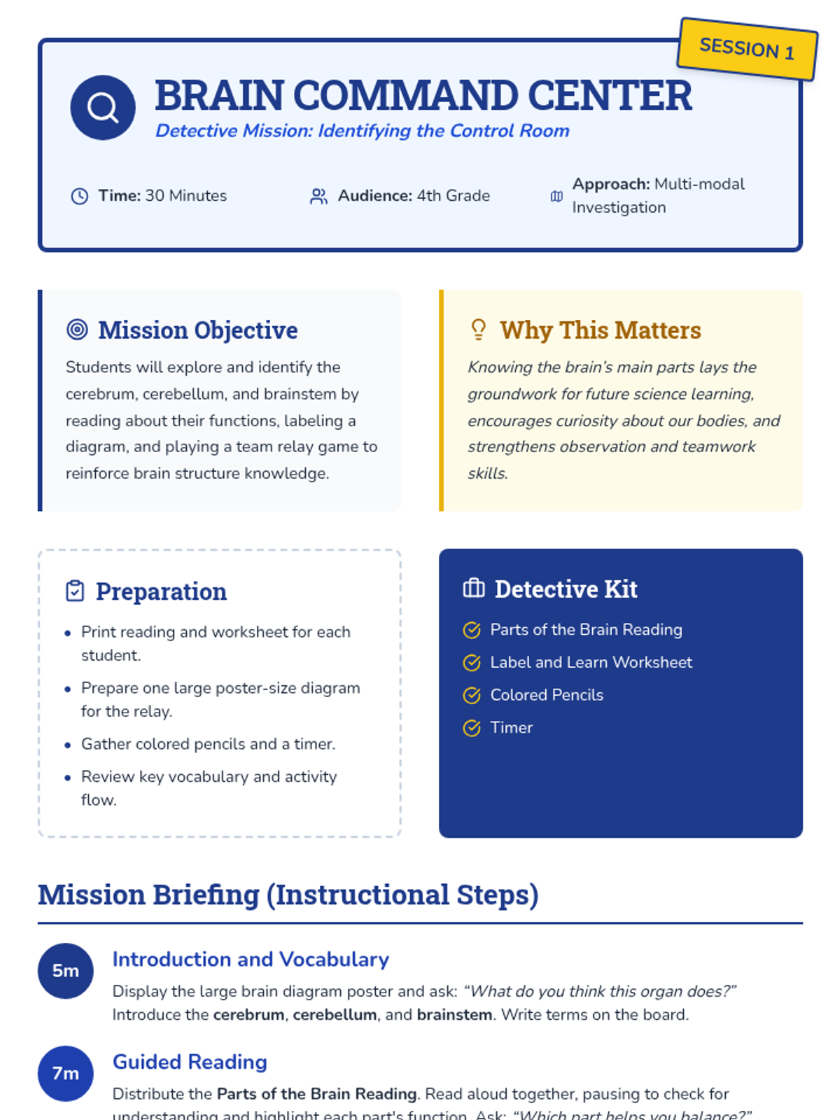 A four-session journey into the human mind for 4th graders, exploring brain anatomy, neurons, neural plasticity, and healthy brain habits through hands-on detective-themed activities.