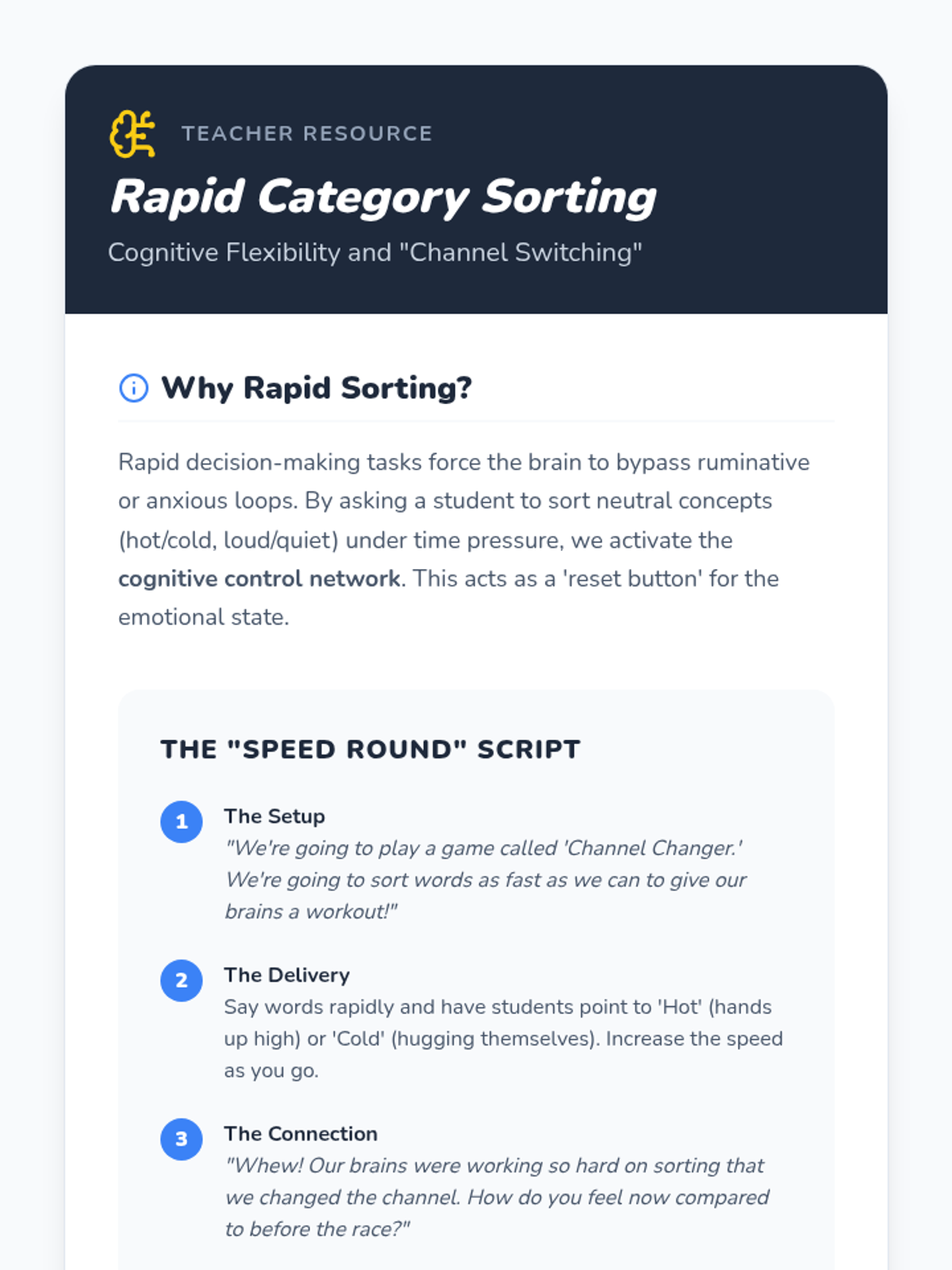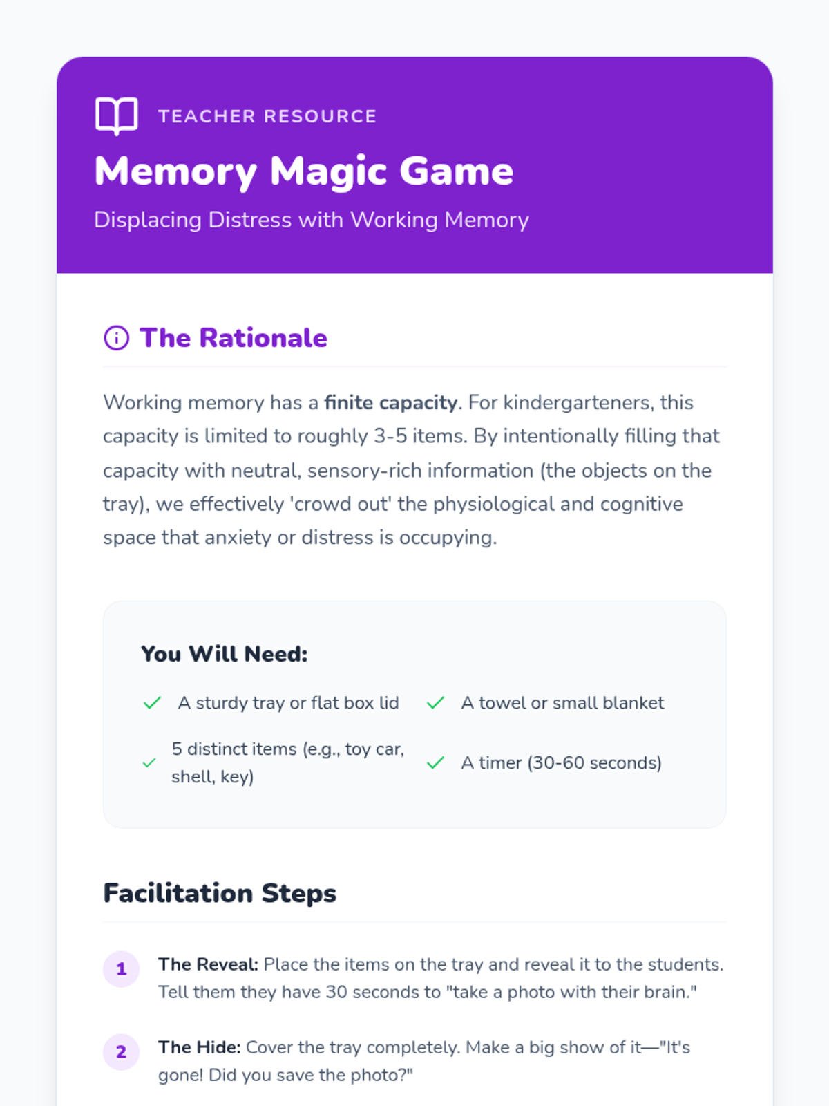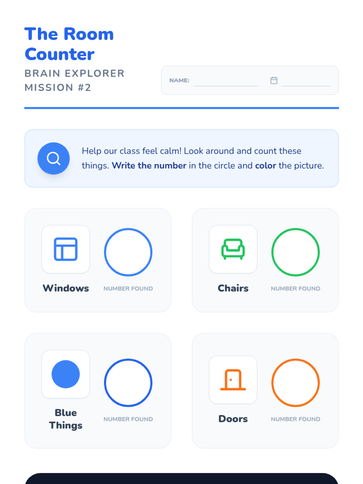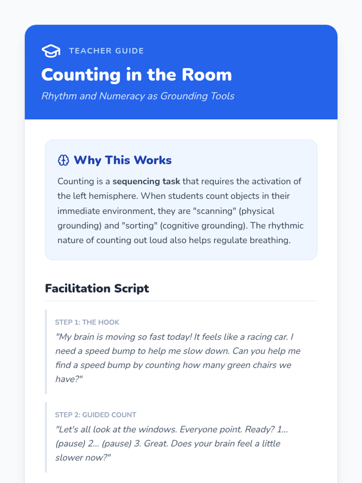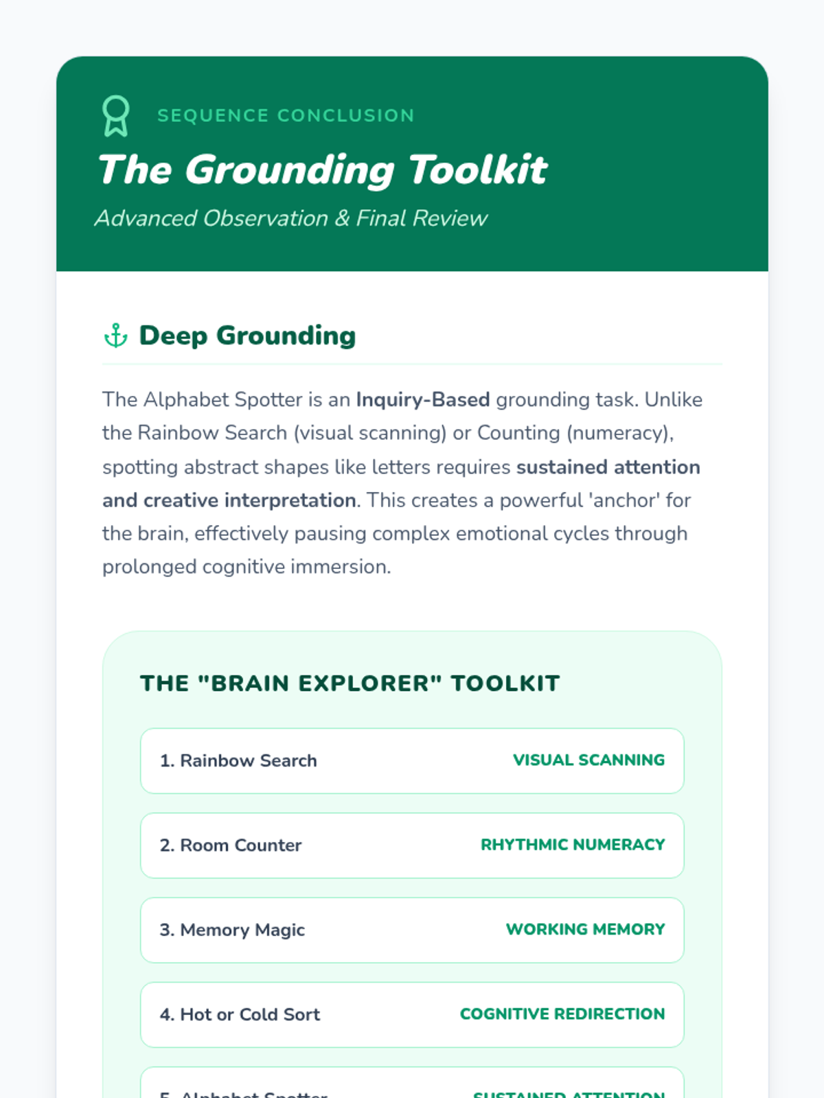 A Kindergarten sequence utilizing game-based pedagogy to teach cognitive distraction and grounding techniques. Students learn to shift their focus from emotional distress to mental challenges and environmental observation.