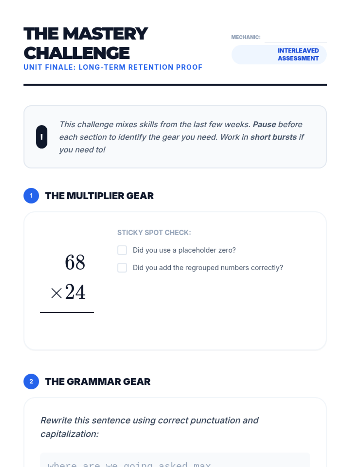 A sequence focused on teaching 5th-grade students with academic support needs how to apply spaced repetition and interleaving strategies to master complex procedural skills like multi-step math and grammar. Students learn to diagnose errors, manage practice intervals, and mix problem types to build long-term retention.