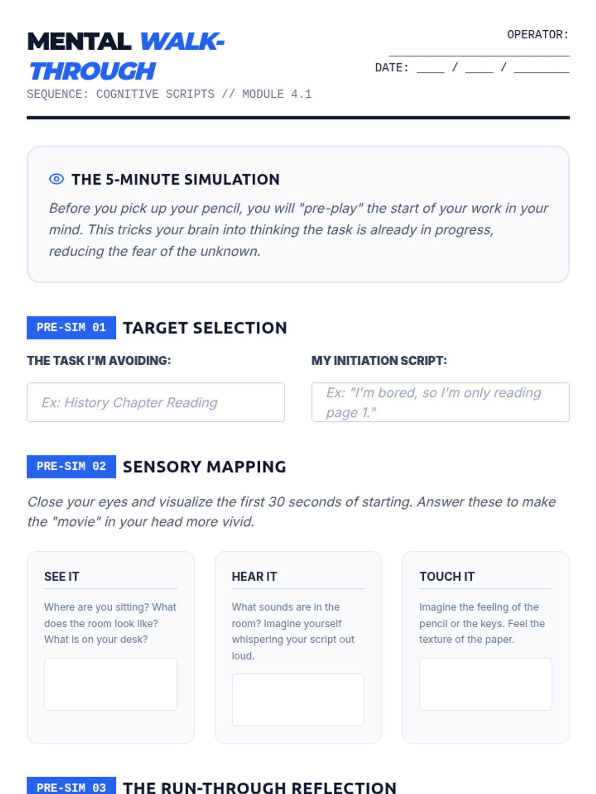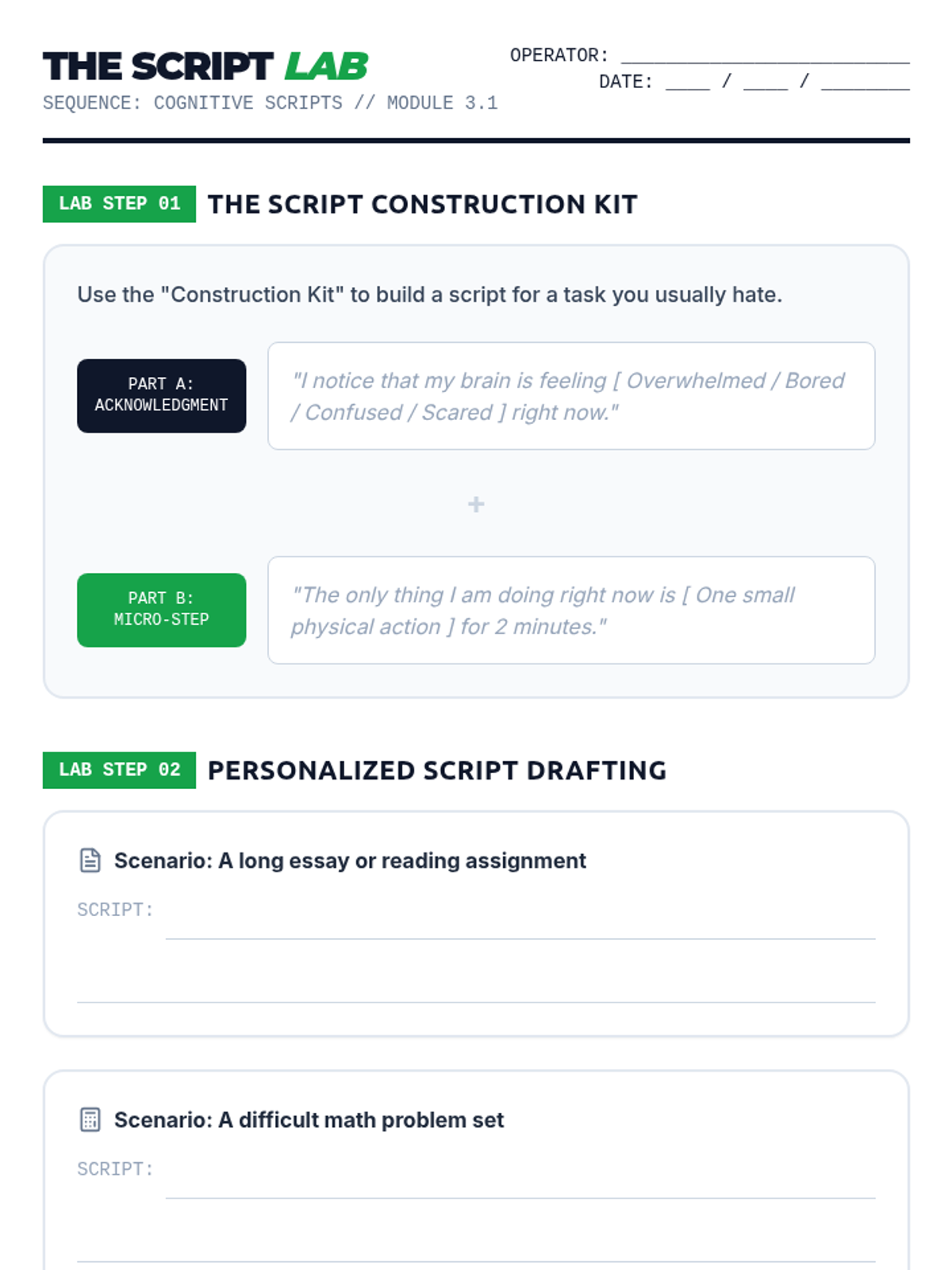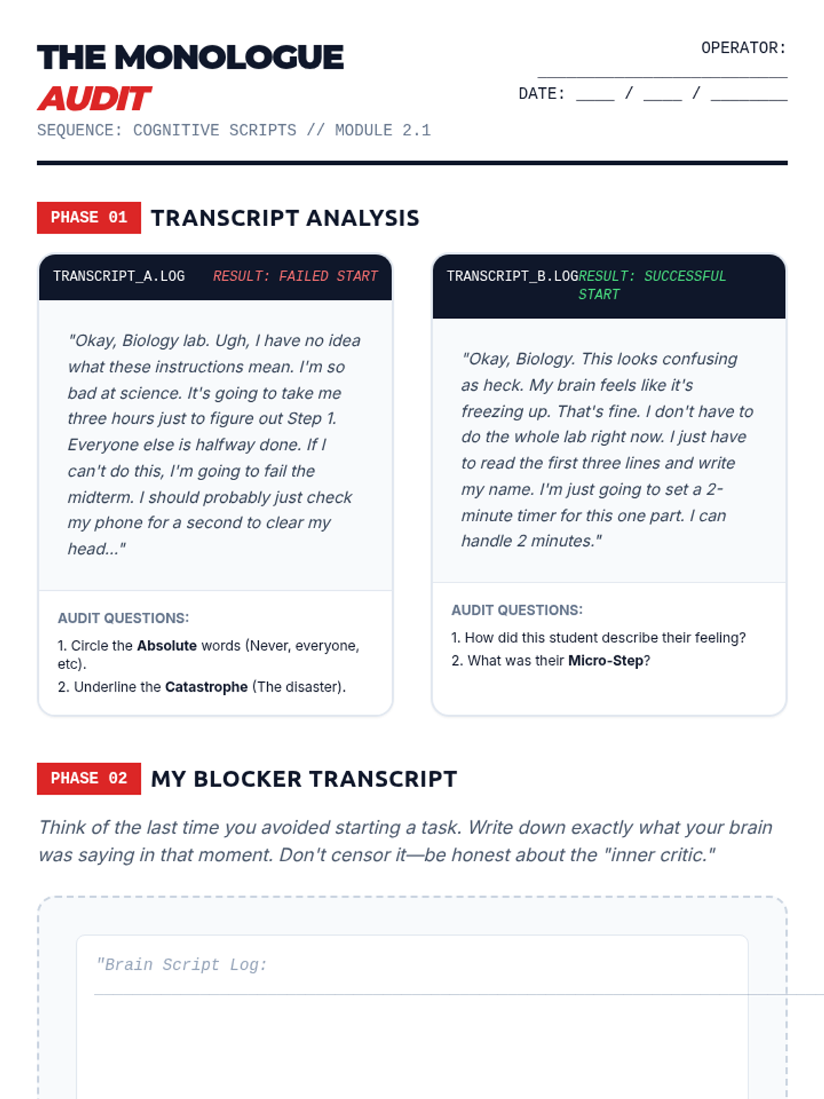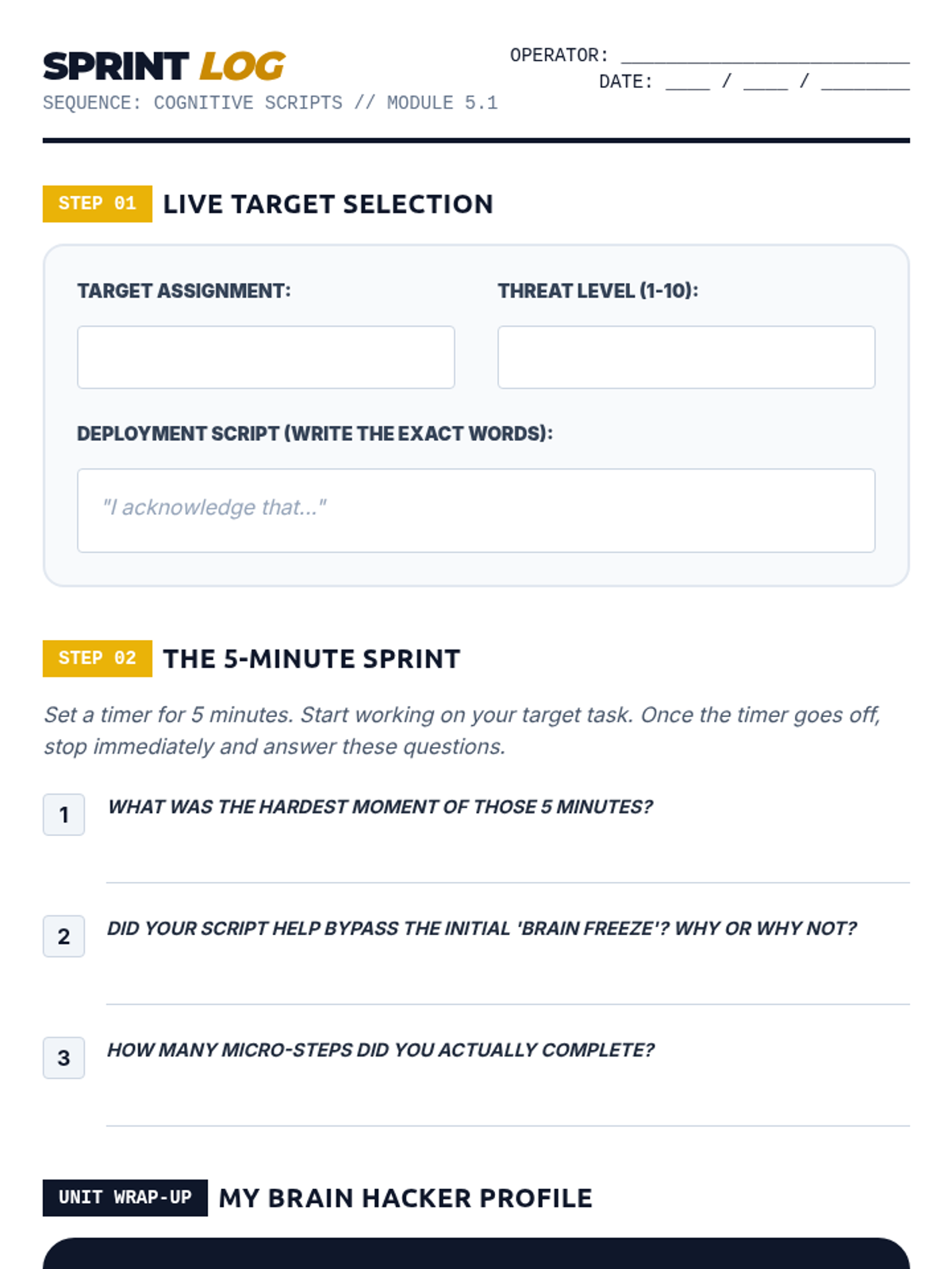 A 5-lesson sequence for 9th-grade students focusing on the neuroscience of task initiation and the development of self-talk 'scripts' to overcome academic procrastination and 'brain blocks'.
